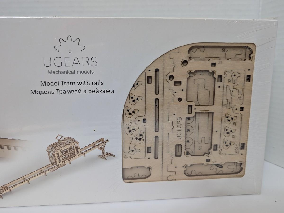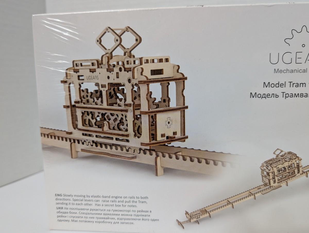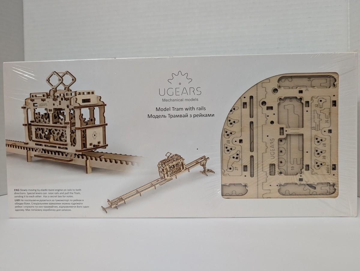 UGEARS, mechanical model kit, wooden tram puzzle, DIY 3D puzzle, model tram with rails, collectible model kit, wooden engineering model, adult puzzle, hobby model, STEM building kit, mechanical wooden toy