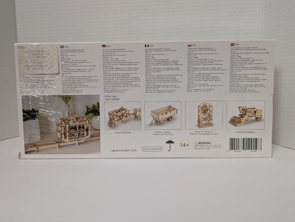 UGEARS mechanical model kit featuring a wooden tram with rails. This DIY 3D puzzle includes 154 precision-cut parts made from high-quality wood, designed to be assembled without glue. The tram moves on rails using an elastic-band engine and features levers to control movement in both directions. A collectible model perfect for hobbyists, puzzle enthusiasts, and fans of engineering-style builds. Recommended for ages 14 and up.