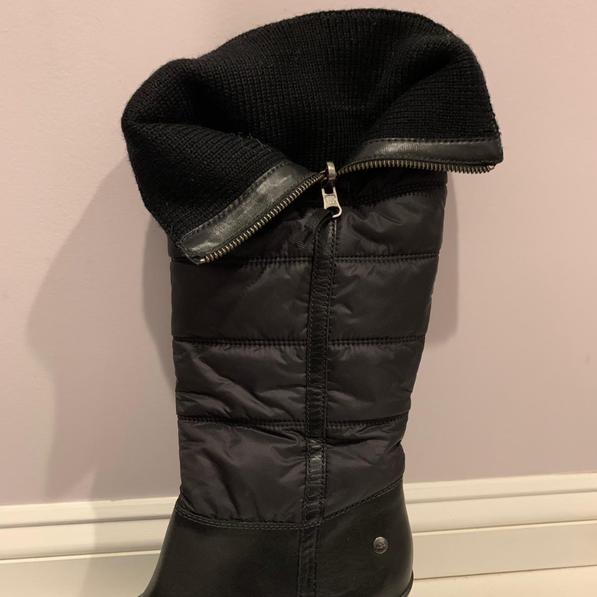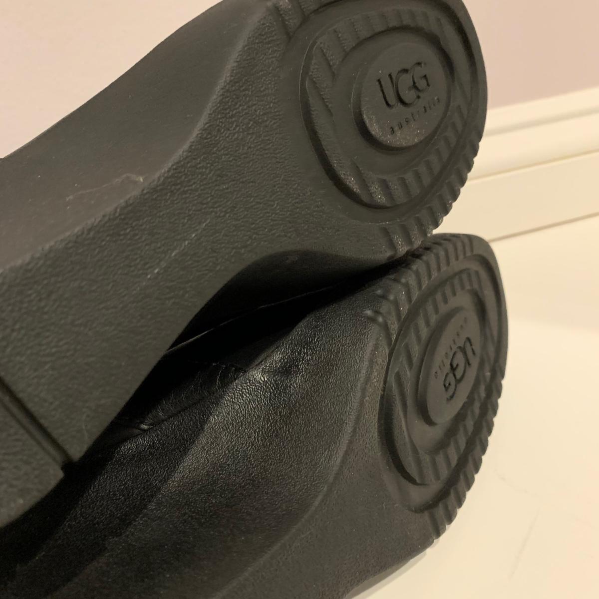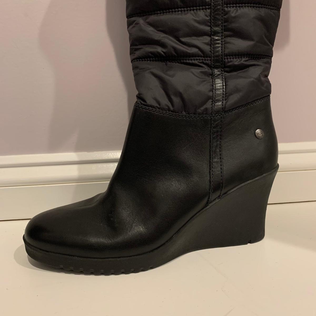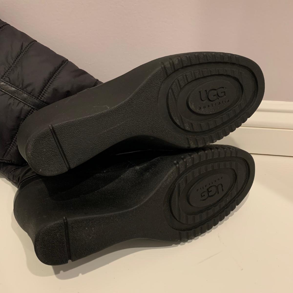 Pair of black UGG boots with 3.25” heels. Size 10. Appear to have been very gently worn, if worn at all.