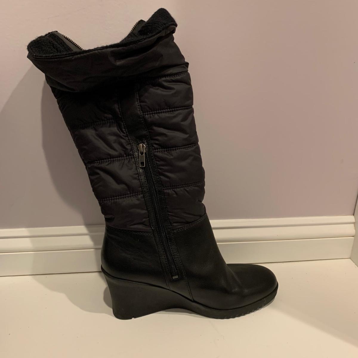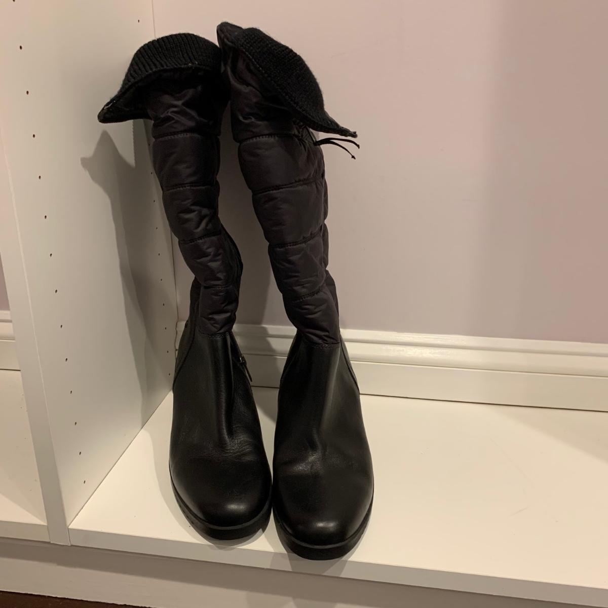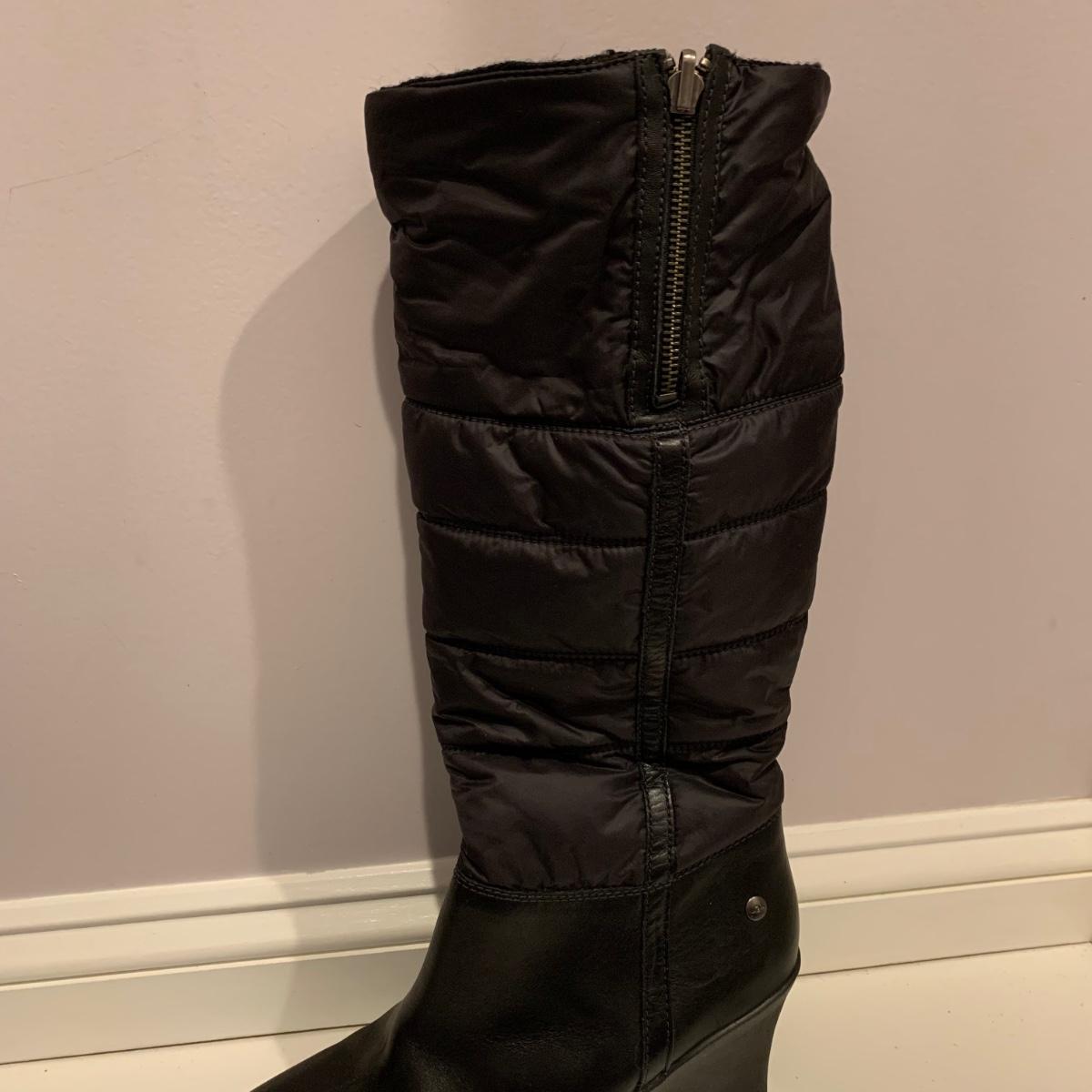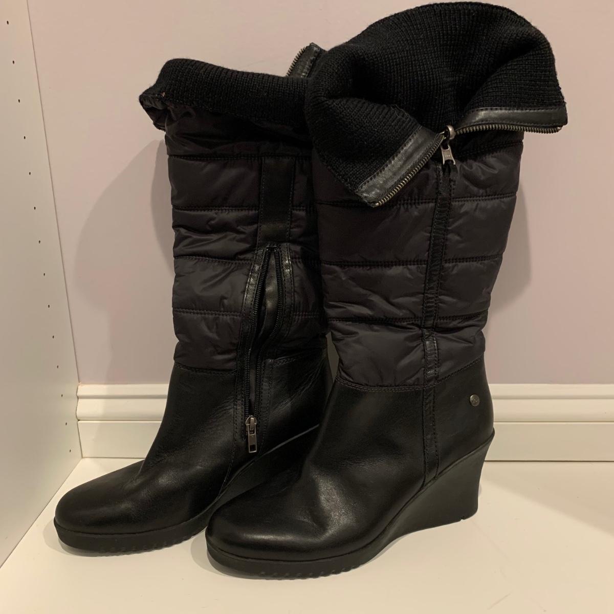 Pair of black UGG boots with 3.25” heels. Size 10. Appear to have been very gently worn, if worn at all.