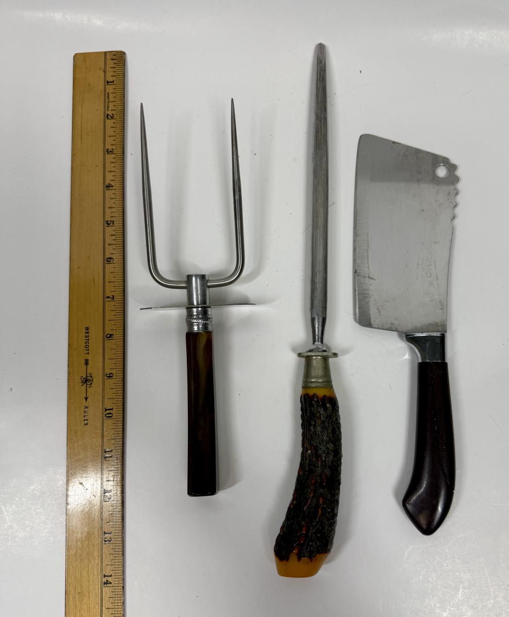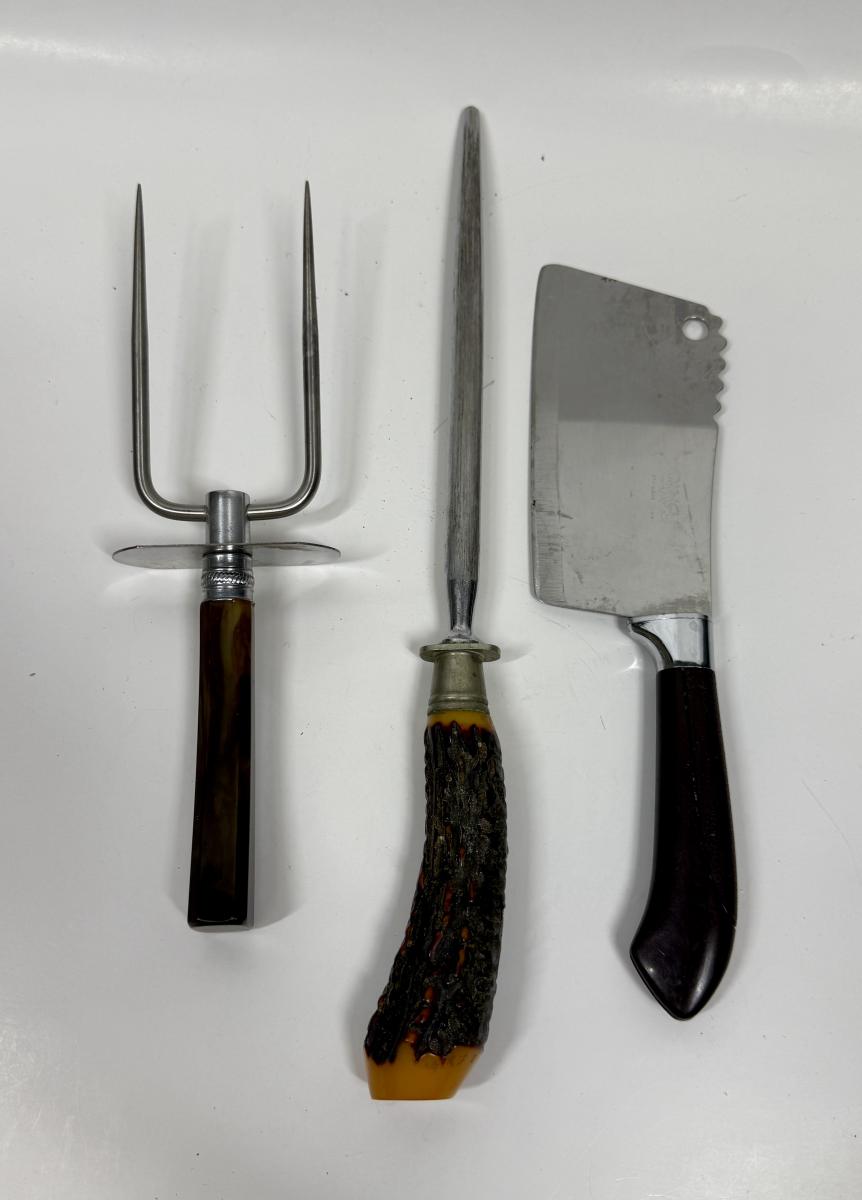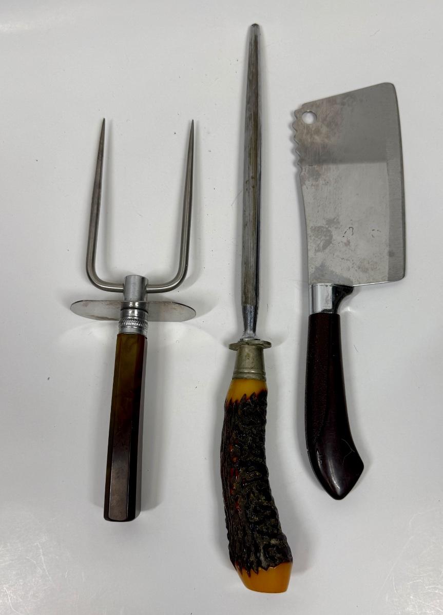 3 pc Lot - Vintage Kitchen Tools - tortoise shell handled fork, Faux Antler handled knife sharpener, Ginsu Cleaver