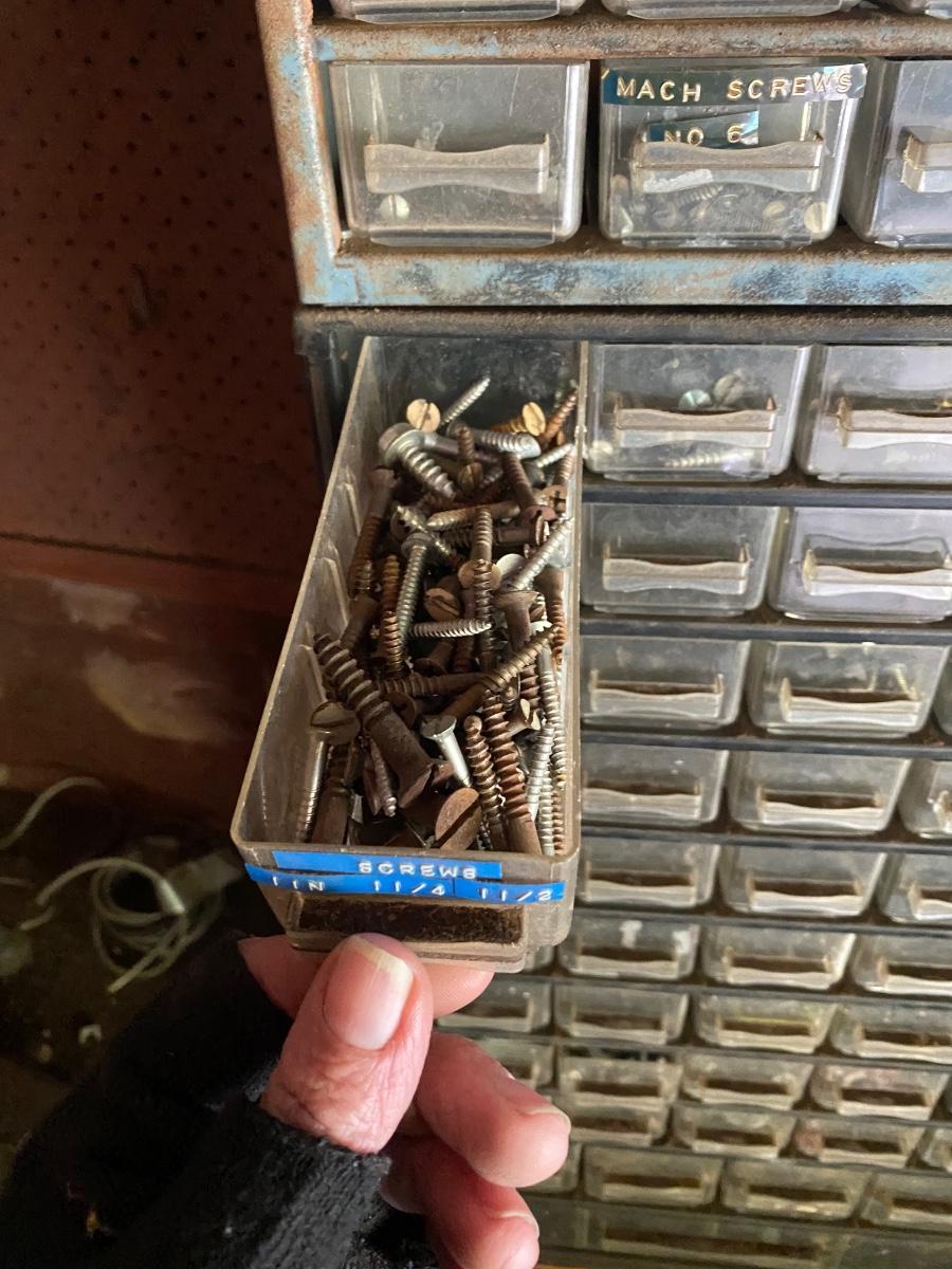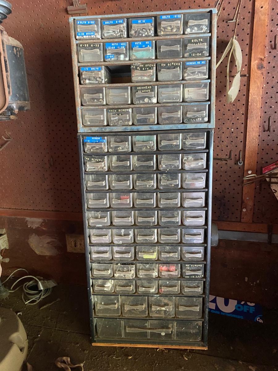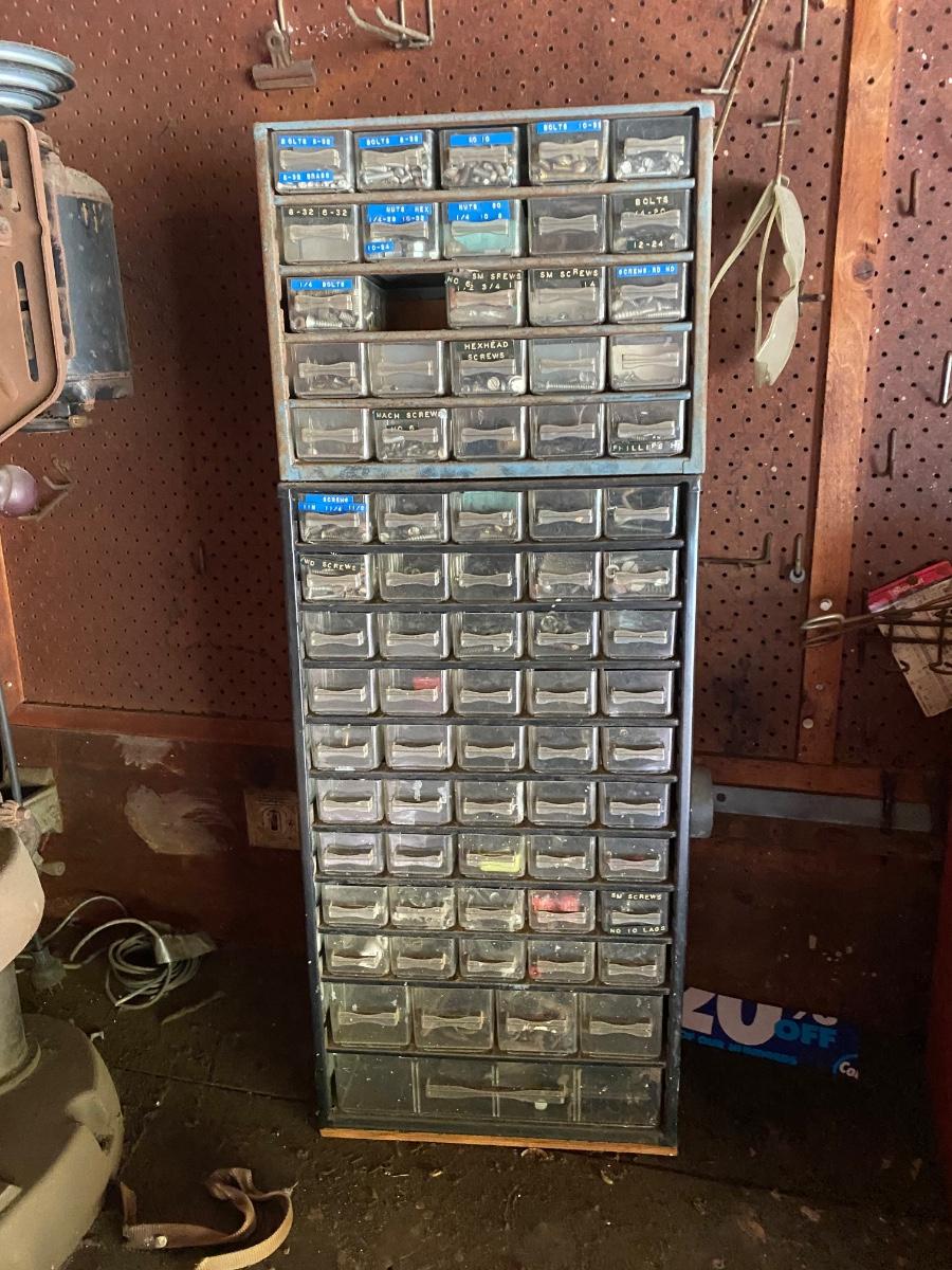 Plastic Multidrawer Organizer with Hardware. Not all drawers are filled. Two organizer caddies stacked together.