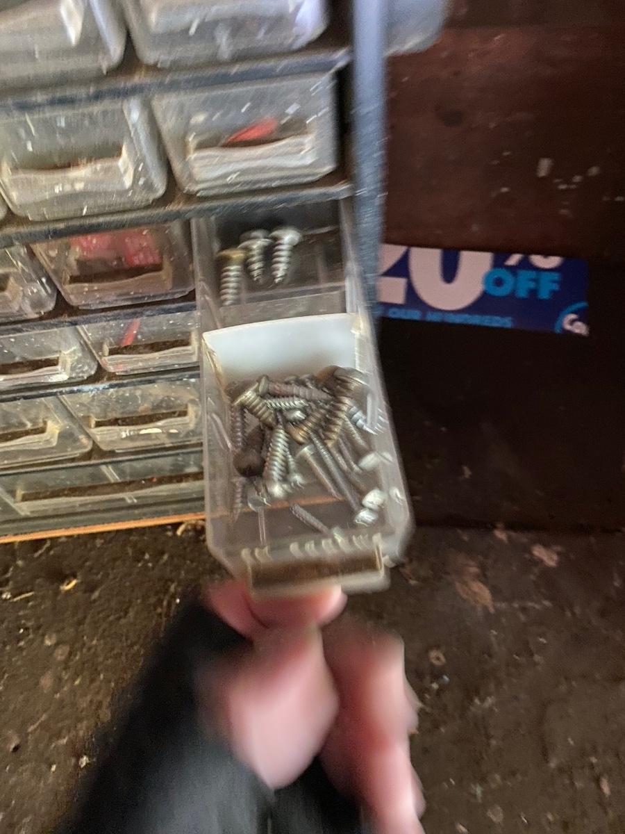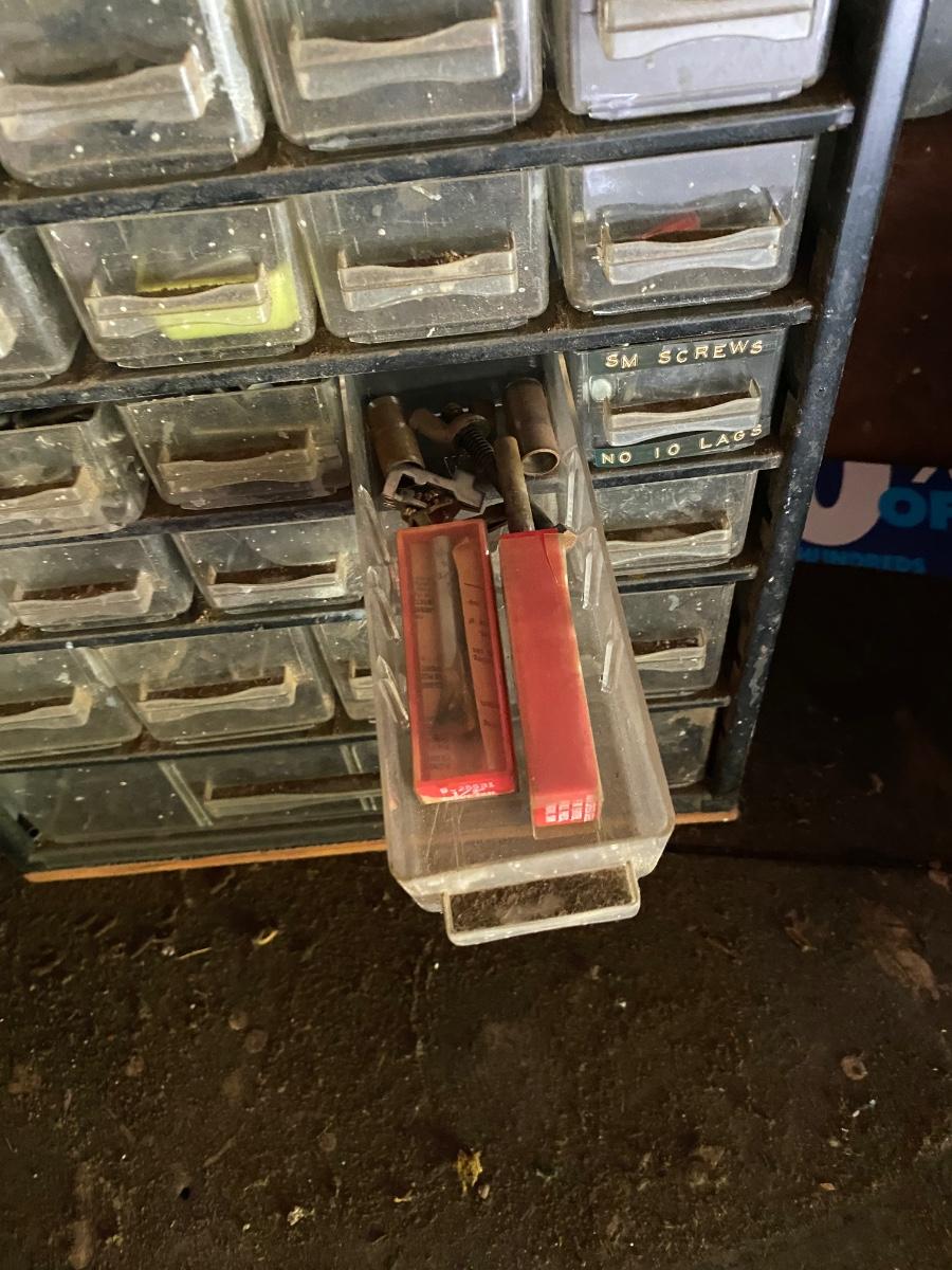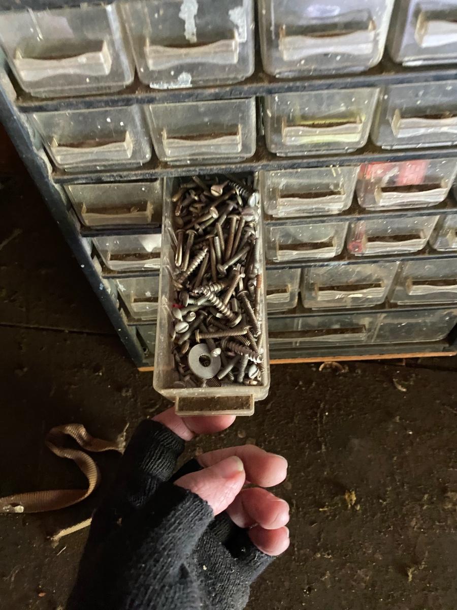 Plastic Multidrawer Organizer with Hardware. Not all drawers are filled. Two organizer caddies stacked together.