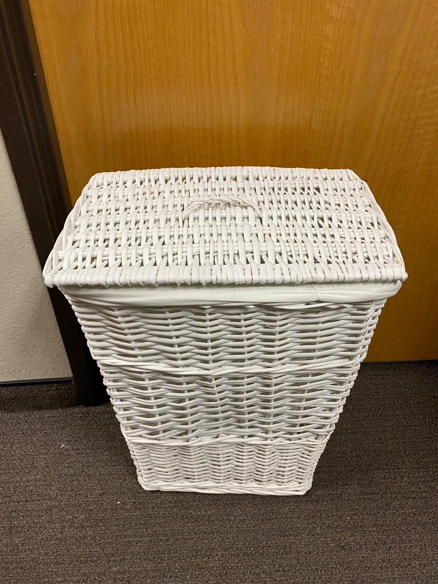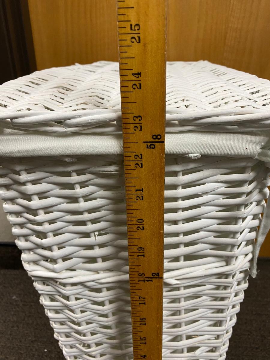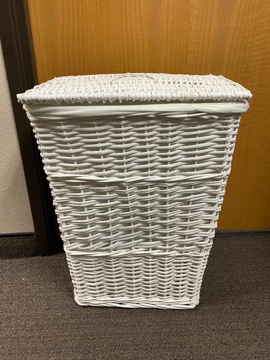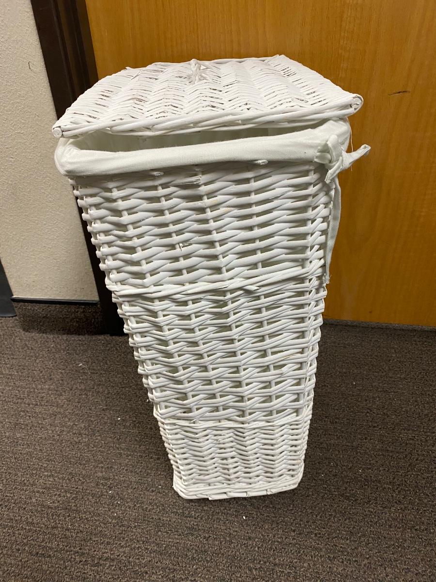 White Woven Wicker Laundry Basket Hamper with Liner and Removeable Lid. In good condition. Very little wear. Can be painted as desired easily. About 23" tall, 11"x17" opening.