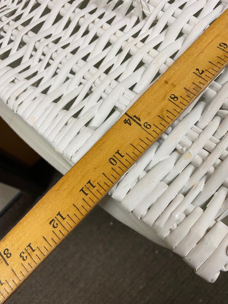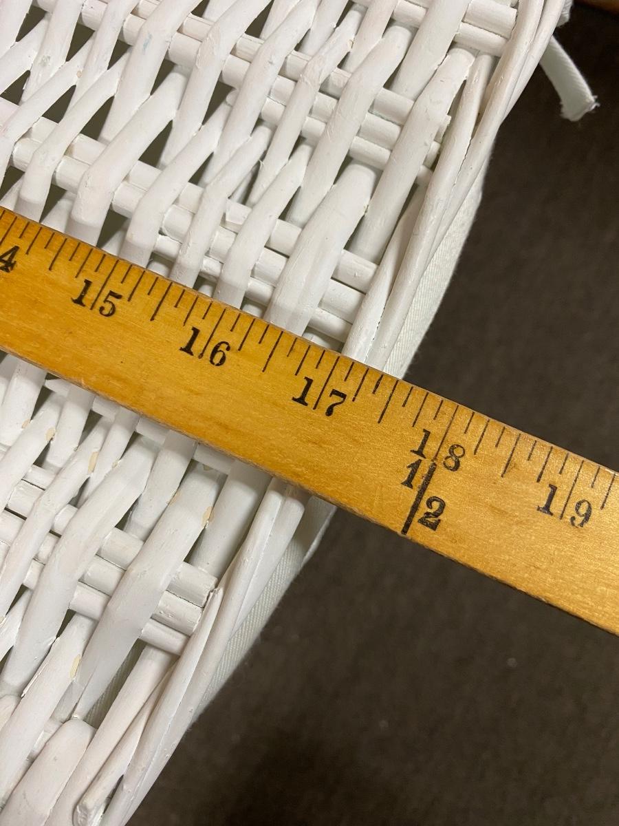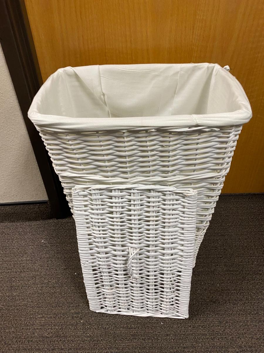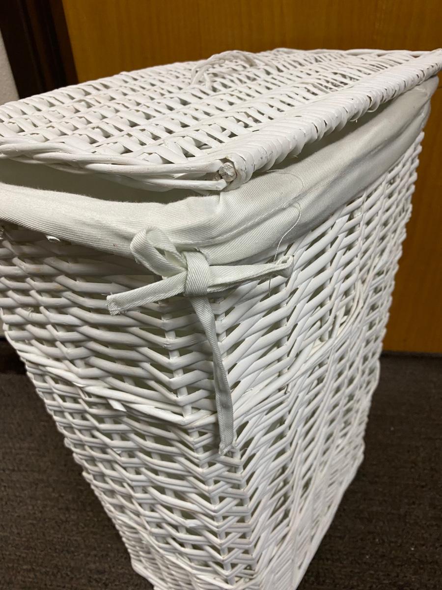 White Woven Wicker Laundry Basket Hamper with Liner and Removeable Lid. In good condition. Very little wear. Can be painted as desired easily. About 23" tall, 11"x17" opening.