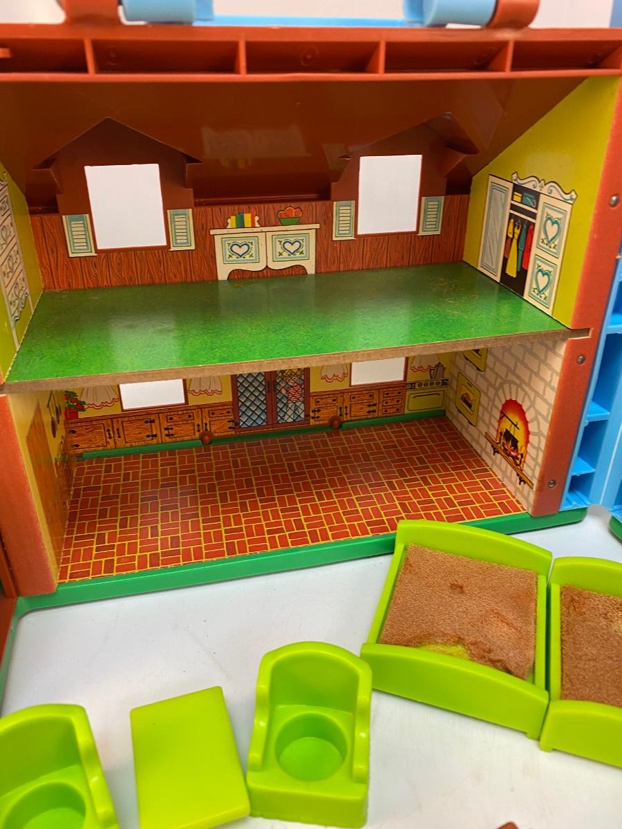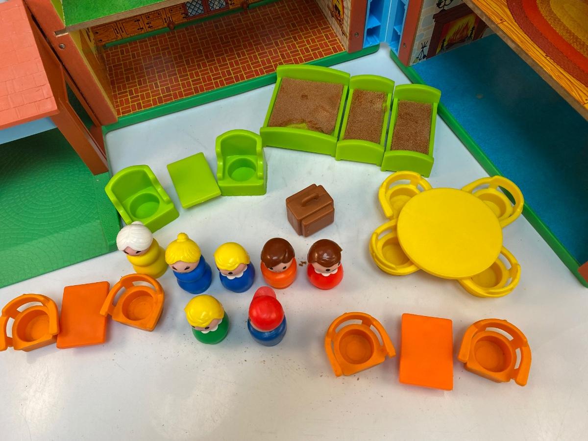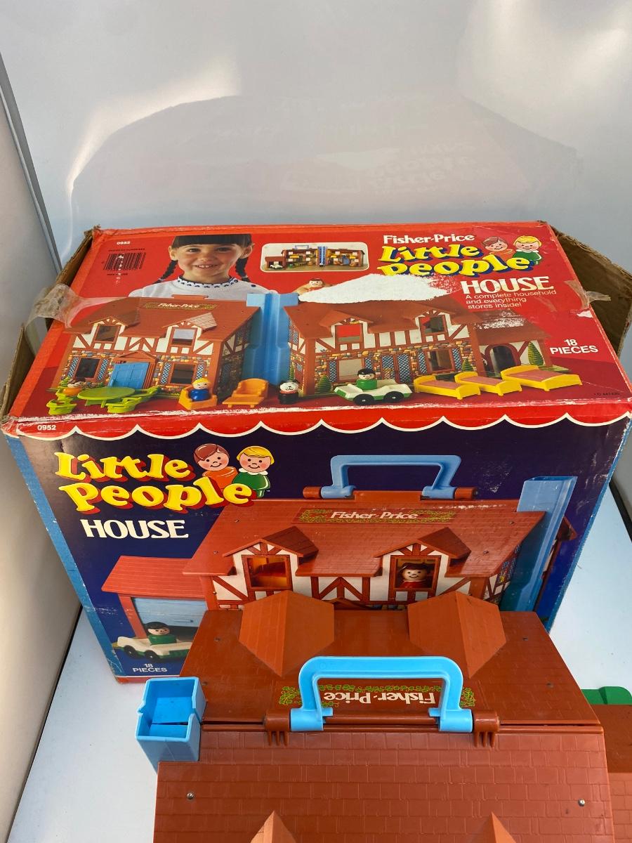 Retro Vintage Fisher Price Little People House with Accessories and Original Box. In good played with condition. Doesn't have all the original accessories that were included with the set but has some extras included. Box has wear. The foam on beds is starting to fall apart from age.