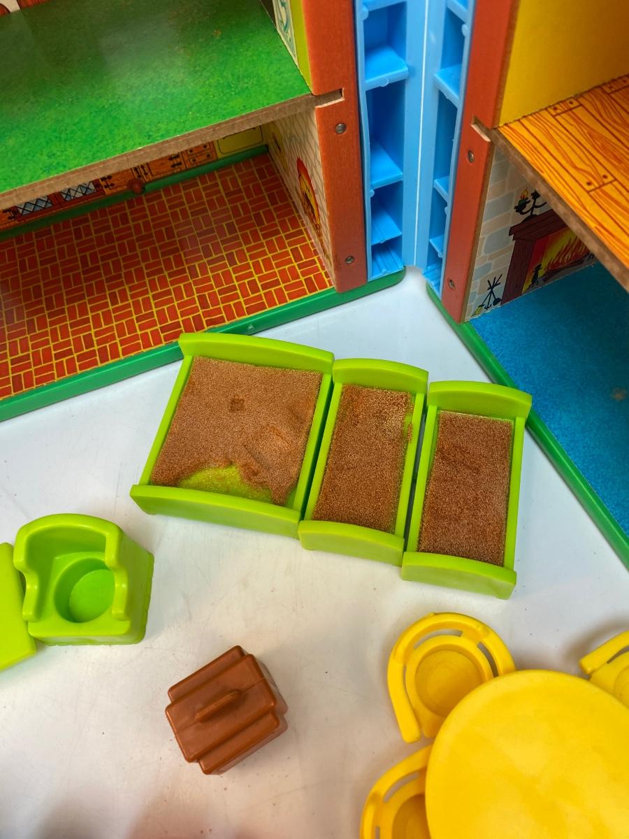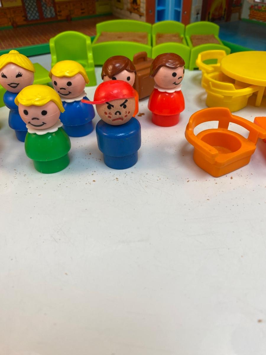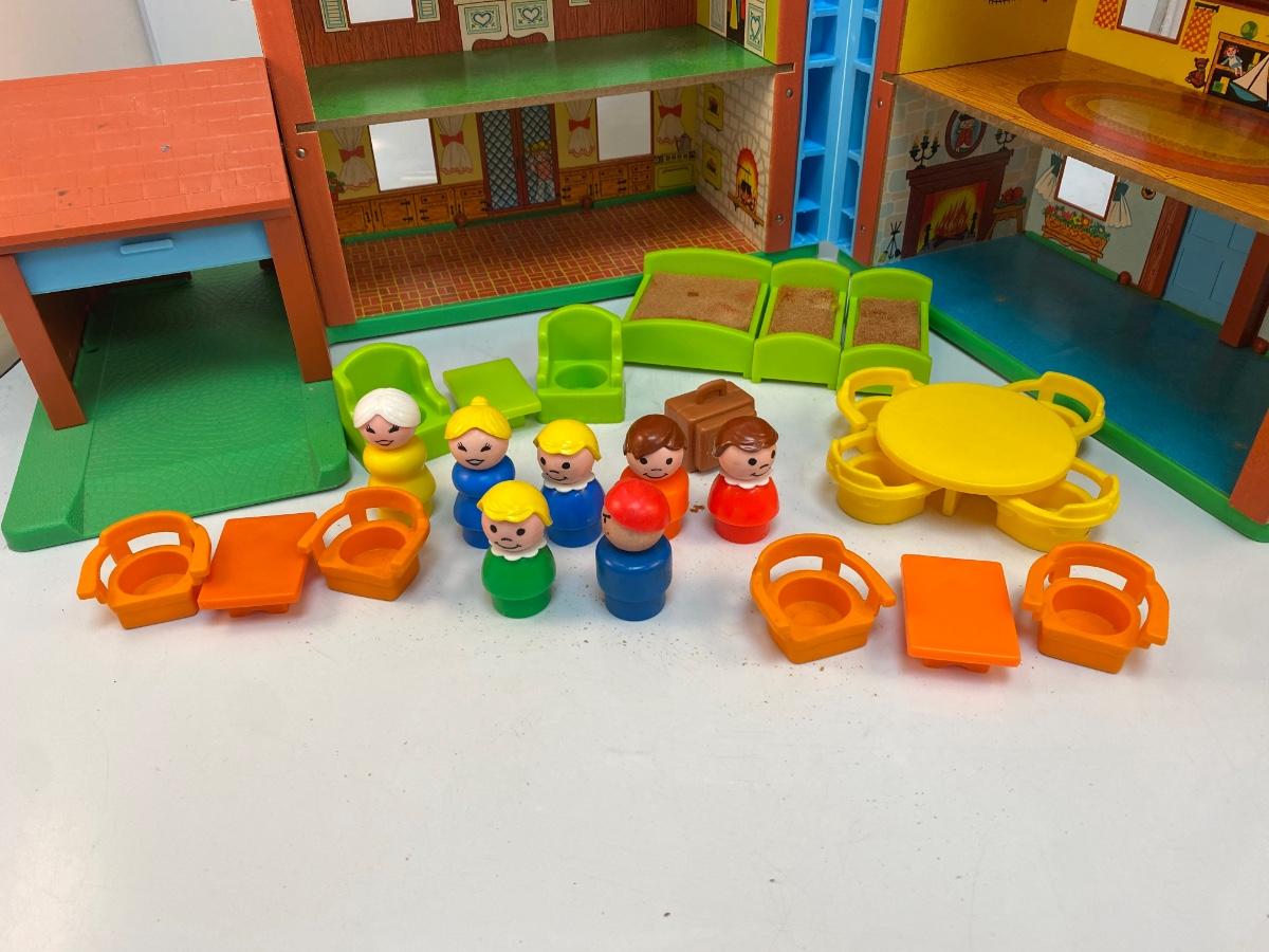 Retro Vintage Fisher Price Little People House with Accessories and Original Box. In good played with condition. Doesn't have all the original accessories that were included with the set but has some extras included. Box has wear. The foam on beds is starting to fall apart from age.