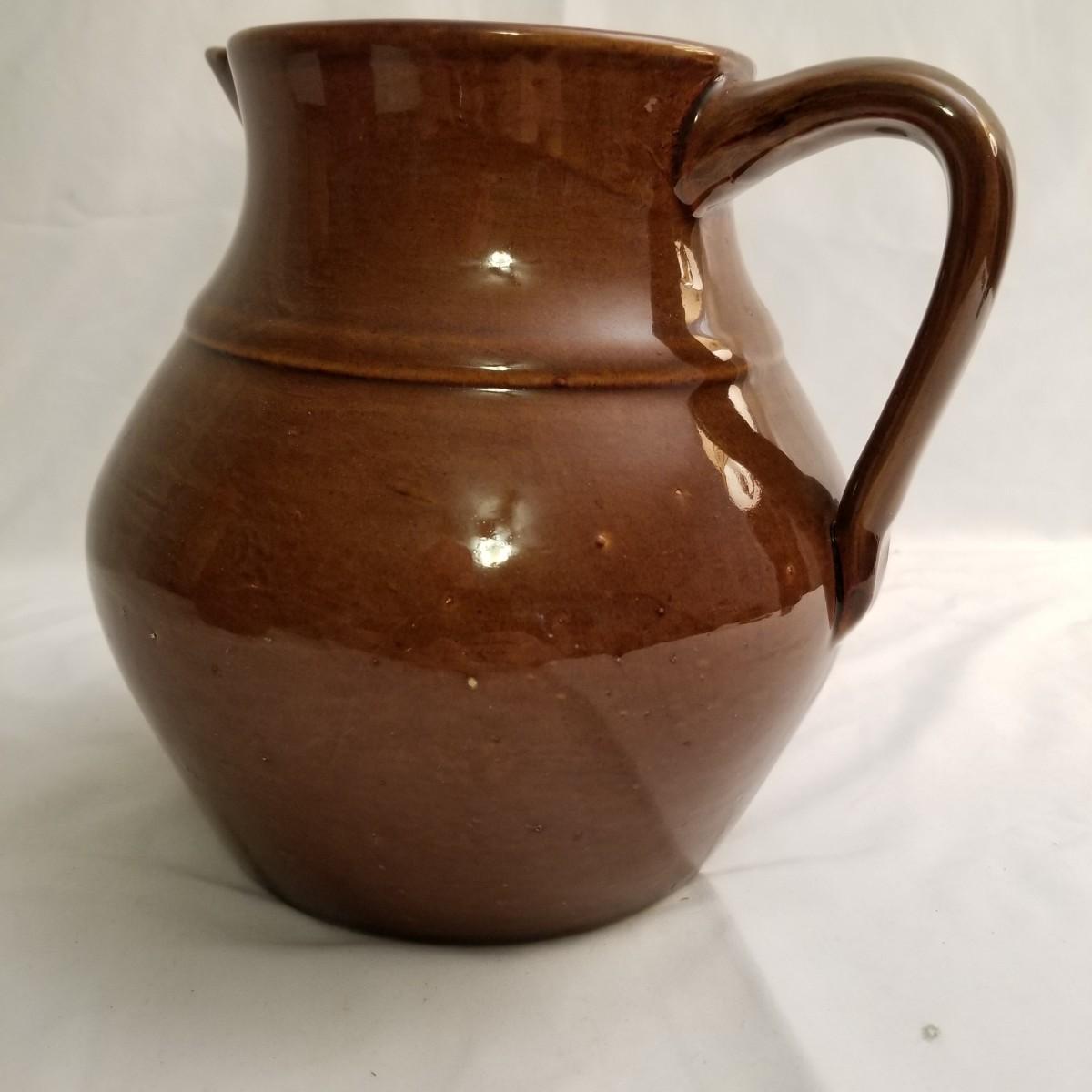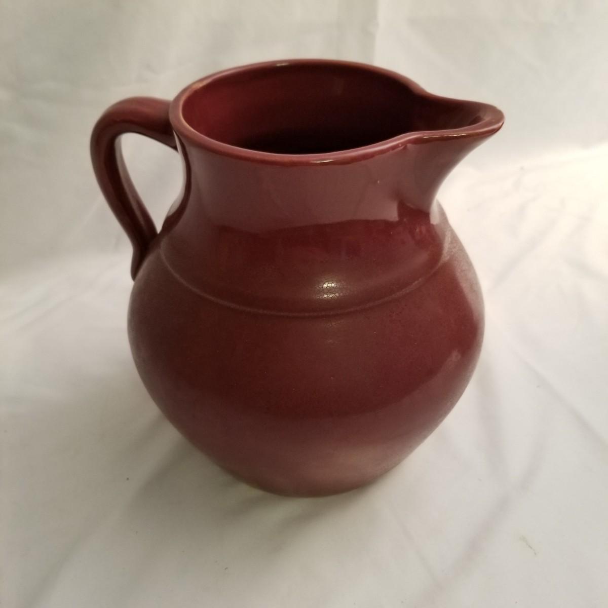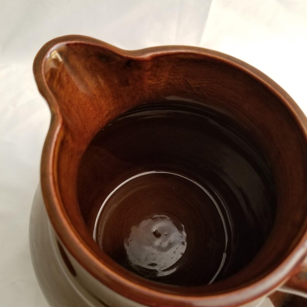 A pair of Uhl Pottery ceramic handled pitchers, each measures 8.5"x8.5". One the usual brown shiny glaze finish, the other has a light red glaze and a crackle/craze look. Minor imperfections on each, see photos for details. Shipping available.