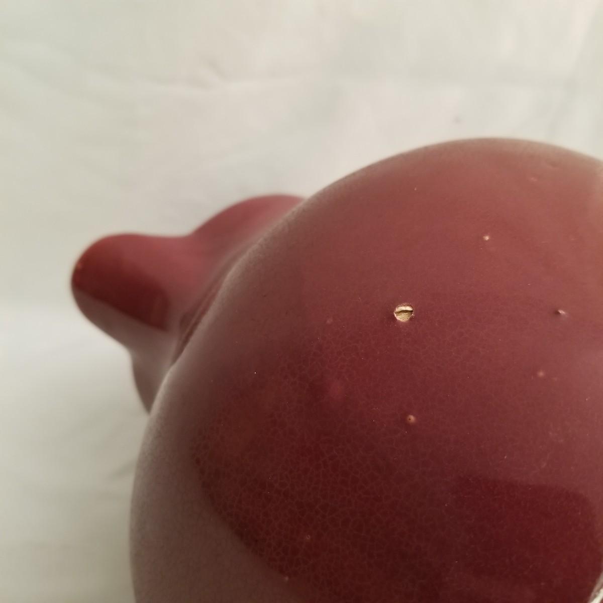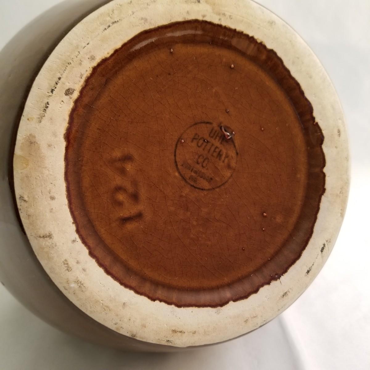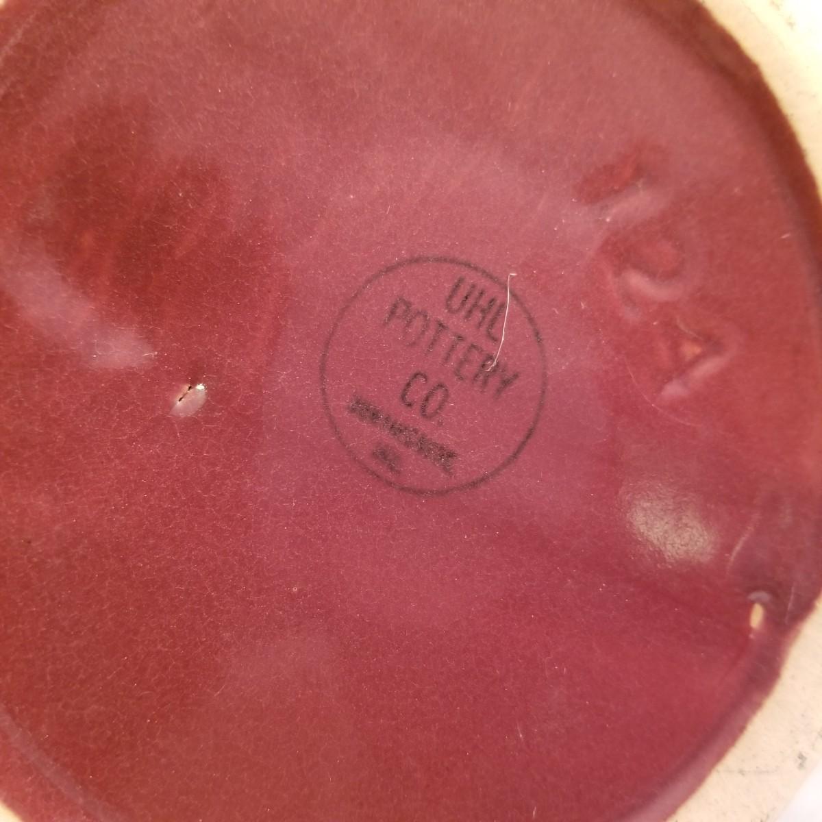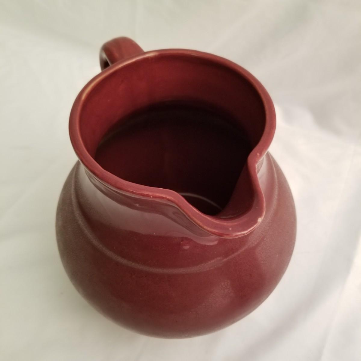 A pair of Uhl Pottery ceramic handled pitchers, each measures 8.5"x8.5". One the usual brown shiny glaze finish, the other has a light red glaze and a crackle/craze look. Minor imperfections on each, see photos for details. Shipping available.