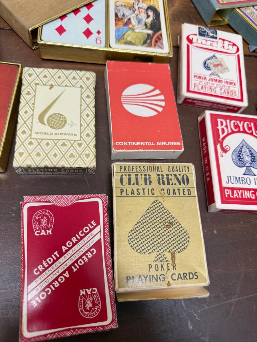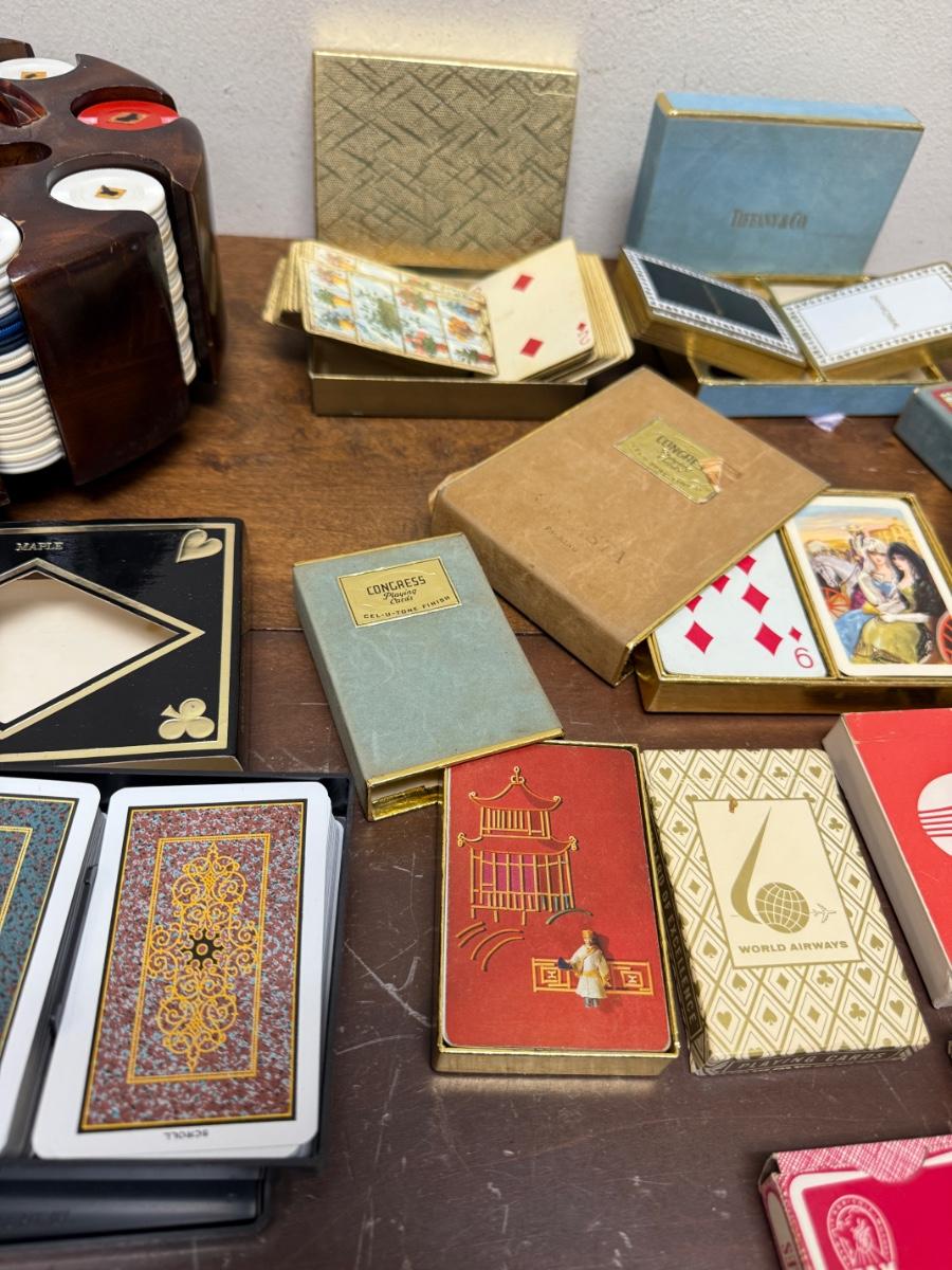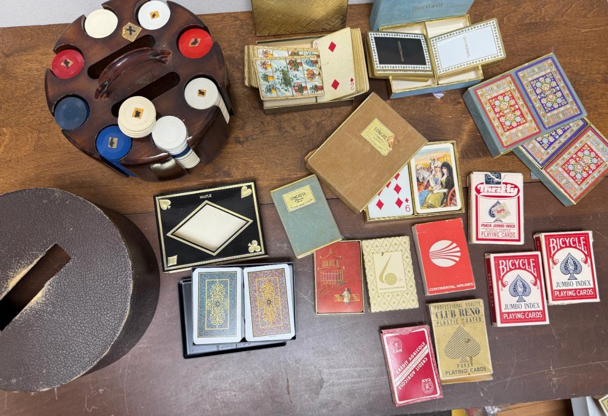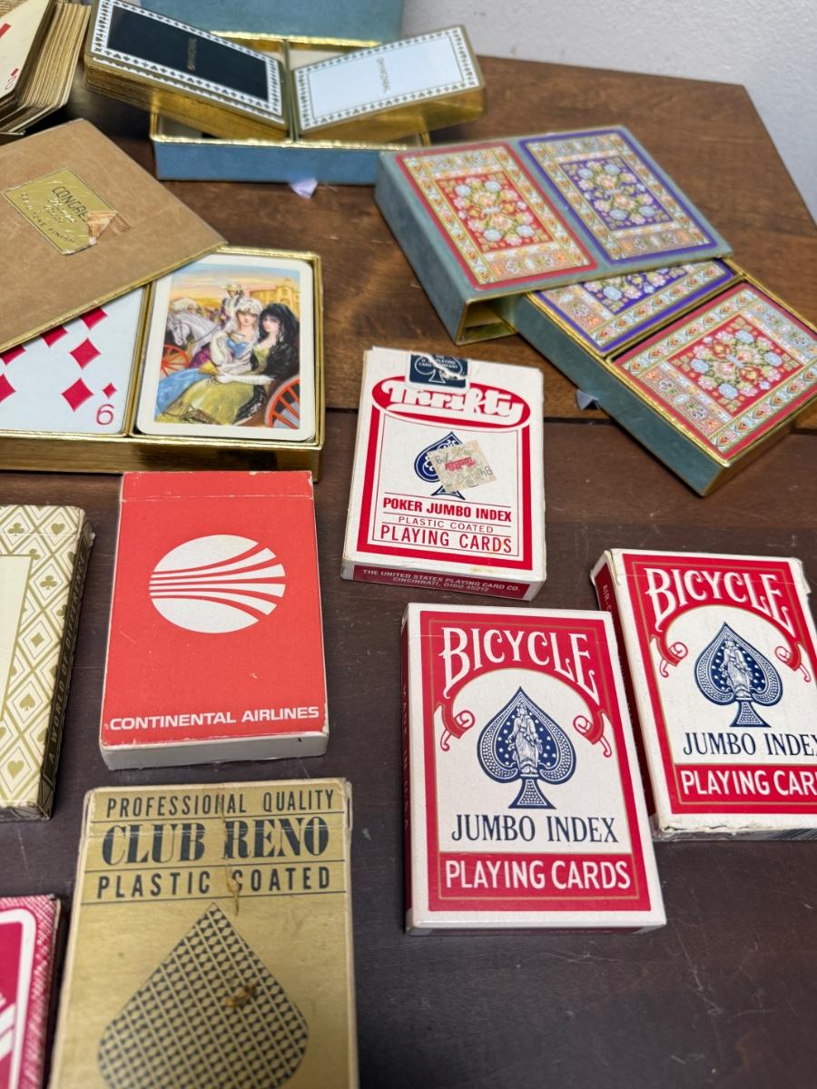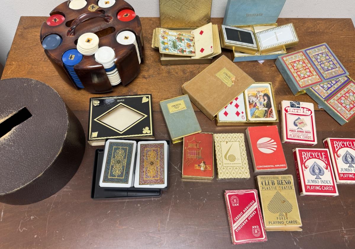 Many different vintage decks of cards: Bicycle, Continental Airlines, Thrifty, Club Reno, and more. See photos for what's included in this lot. Most of the boxes are unsealed, but there are a couple of sealed ones. There is a double deck box of cards personalized with Carmen Oyharzabal (a well known resident of San Juan Capistrano, California & the Mission. The poker chips are a mixture of two different plastic material and slightly different pattern.