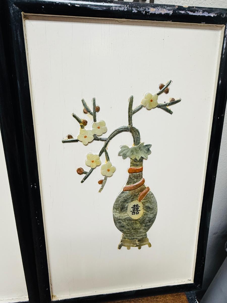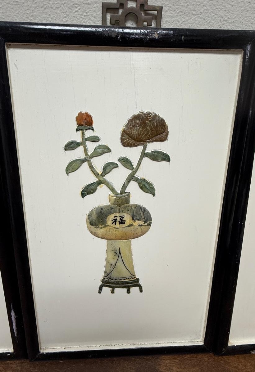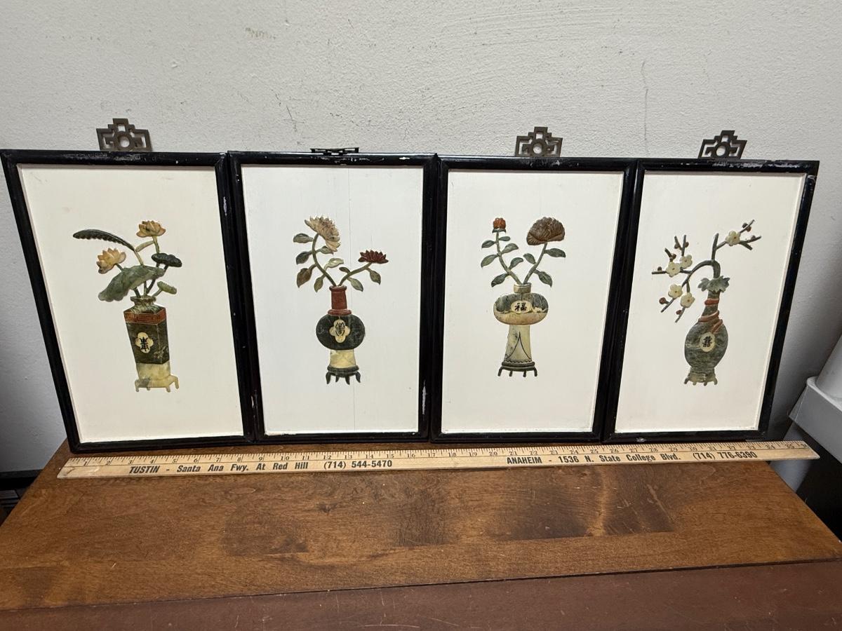 Set of 4 framed wall art pieces, each a 3-dimensional relief assembled from various colors and shapes of carved and polished stone. Tac is a flower and vase representing the 4 seasons: Spring - Double Happiness, Summer - Good Luck, Autumn - Happiness, and Winter - Long Life.Each is approx. 13 1/4" X 8 1/4" and are from Hong Kong. Frames have some areas of missing paint, images are all in very good condition.