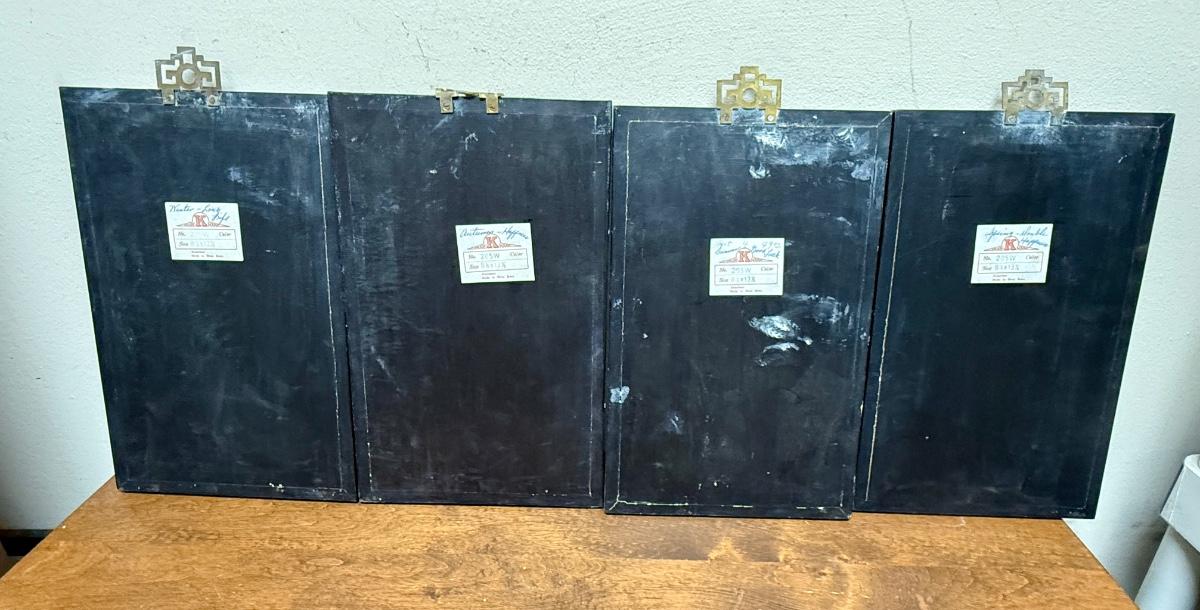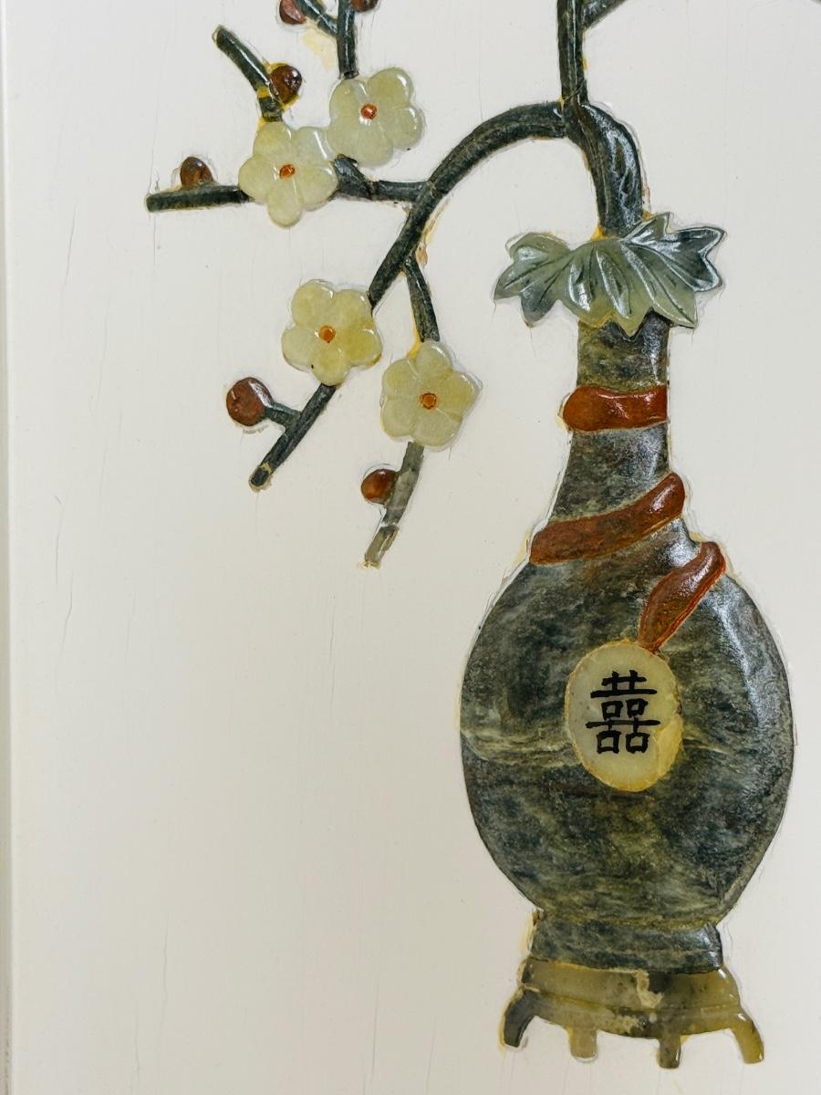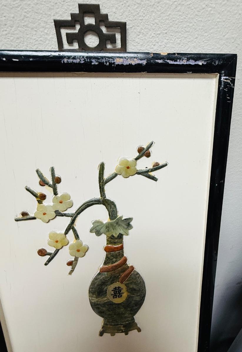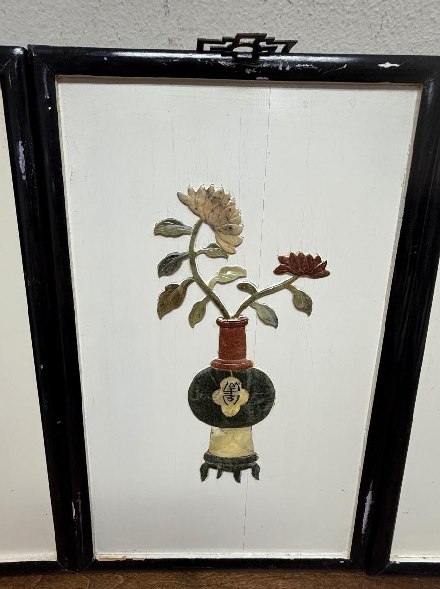 Set of 4 framed wall art pieces, each a 3-dimensional relief assembled from various colors and shapes of carved and polished stone. Tac is a flower and vase representing the 4 seasons: Spring - Double Happiness, Summer - Good Luck, Autumn - Happiness, and Winter - Long Life.Each is approx. 13 1/4" X 8 1/4" and are from Hong Kong. Frames have some areas of missing paint, images are all in very good condition.