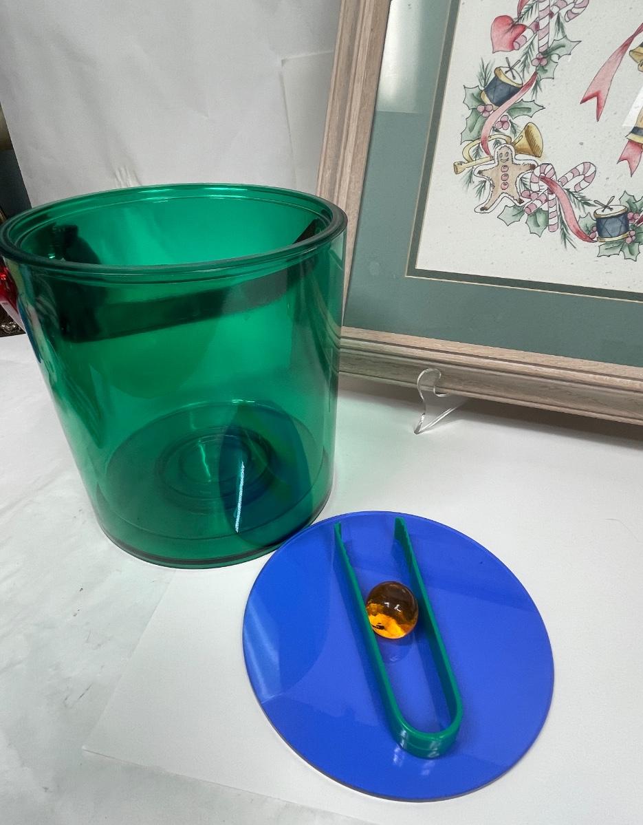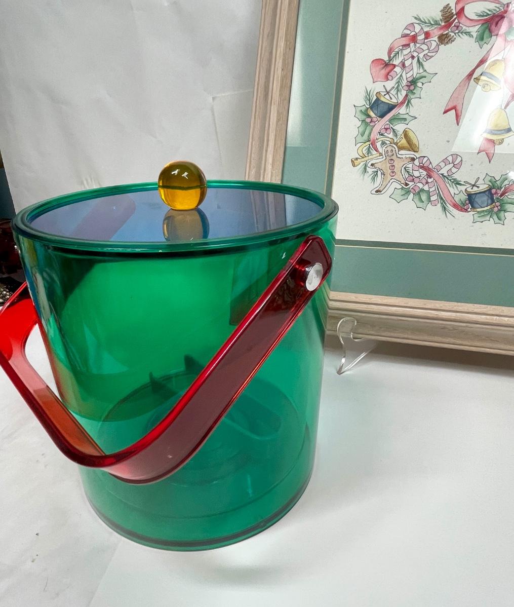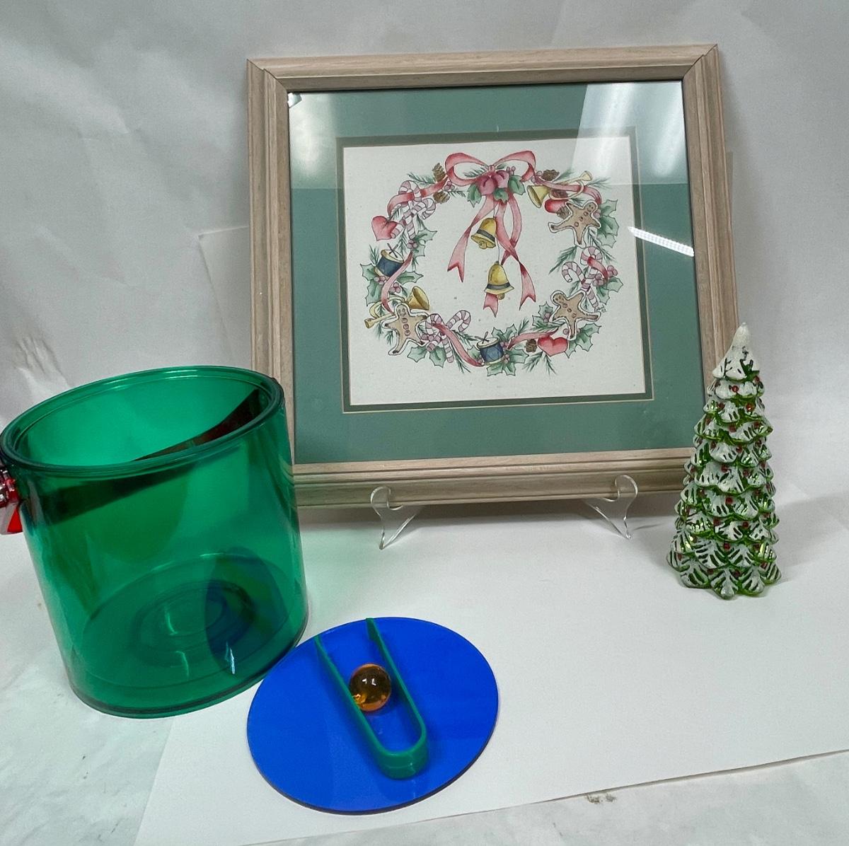 Translucent Plastic Green Ice Bucket, small battery-powered light-up Christmas Tree, and Framed artwork of a Christmas Wreath. All in good condition.