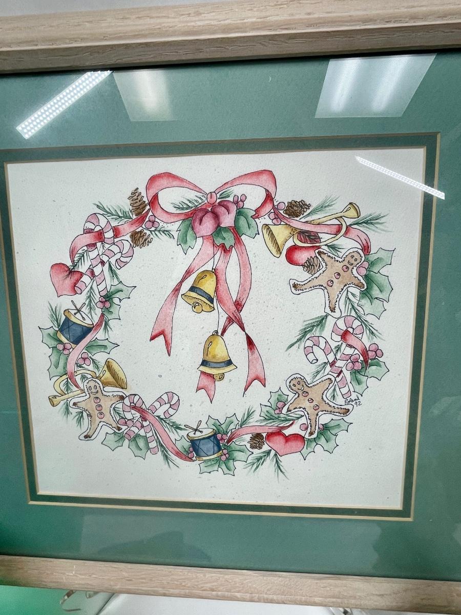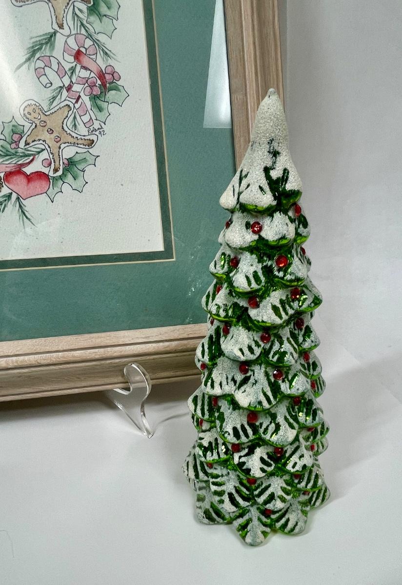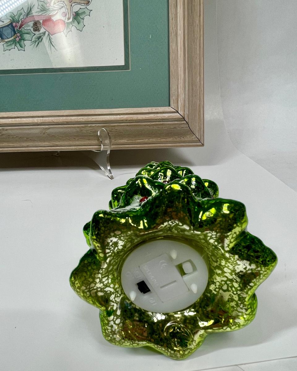 Translucent Plastic Green Ice Bucket, small battery-powered light-up Christmas Tree, and Framed artwork of a Christmas Wreath. All in good condition.