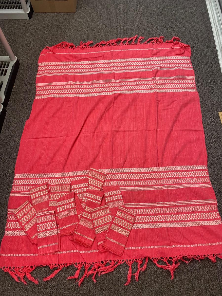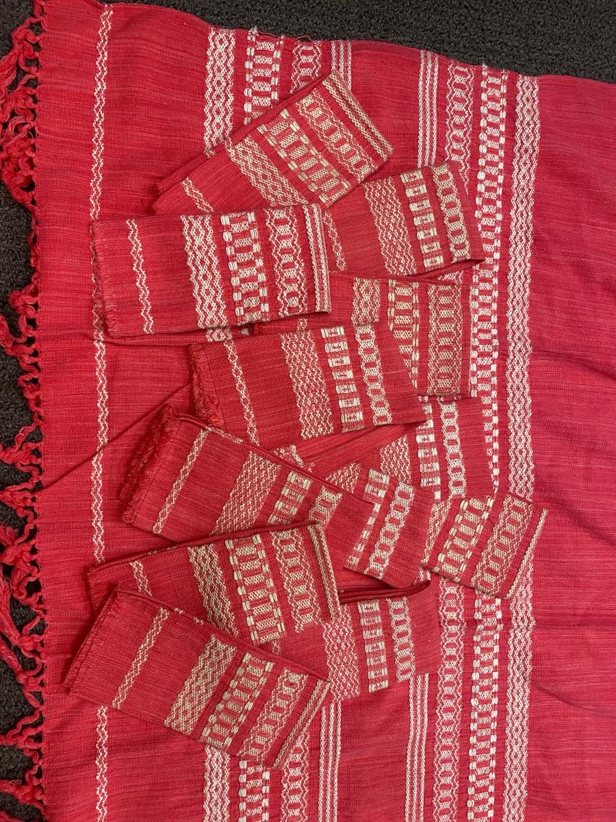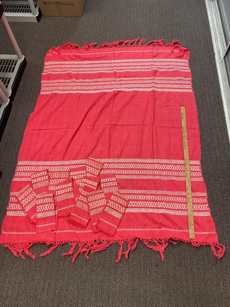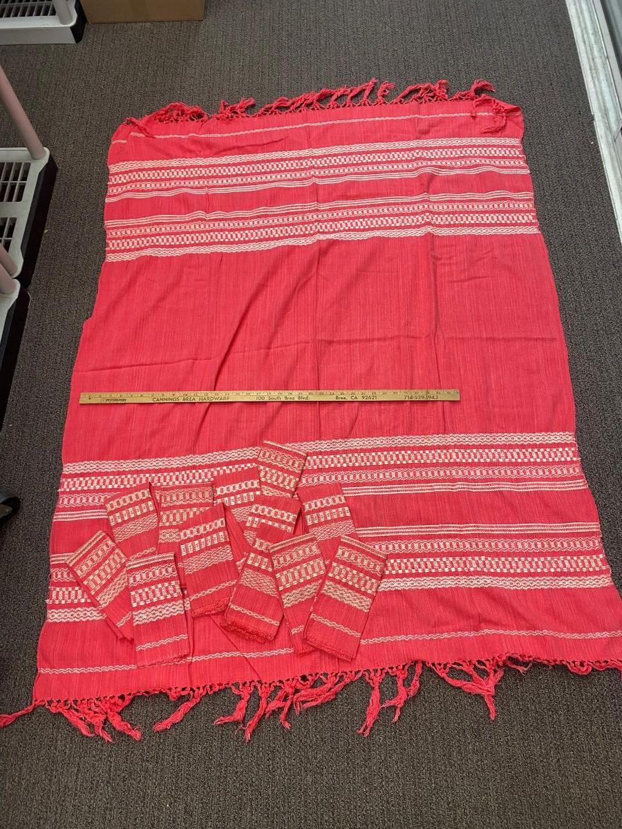 Vintage Dark Pink Fuchsia with White Embroidered Stripes Tablecloth & Napkin Set Fringed Edge. In good condition. Some discoloration to the napkins, no major spots or stains. About 5'x4' size. 12 dinner napkins included.