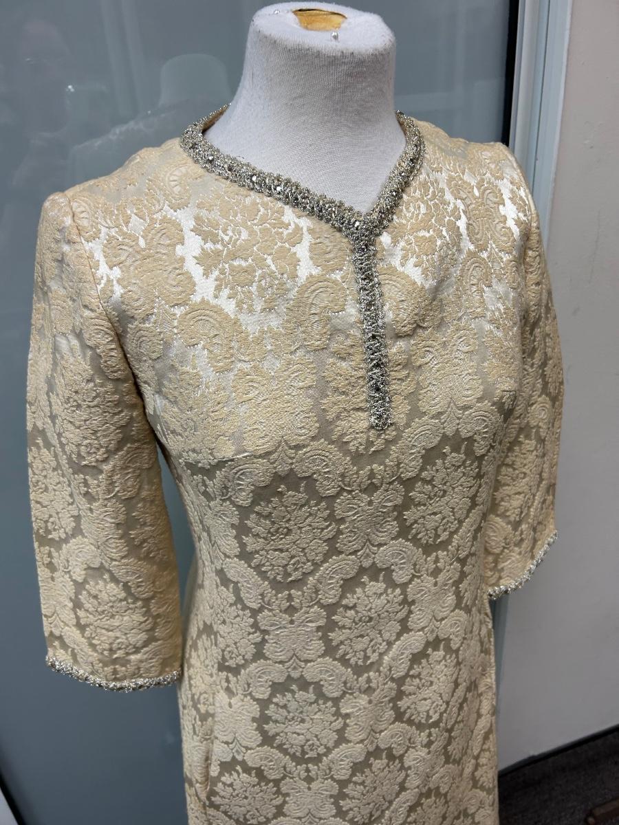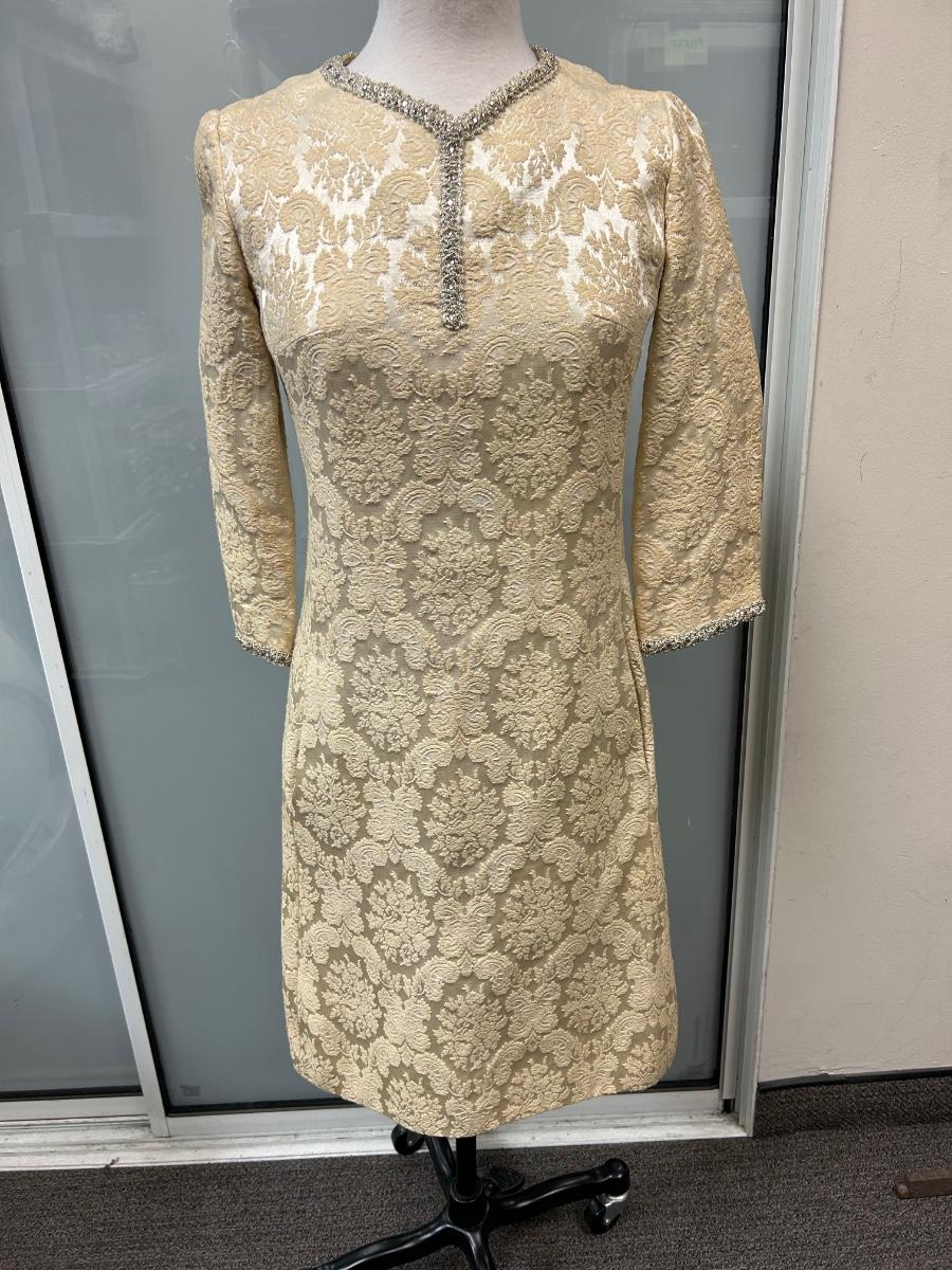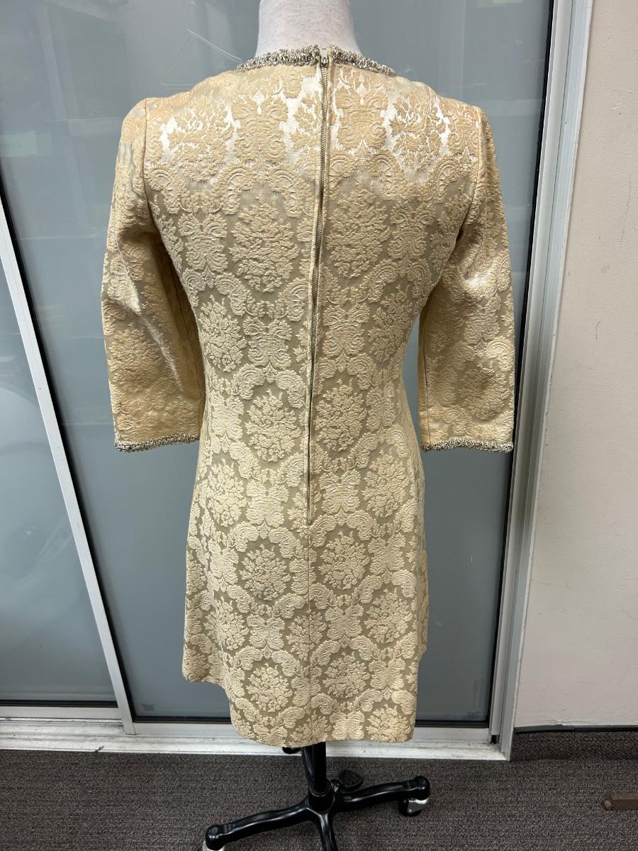 Vintage 1960s Leslie Fay Original White Ivory Gold Brocade Zipper Bask Sheath Dress