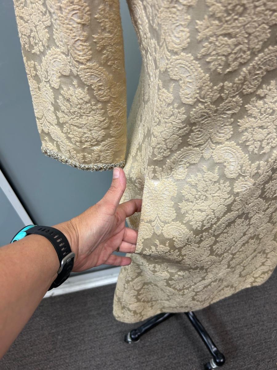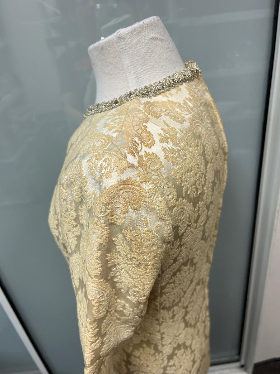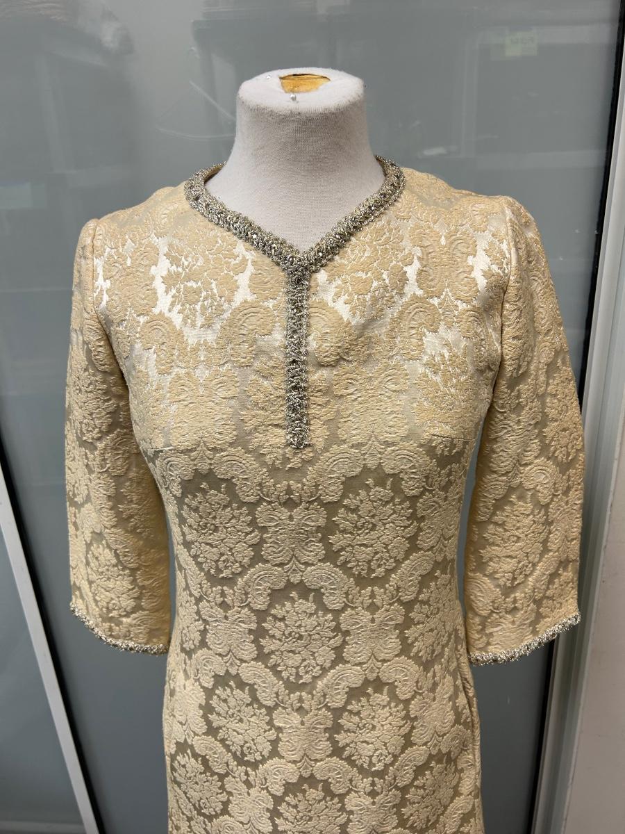 Vintage 1960s Leslie Fay Original White Ivory Gold Brocade Zipper Bask Sheath Dress