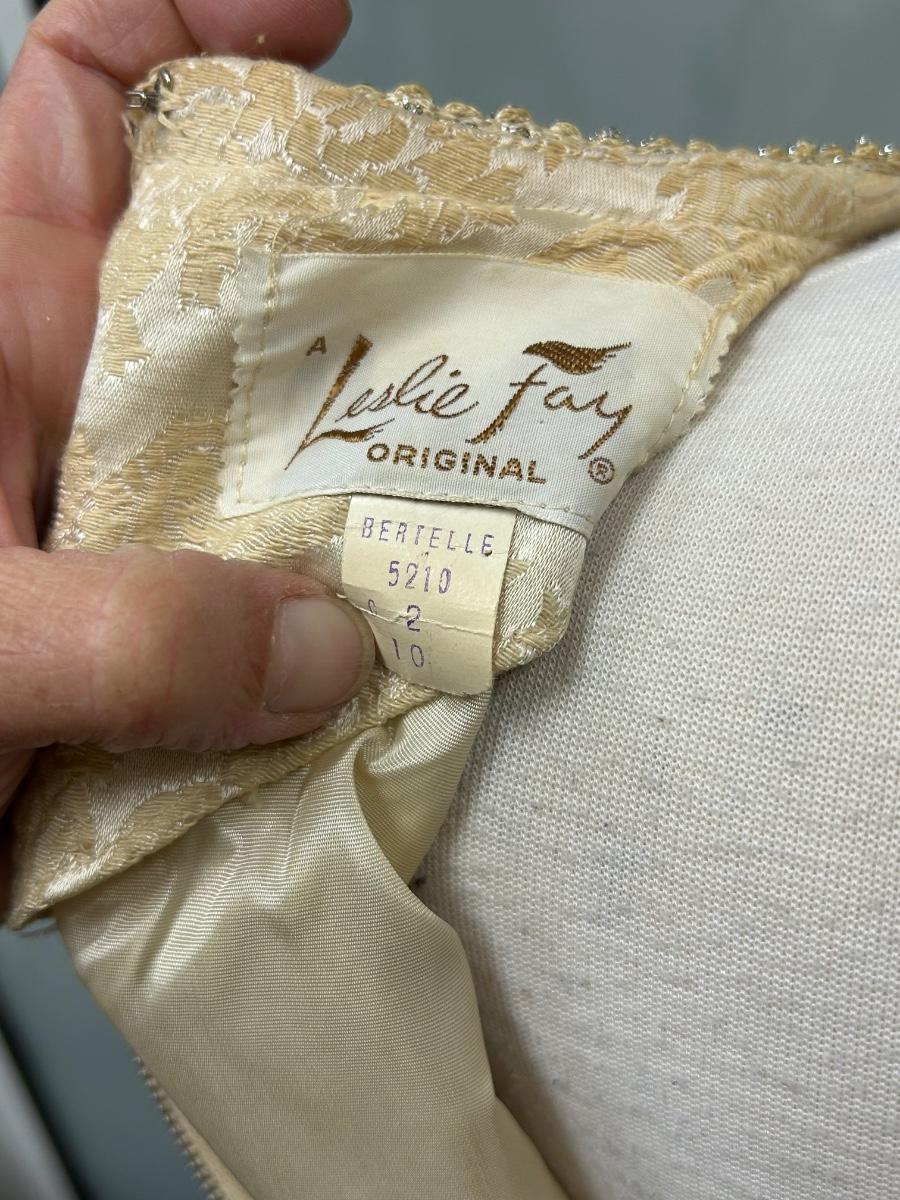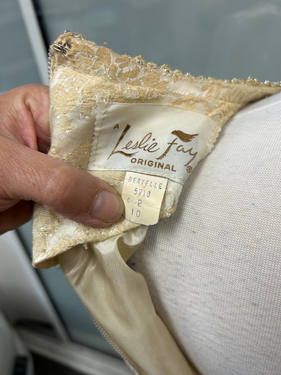 Vintage 1960s Leslie Fay Original White Ivory Gold Brocade Zipper Bask Sheath Dress. In good vintage condition. Original tag attached. Size 10. Has some discoloration from age and storage but in overall wearable condition.