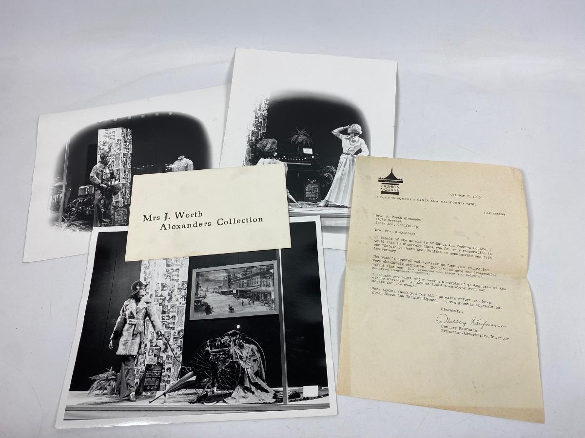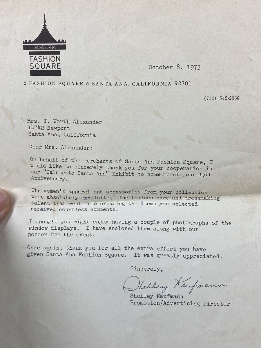 Vintage Fashion Square Santa Ana CA Store Window Fashion Photos & Letter of Thanks. Mrs. Alexander was the owner of the Victorian clothing estate we have been currently auctioning. She was part of a historical society and had many contributions to Santa Ana. This is a lot of three fashion windows with her own collection displayed and a letter of thanks from Fashion Square, Santa Ana CA. For those familiar with Santa Ana, Fashion Square is what Main Place Mall was once called.