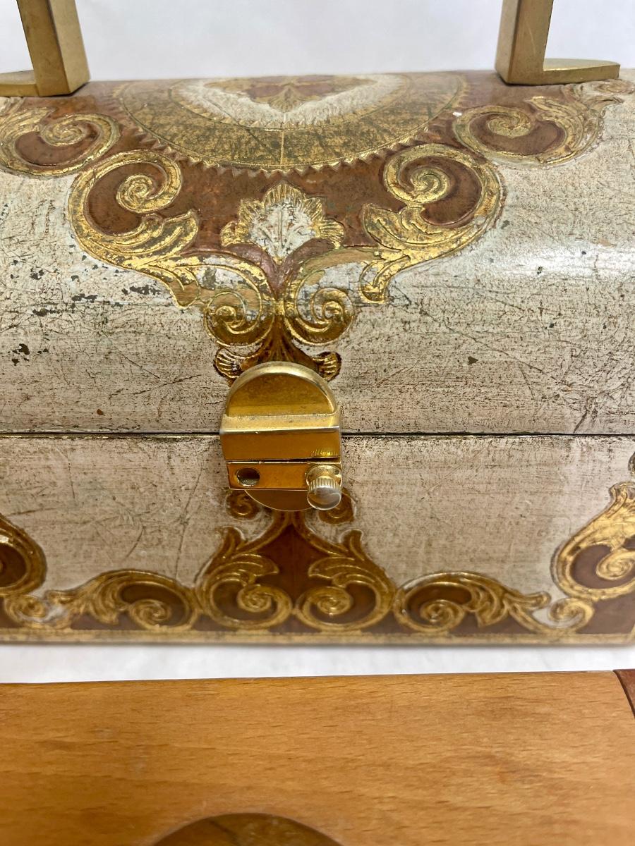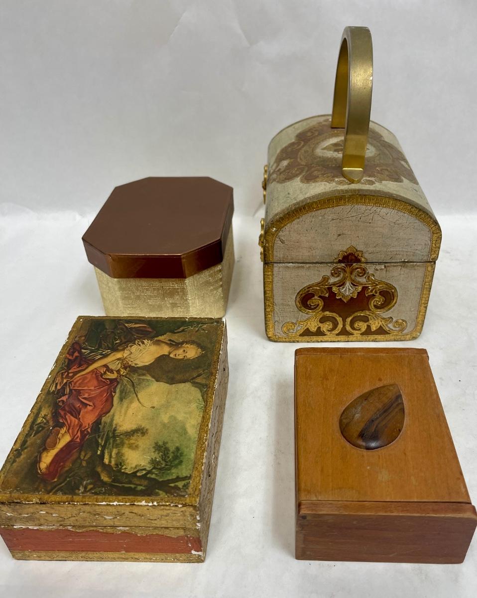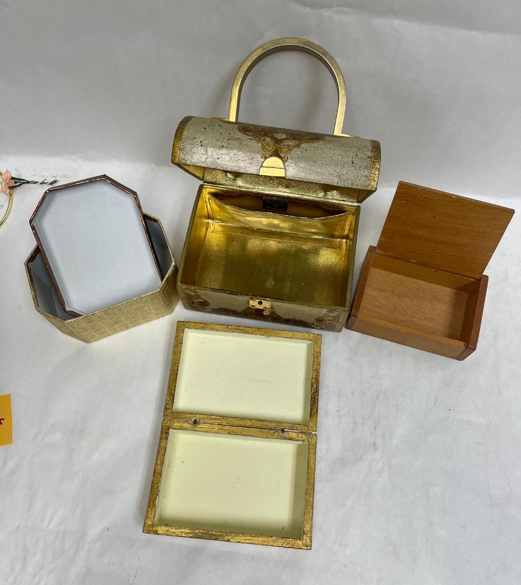 purse latch won't stay closed when picked up by handle. The octagon box is cardboard and the two boxes in front are wooden. In good used condition, except where noted above. Make sure to look at all pictures for more details on condition.