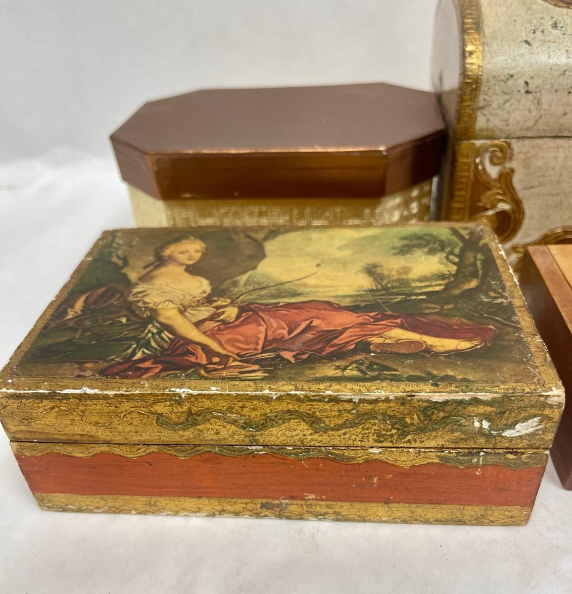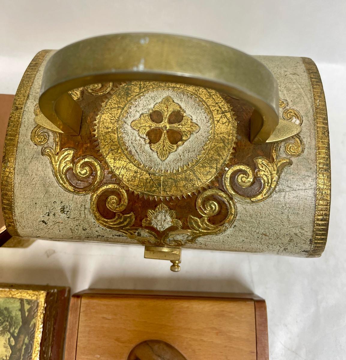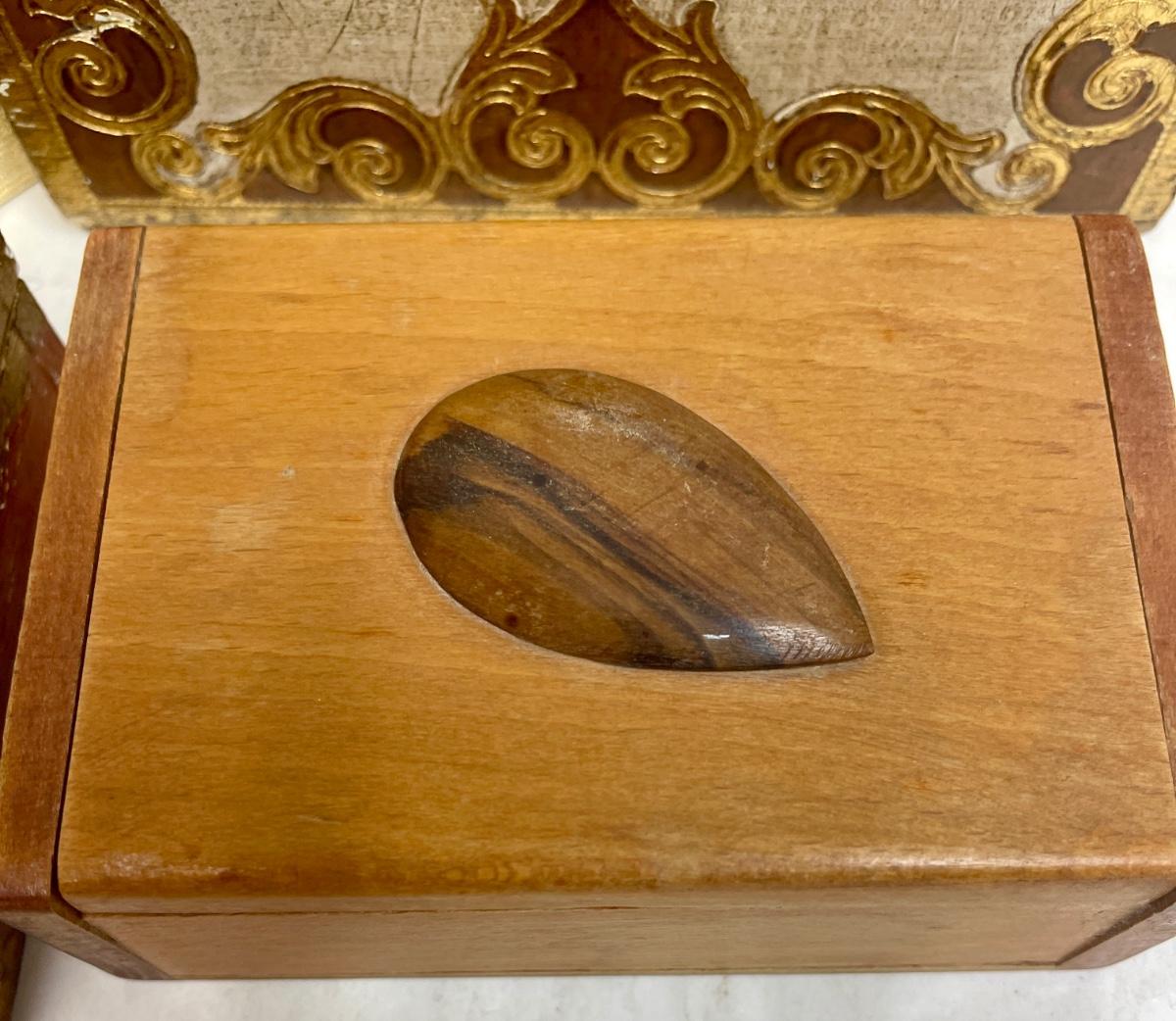 purse latch won't stay closed when picked up by handle. The octagon box is cardboard and the two boxes in front are wooden. In good used condition, except where noted above. Make sure to look at all pictures for more details on condition.