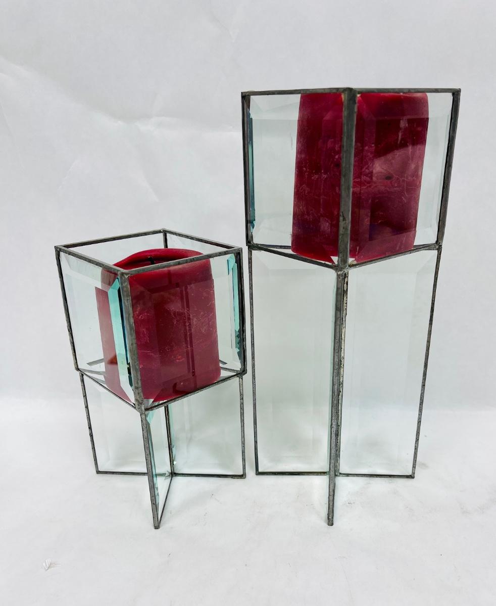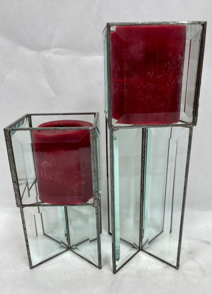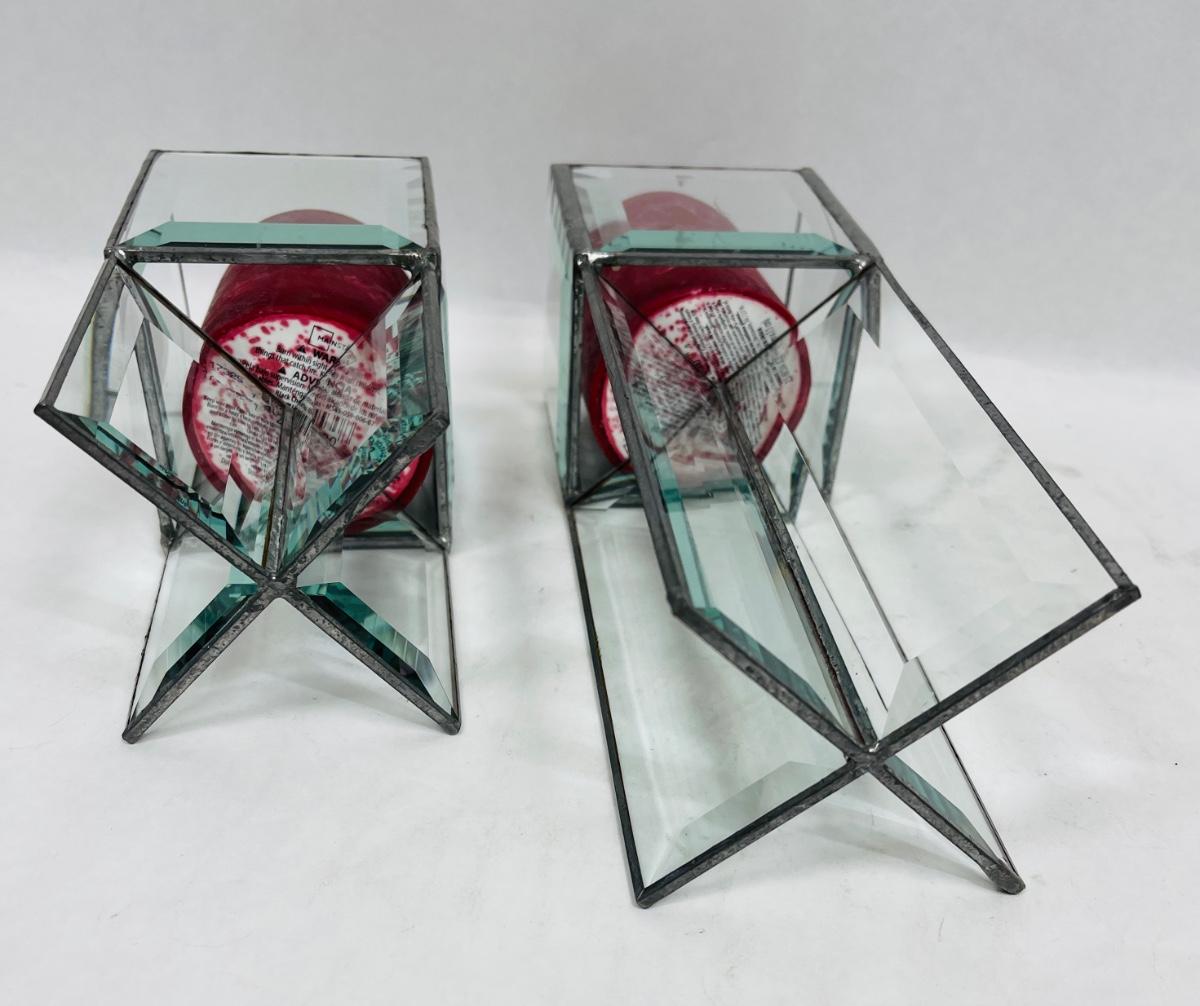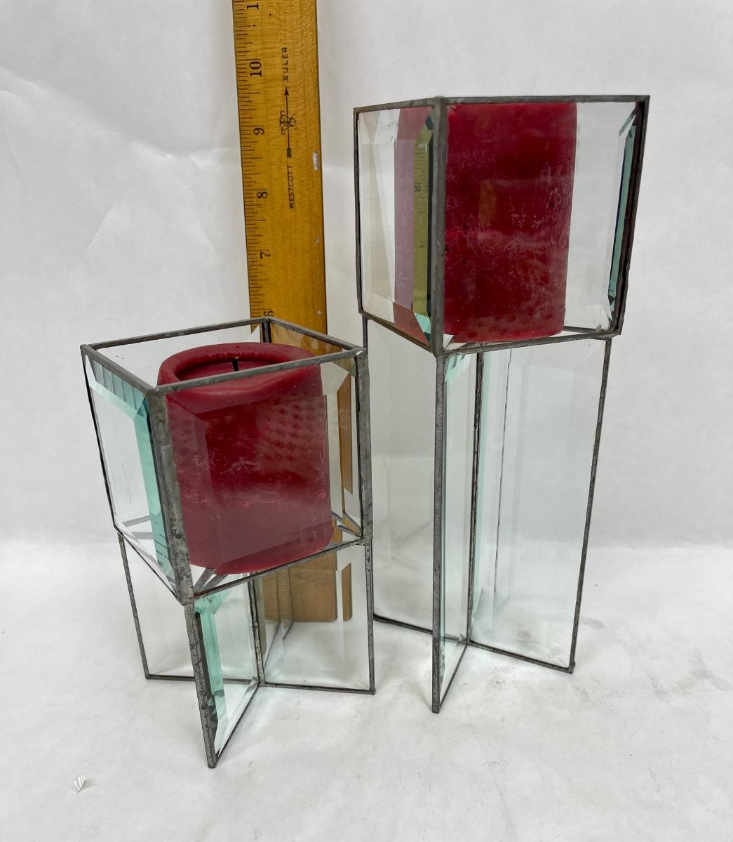 Vintage Leaded Beveled Glass Square Votive Candle Holders Mid-Century