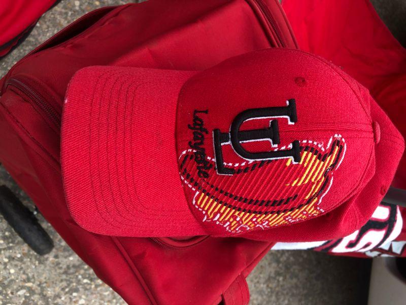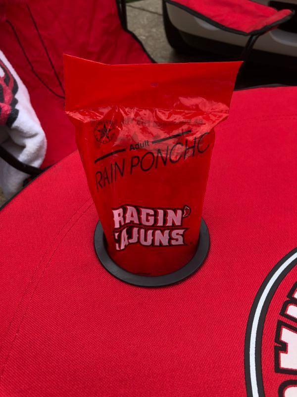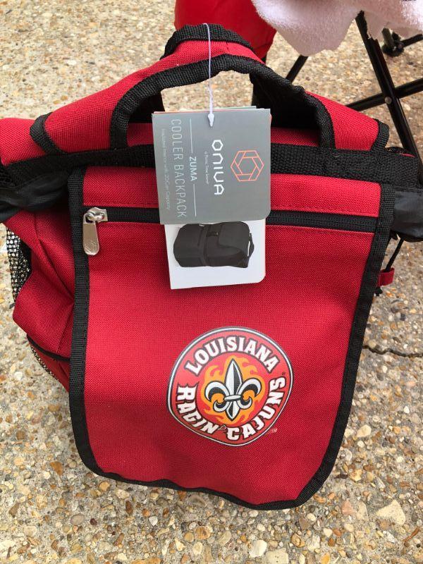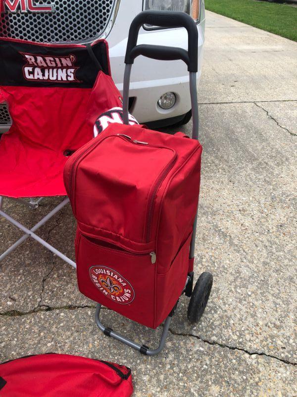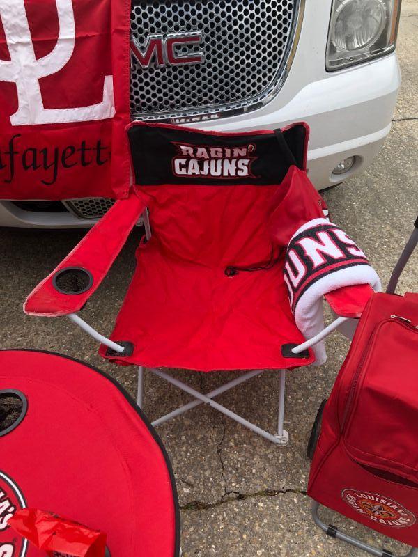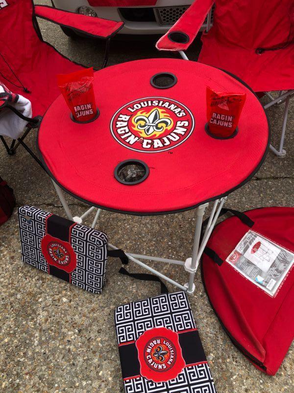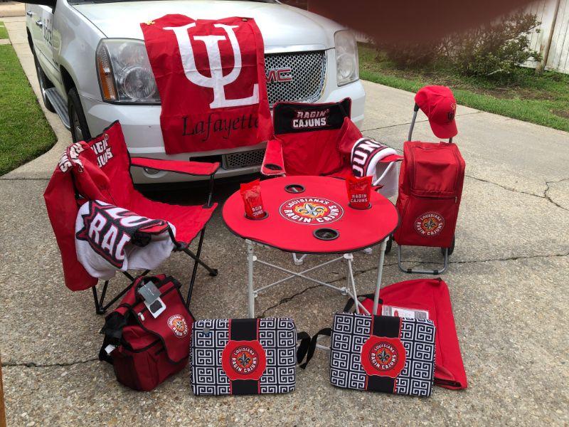 Setup. Includes 1 round collapsible table with carrying case, 2 collapsible Ragin Cajun Chairs with carrying cases, 2 New Ragin Cajun Ponchos, 1 UL Flag, 1 UL baseball cap, 2 Cajuns beach towels, 2 Stadium Pads with handles, 1 UL Cooler with wheels and ice packs included, 1 NWT ULL Cooler Backpack. All items new or slightly used. Must be picked up in Broussard.