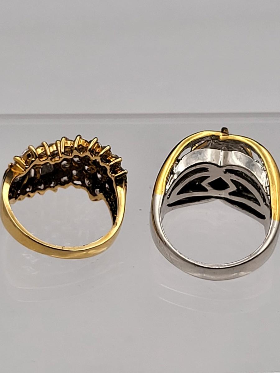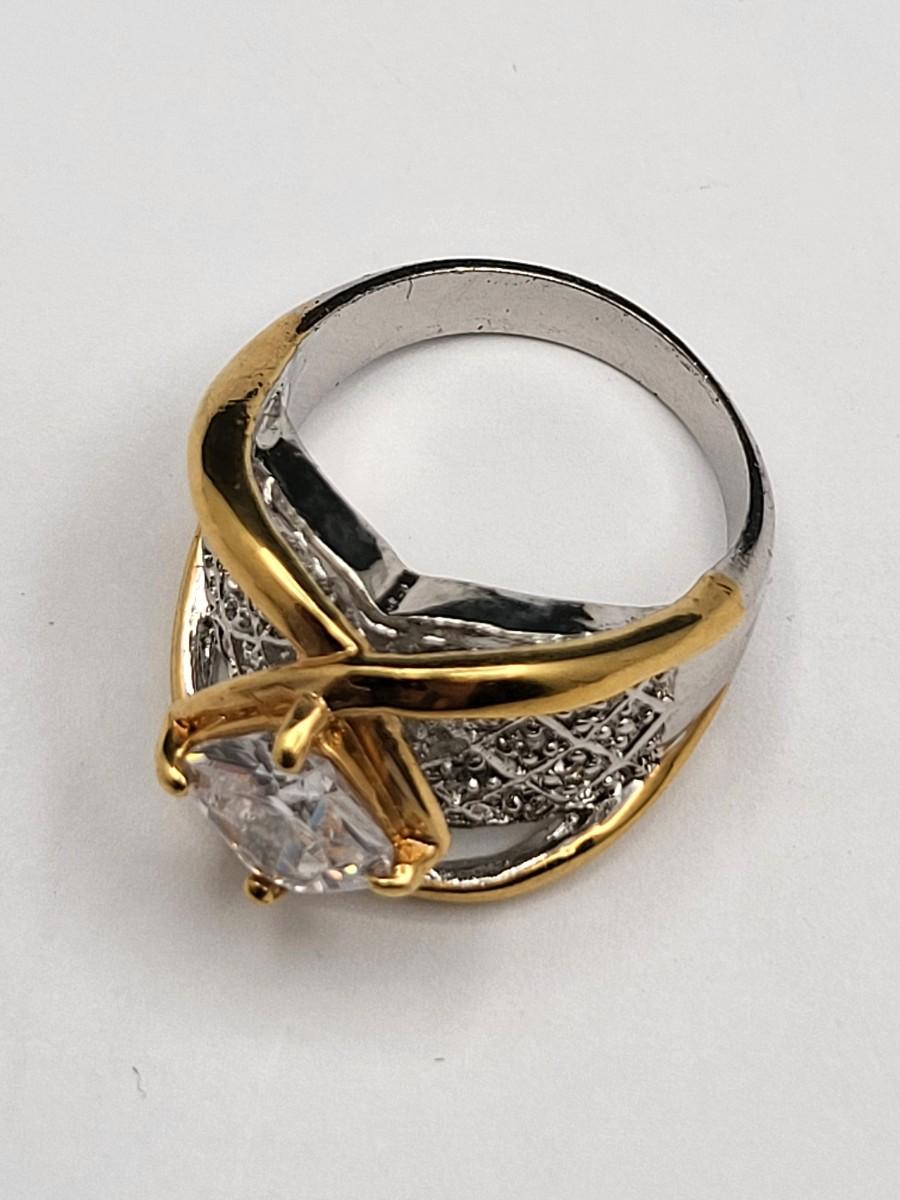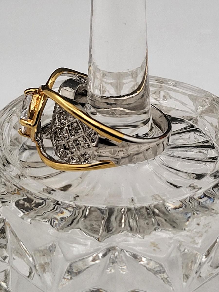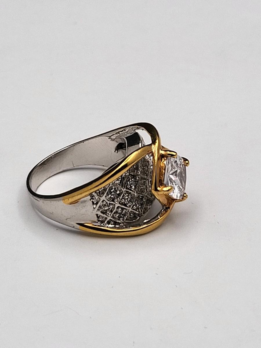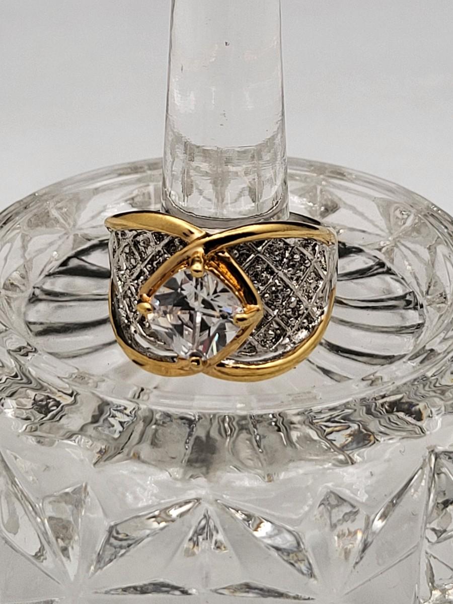 Raised shank, solitaire with checkered pave set, two tone is size 9.