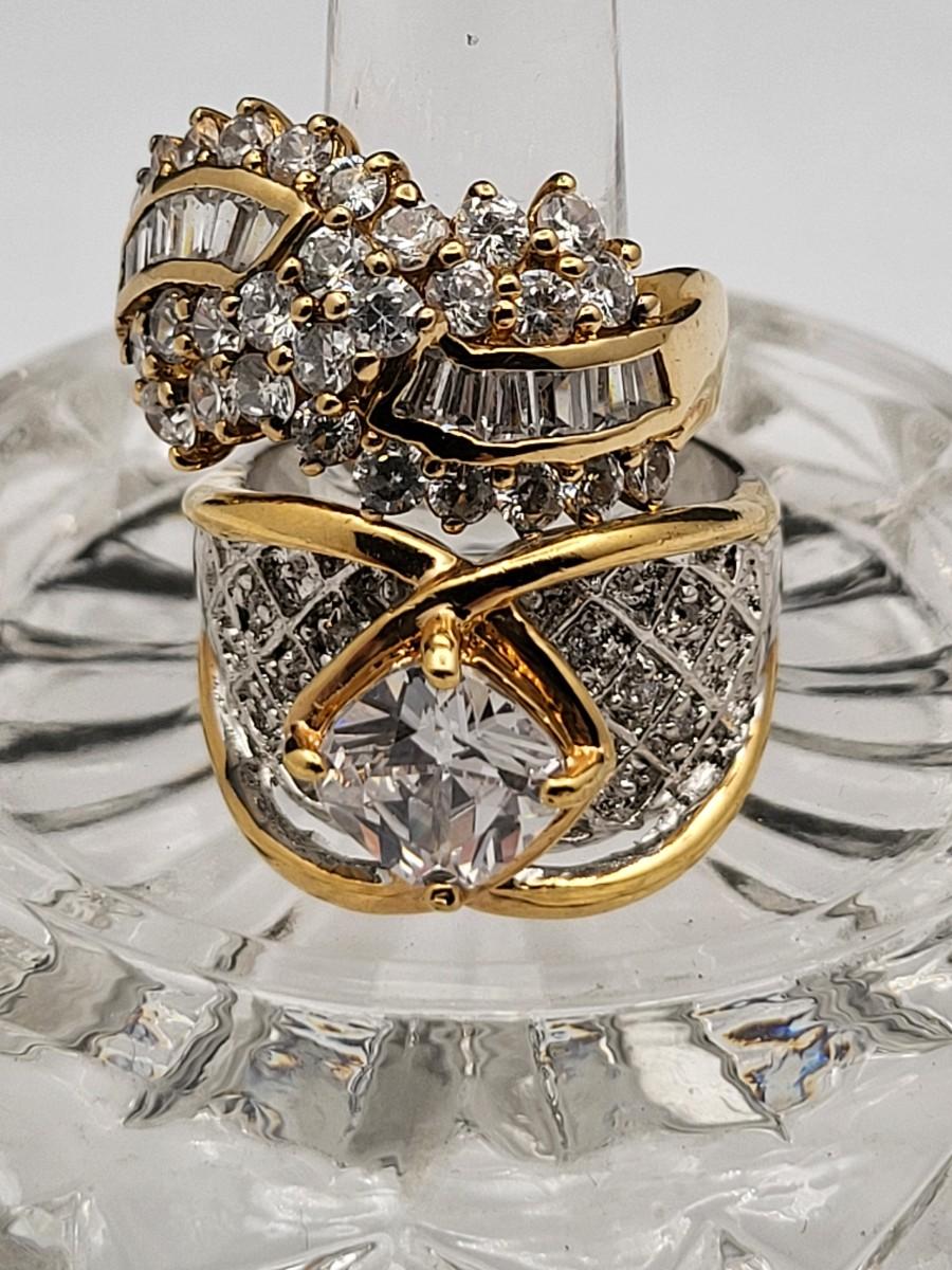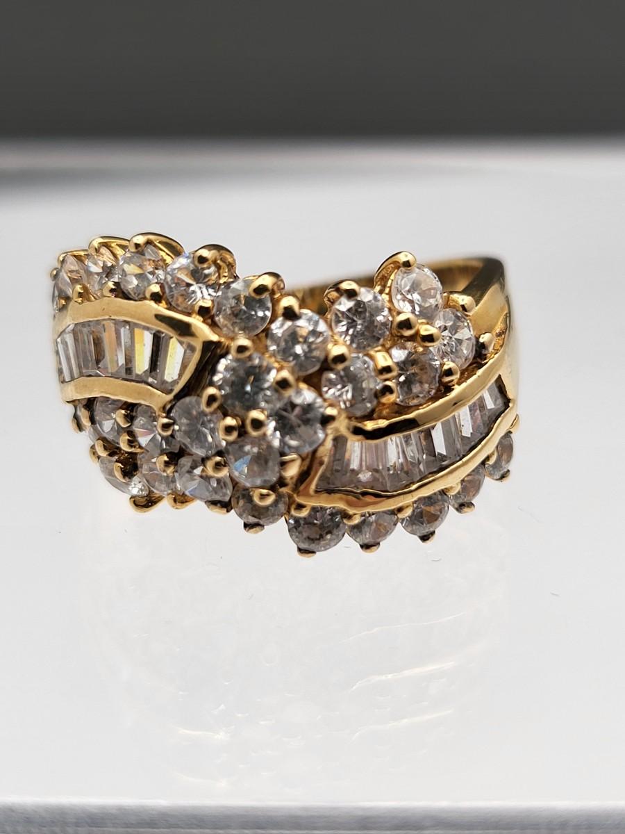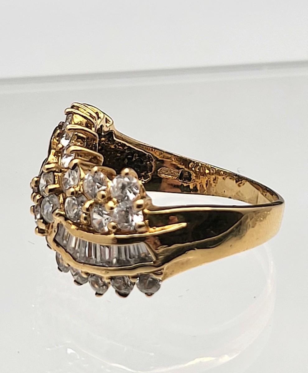 Multi stone cocktail ring with rou d and baguette stones is size 9.