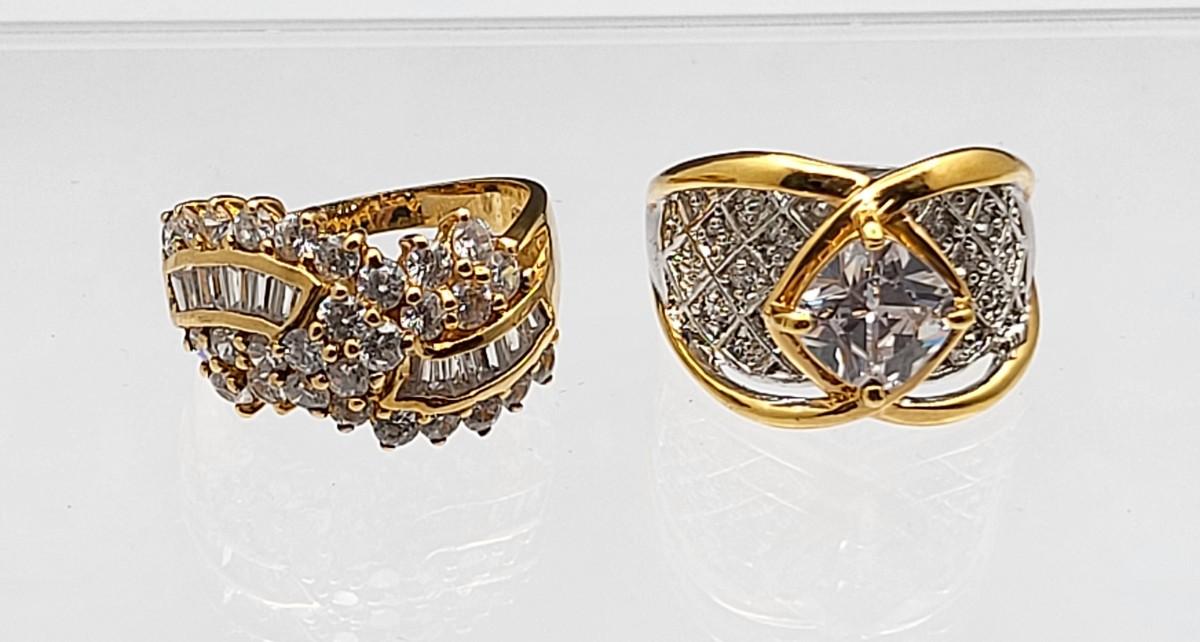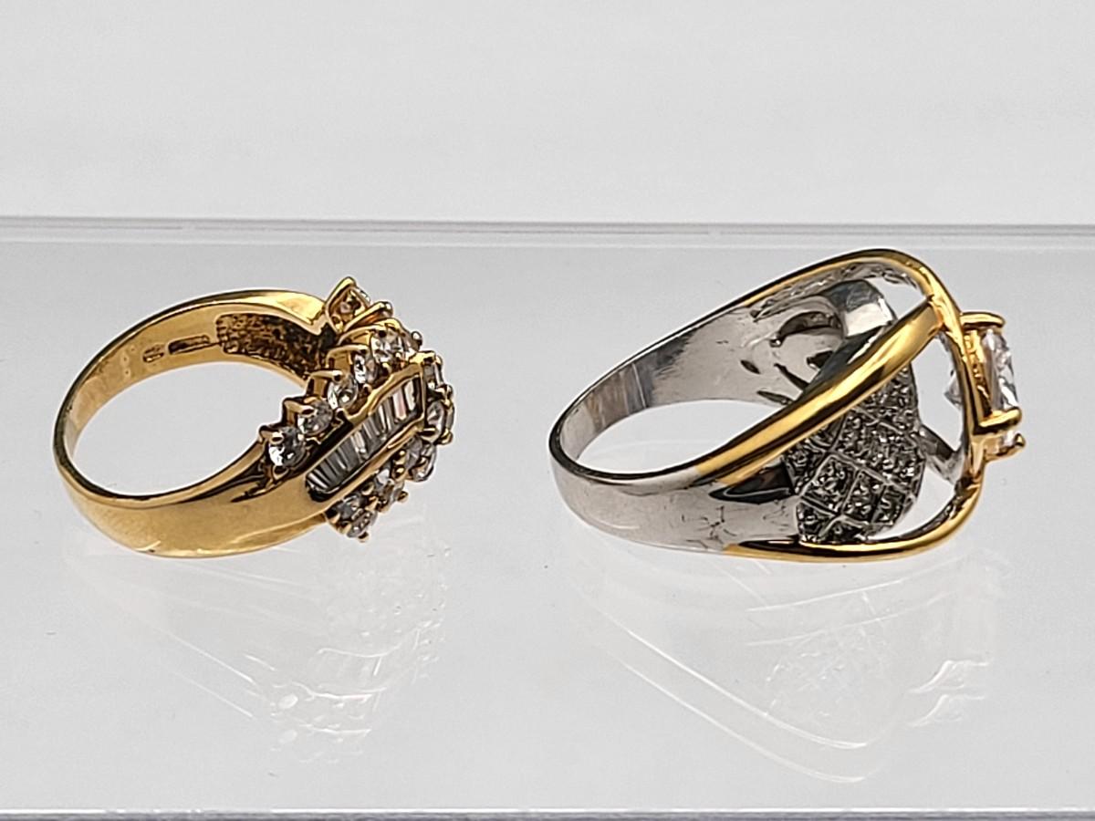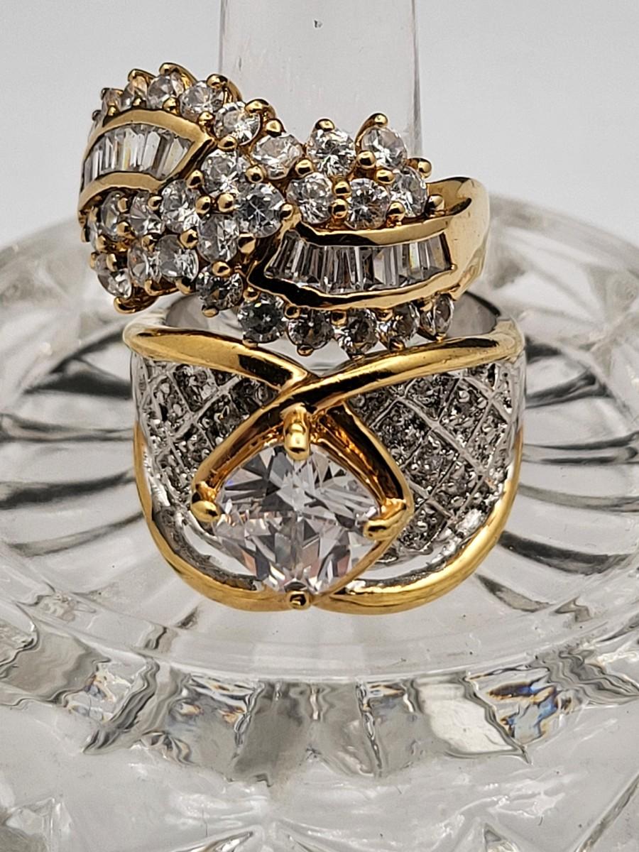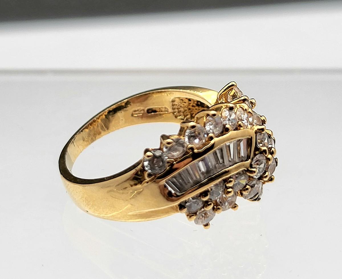 Multi stone cocktail ring with rou d and baguette stones is size 9.