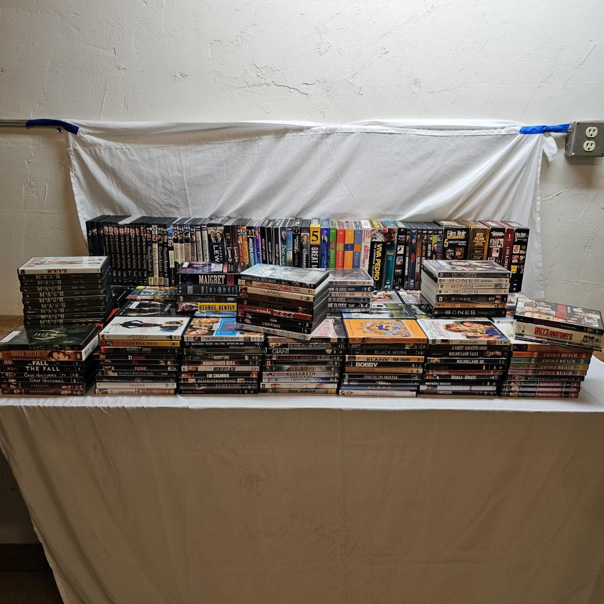 Get the snacks, grab the blankets and settle in for a movie binge extravaganza. All genres, actors, series and more. Not all series are complete. Mash, Bones, Downton Abbey, Blue Bloods, Boardwalk Empire, House and more. Over 350 titles in this batch. See photos for details. Local pickup only.