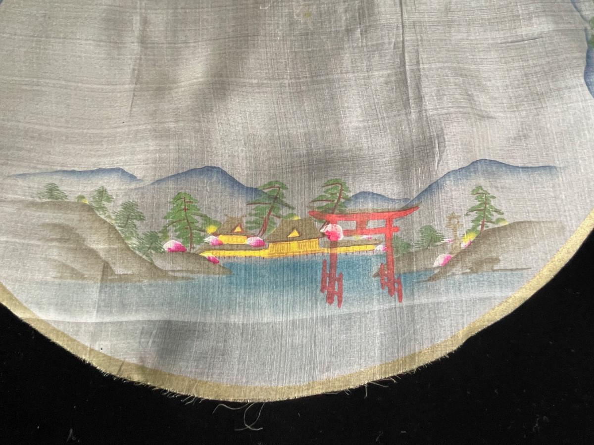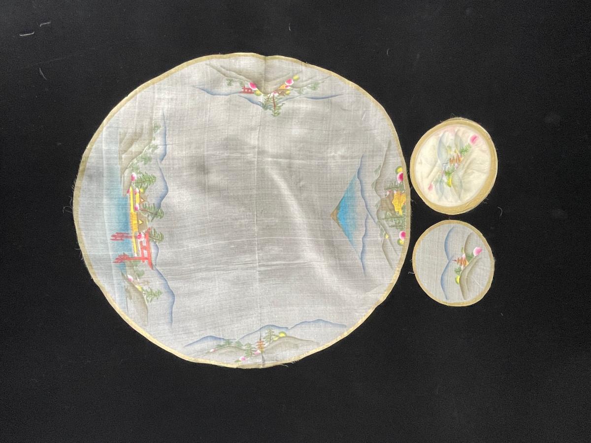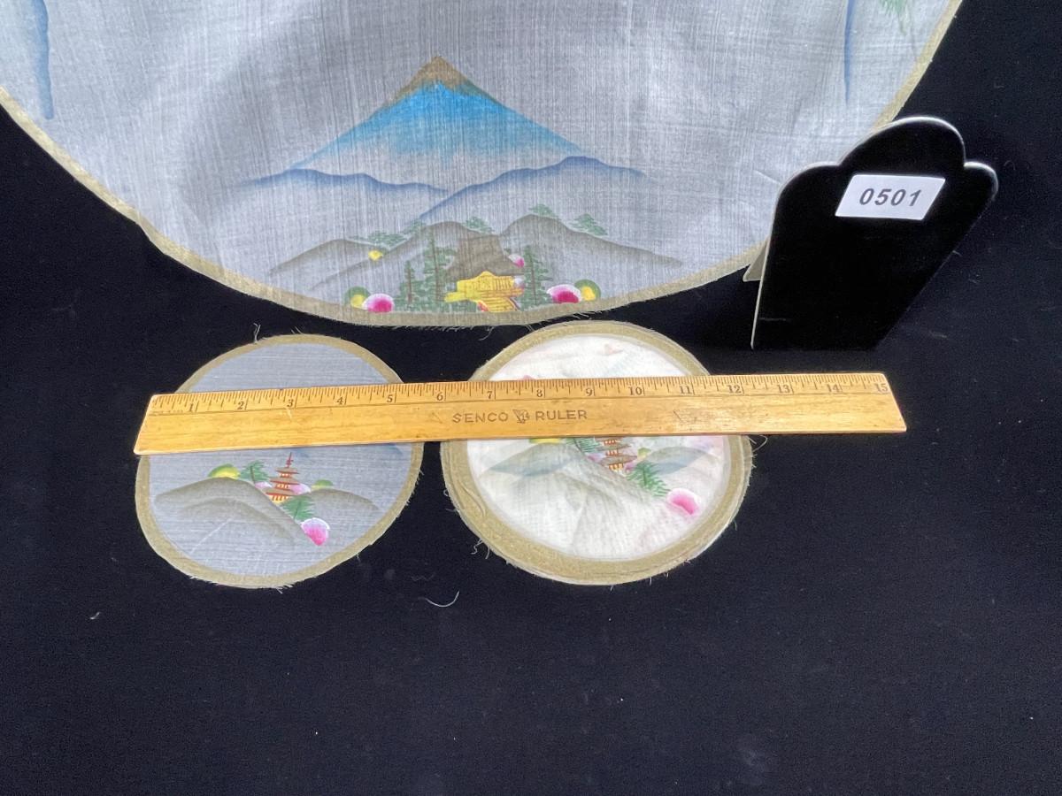 DESCRIPTION: This lot is a Japanese sheer silk “tea cloth” made to dress the table for tea service in a private setting. The cloth has been painted with scenes of Mt. Fuji, and abstracted landscapes. Also included are 4 delicate coasters that are matching pieces. This set is absolutely charming!