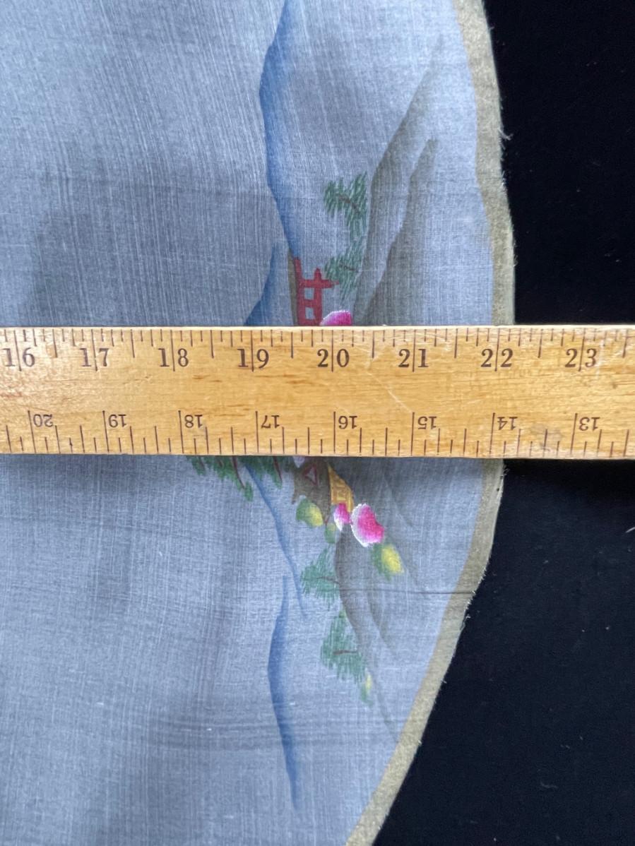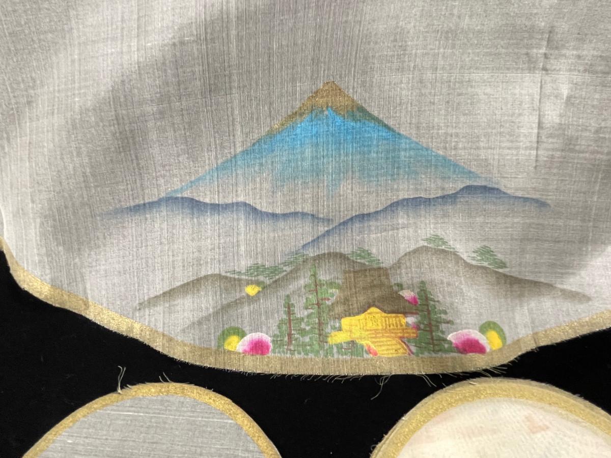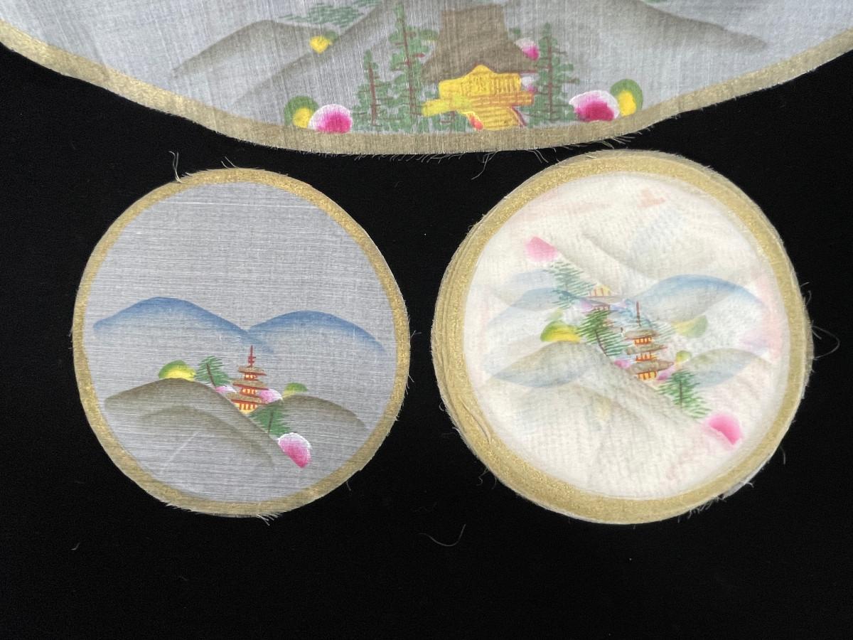 DESCRIPTION: This lot is a Japanese sheer silk “tea cloth” made to dress the table for tea service in a private setting. The cloth has been painted with scenes of Mt. Fuji, and abstracted landscapes. Also included are 4 delicate coasters that are matching pieces. This set is absolutely charming!