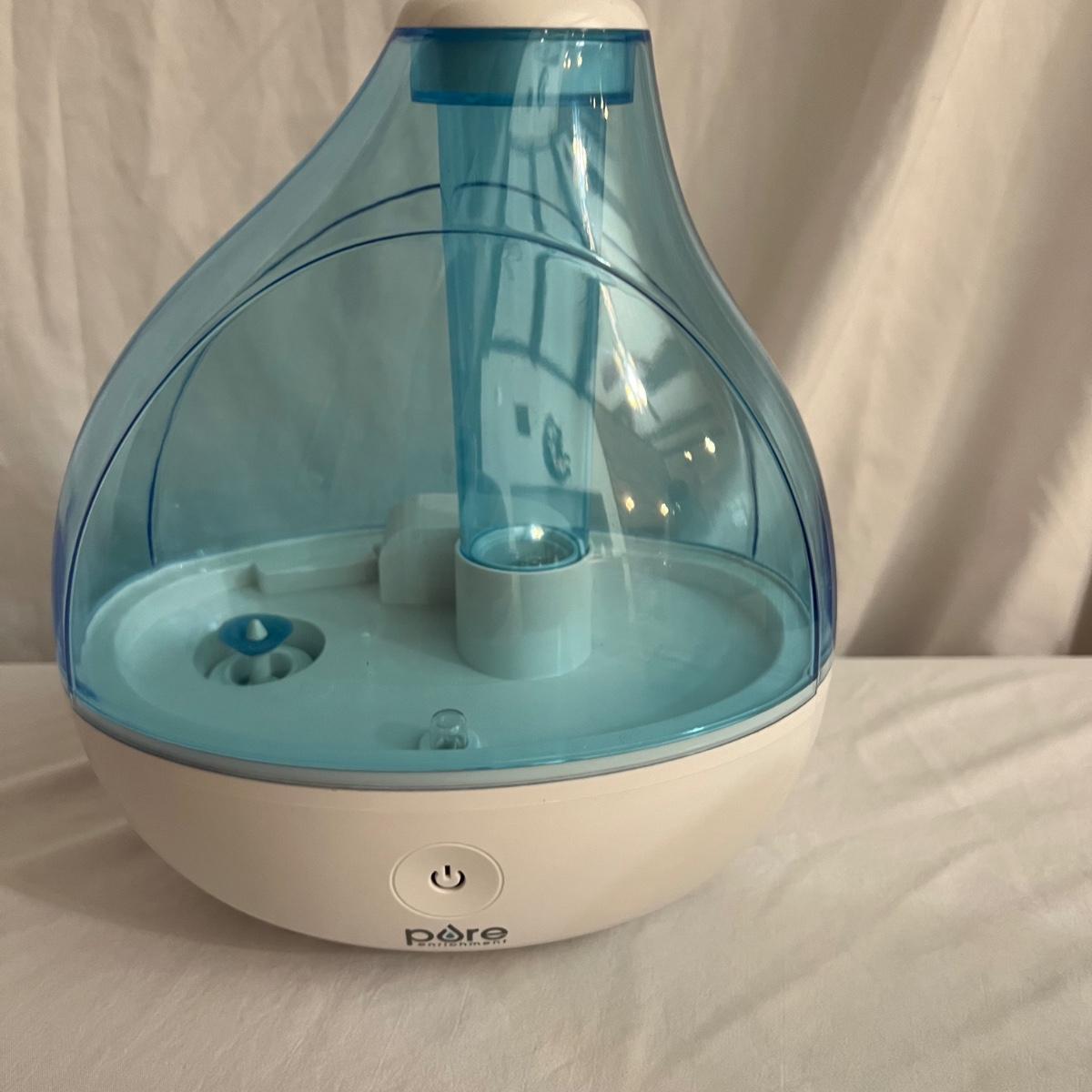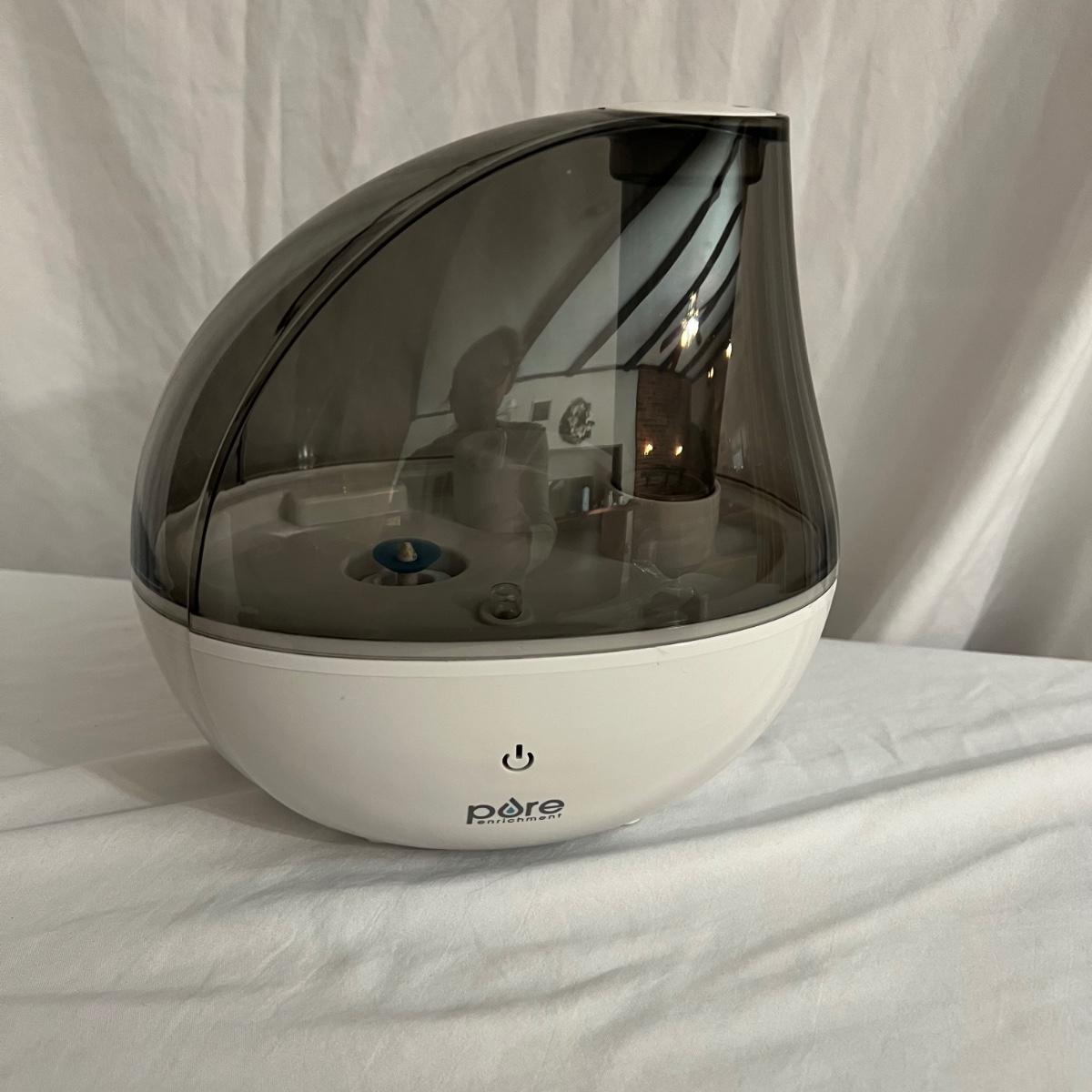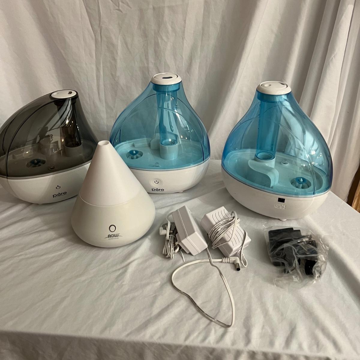 Three Pore Enrichment ultrasonic cool mist humidifiers and one Now Solutions ultrasonic diffuser (aromatherapy & essential oils). The humidifiers measure approximately 9“ x 5“ x 10“H and the diffuser measures 6” in diameter by 7.5”H.