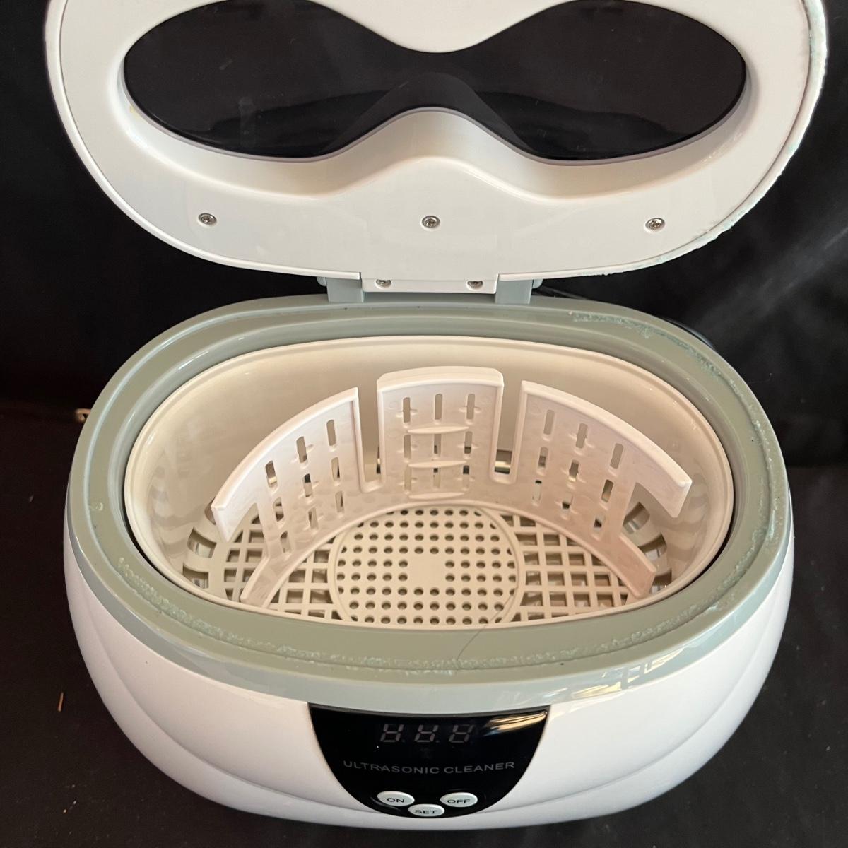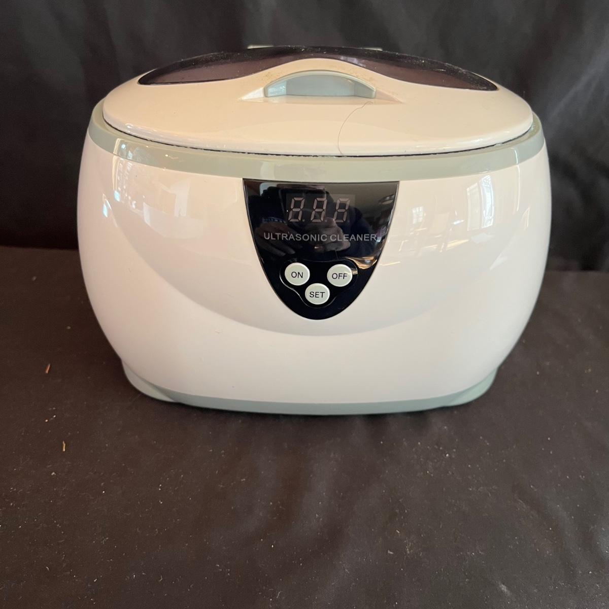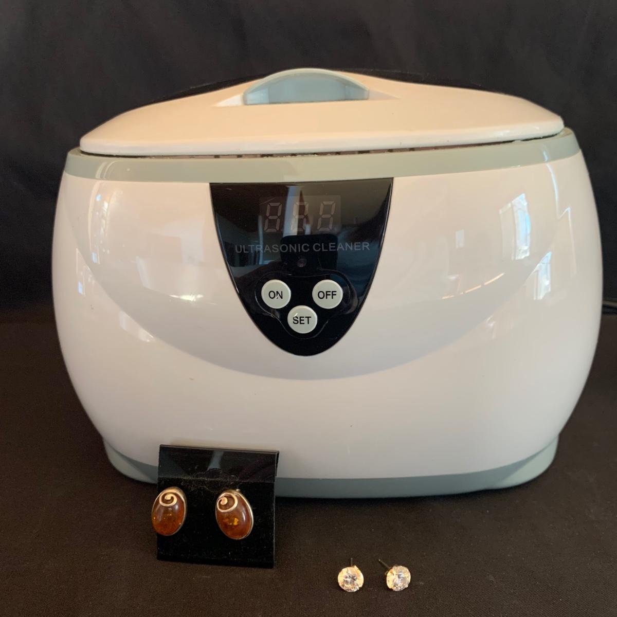 Lot includes an ultrasonic jewelry cleaner that powered on when tested, one pair of faux diamond stud earrings, and a pair of amber post earrings that are marked 925. Cleaner measures 5.5” x 8” x 5.5”.