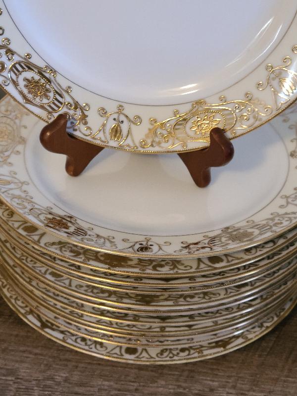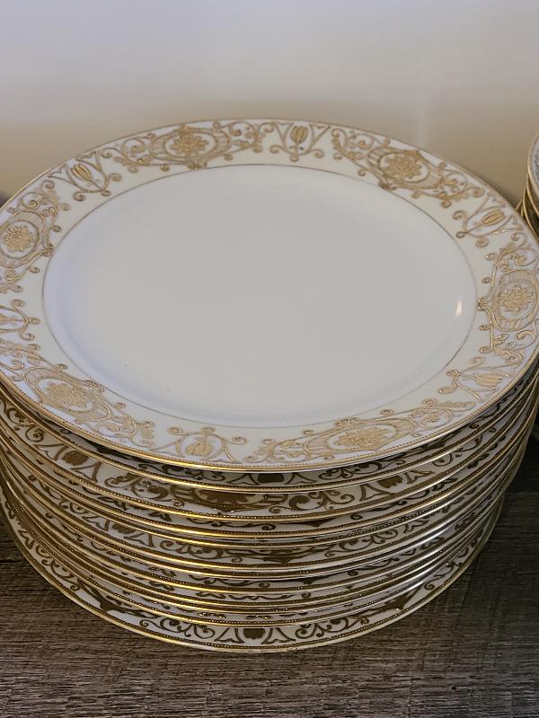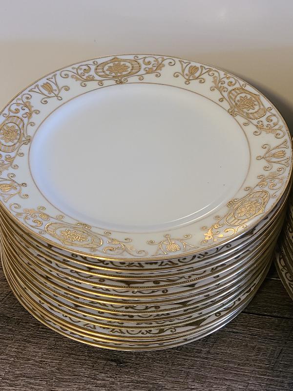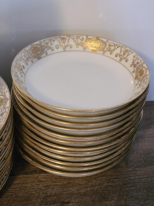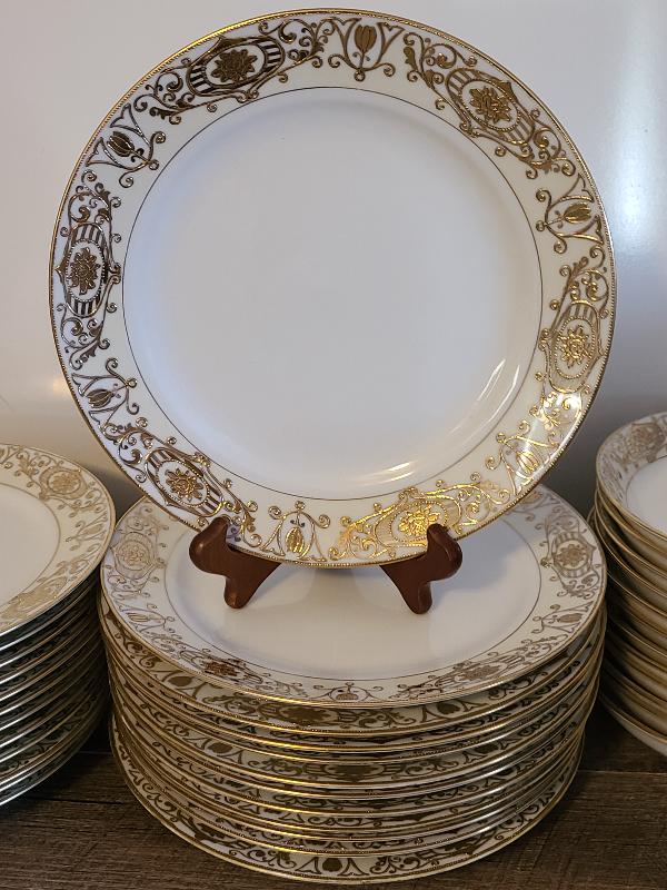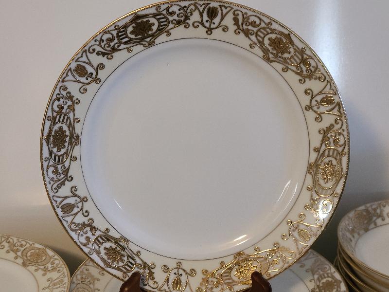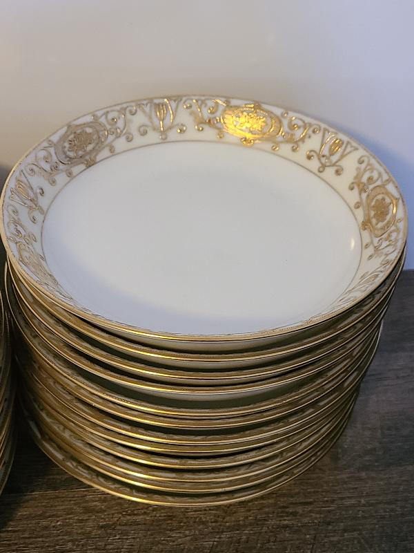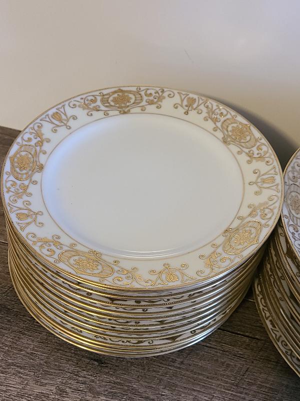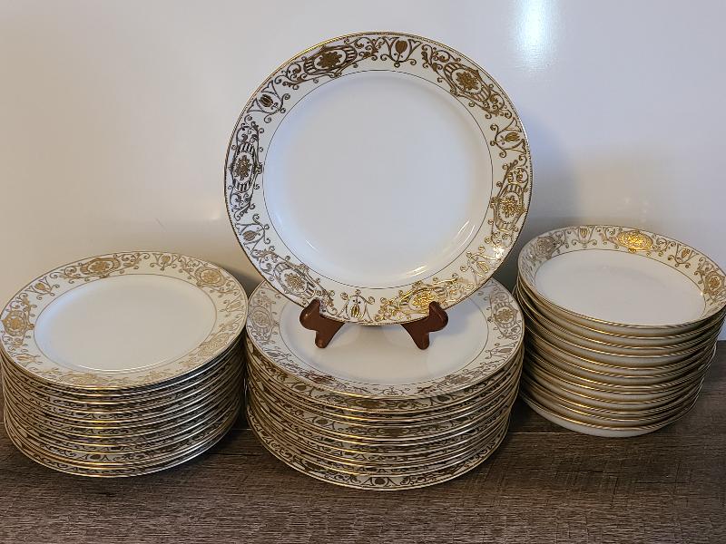 Place setting for 12, Dinner Plates(1 w/chip),Salad Plates & Soup Bowls. Please review all photos. First photo shows all that is in the lot, unless otherwhise noted. All items sold AS IS-WHERE IS. Please bring help for larger lots, and boxes or bags to remove your lots.