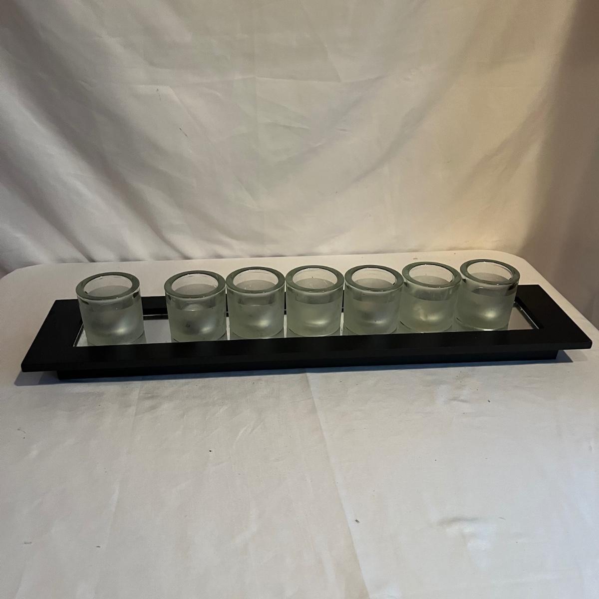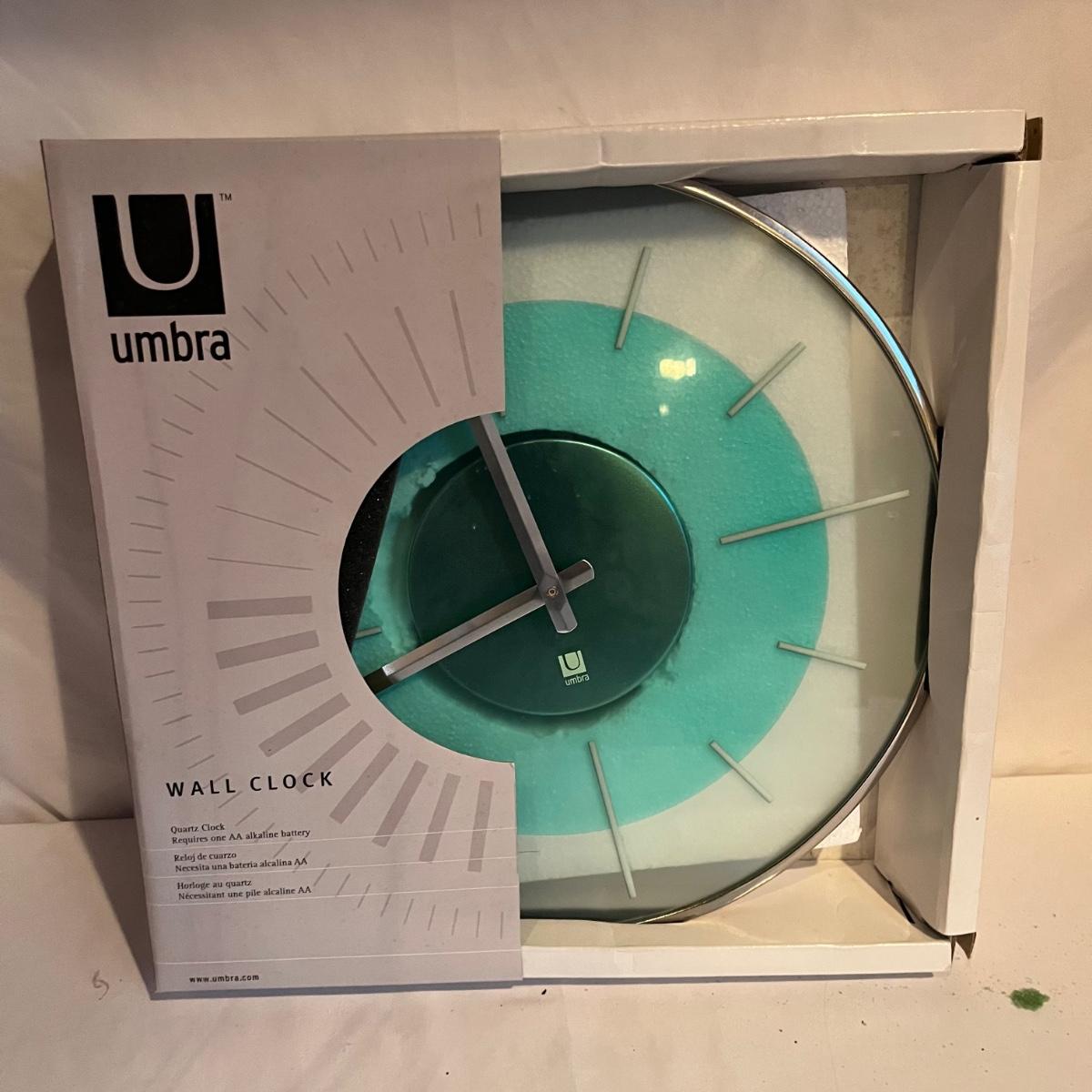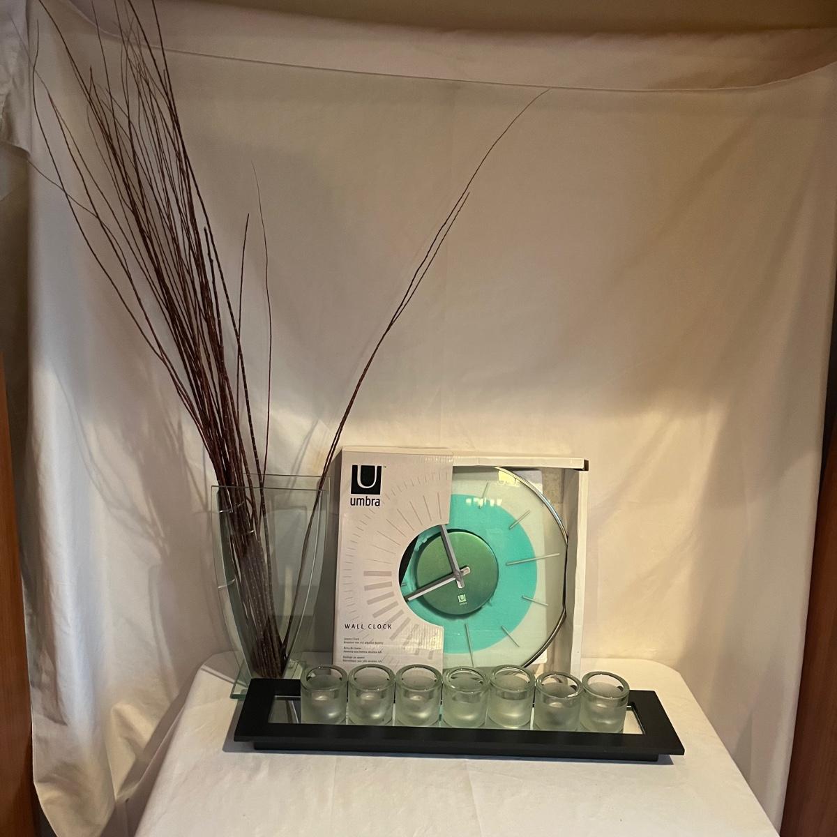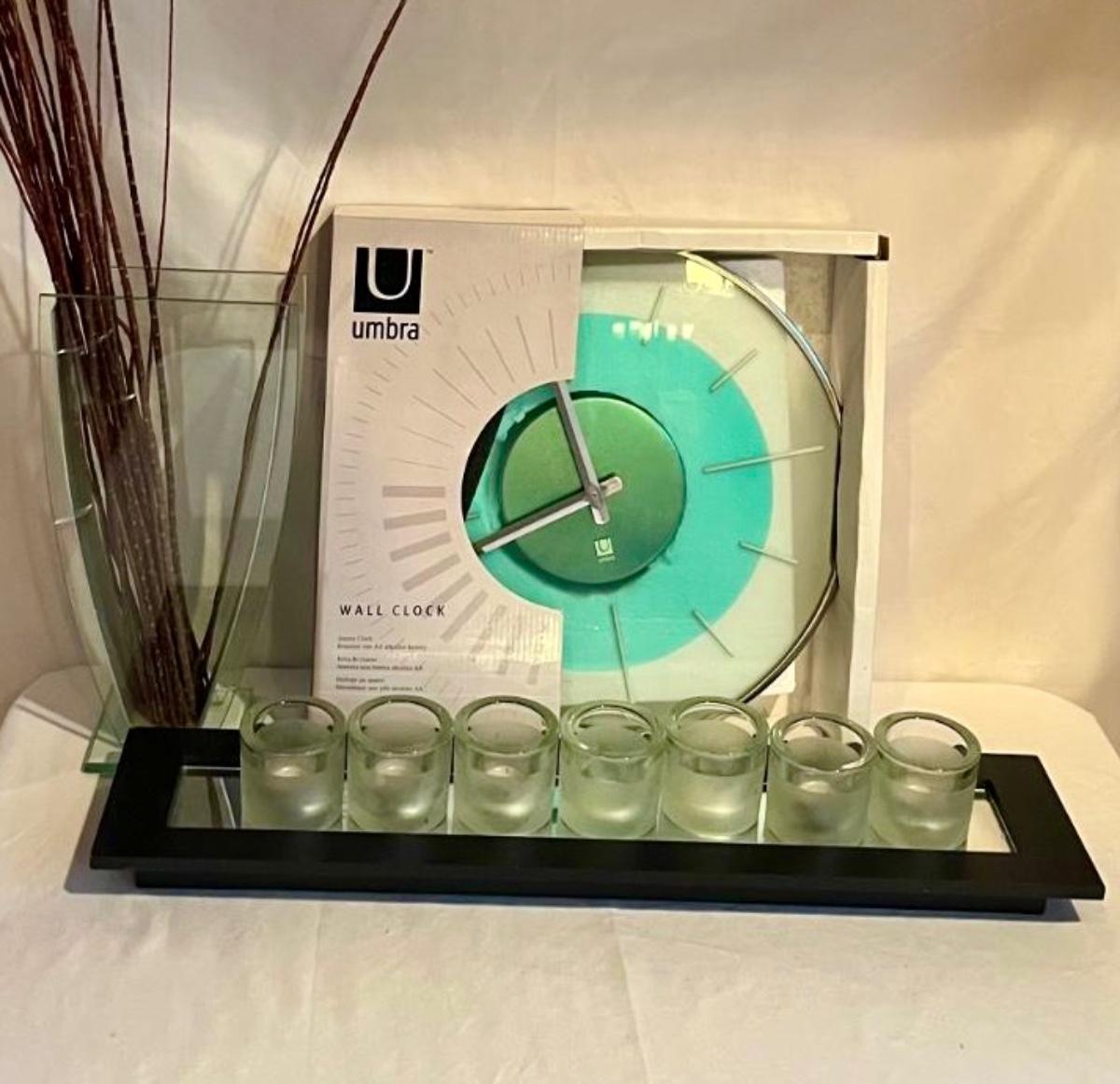 Lot includes an Umbra clock, wooden votive tray with seven glass votive holders and a 13”H glass and metal vase.
