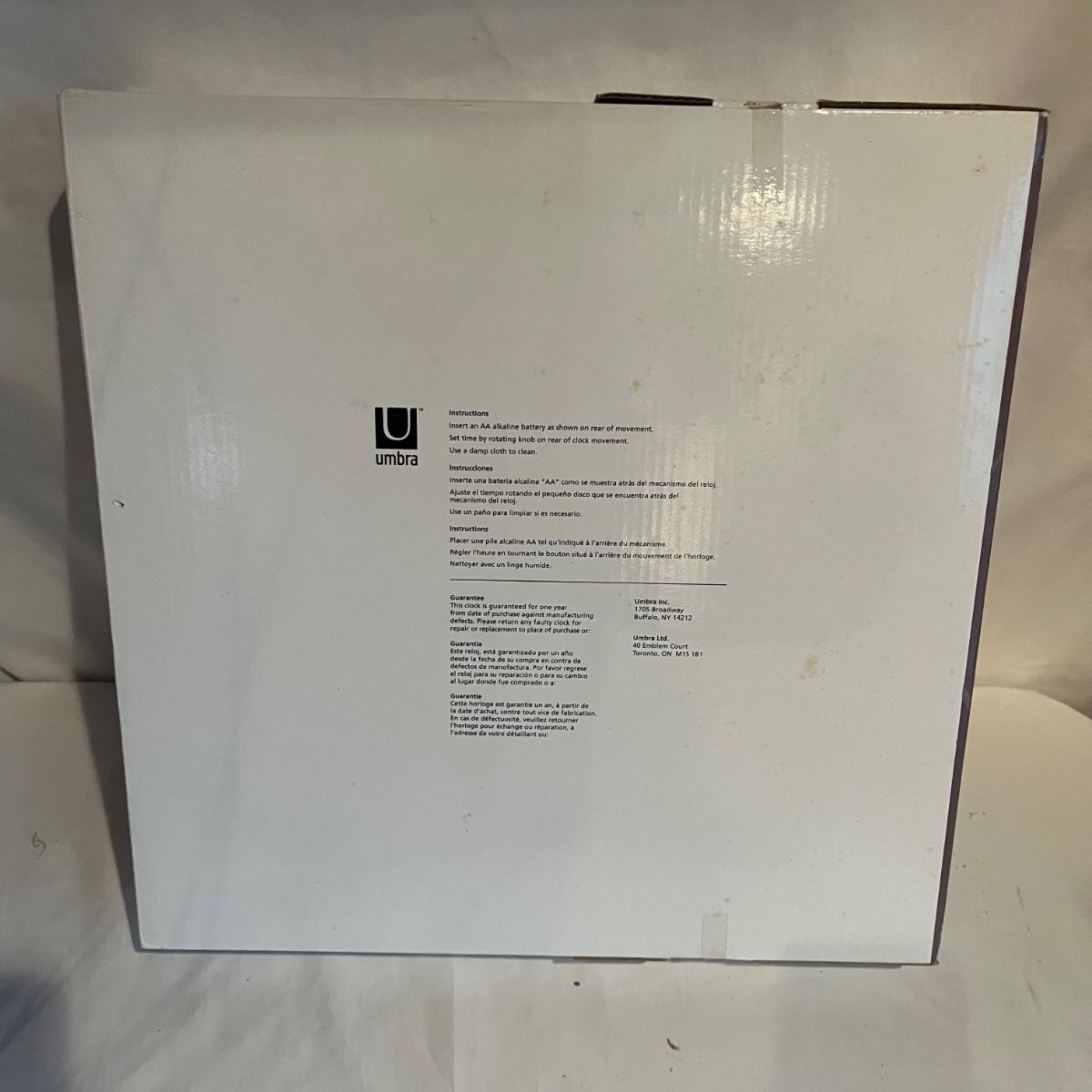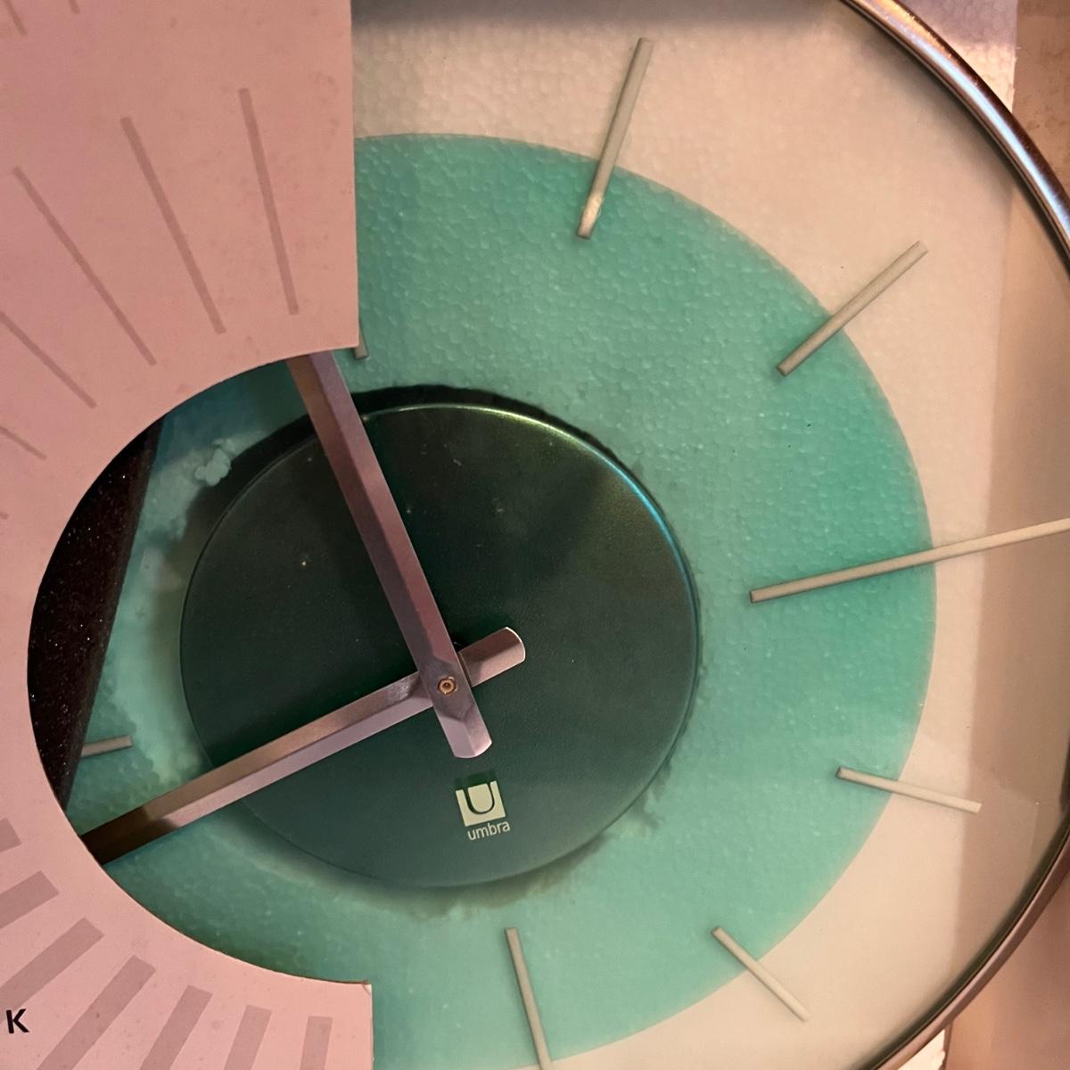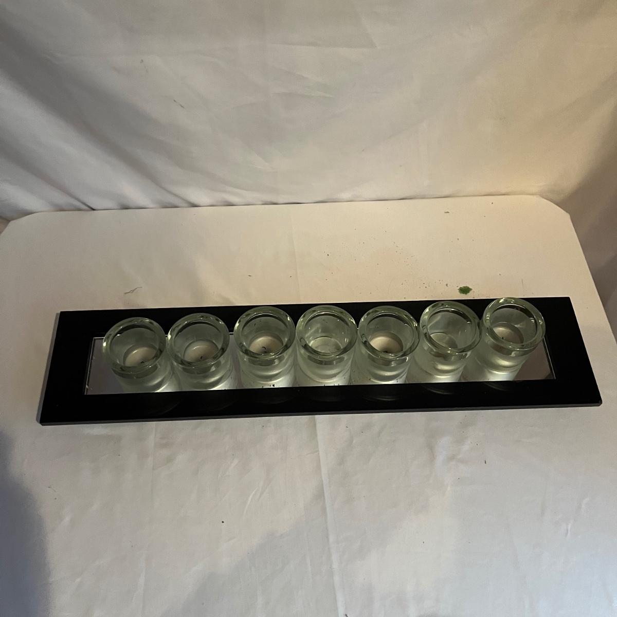 Lot includes an Umbra clock, wooden votive tray with seven glass votive holders and a 13”H glass and metal vase.