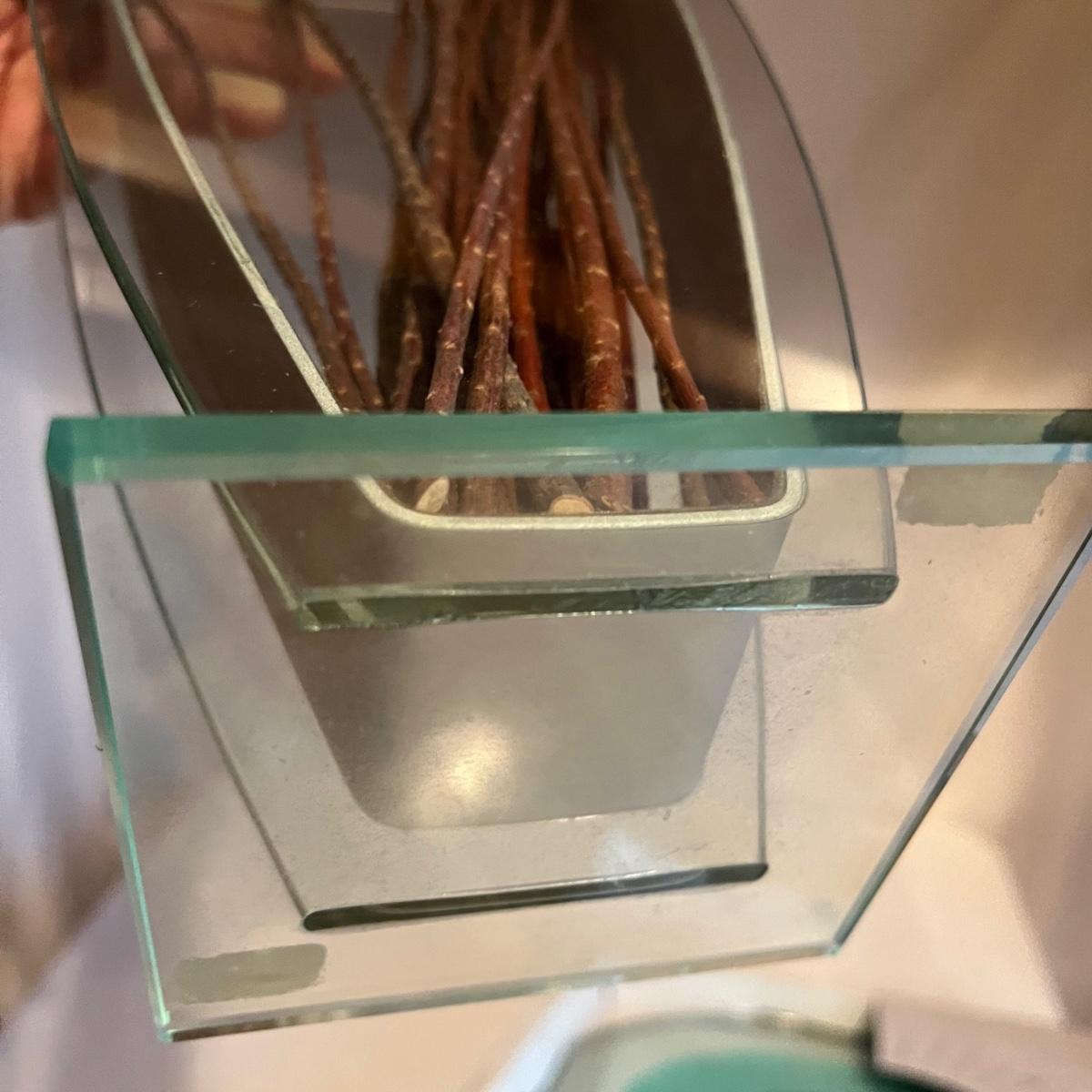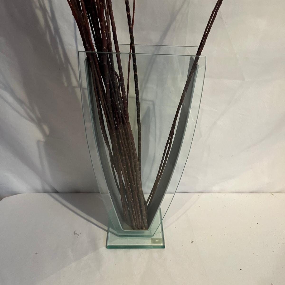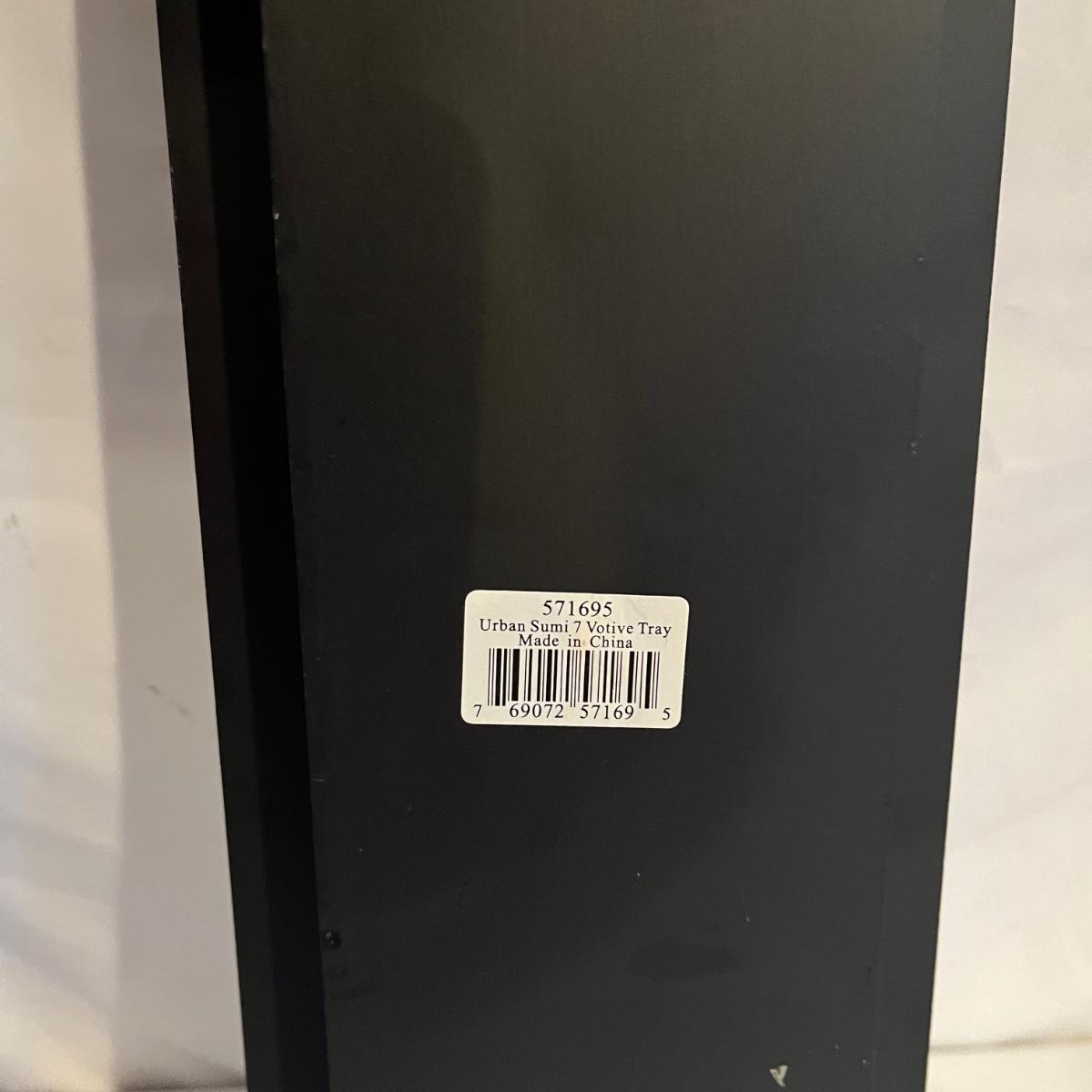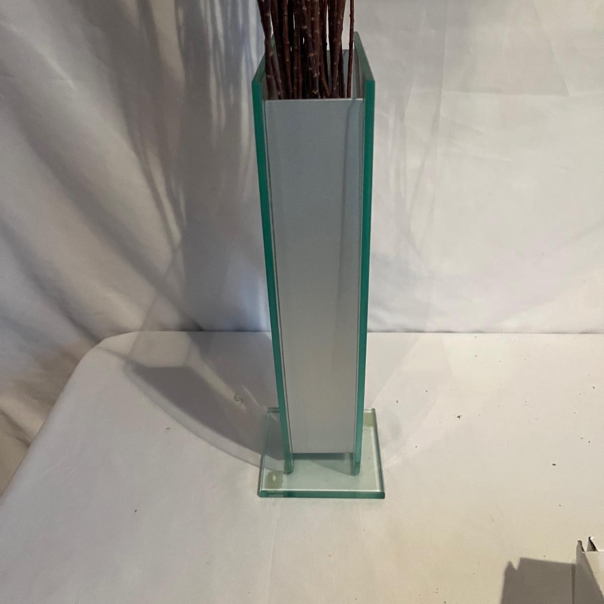 Lot includes an Umbra clock, wooden votive tray with seven glass votive holders and a 13”H glass and metal vase.