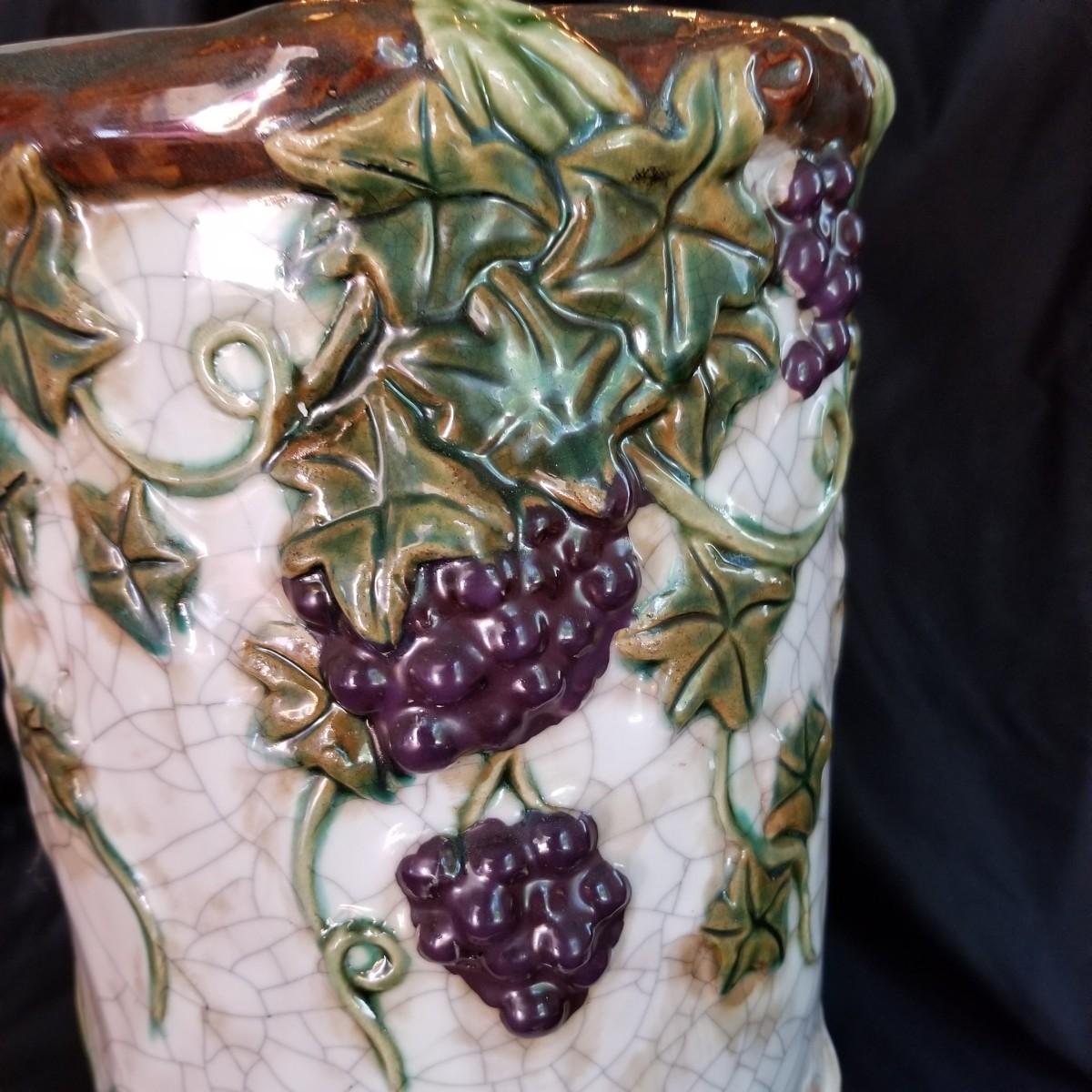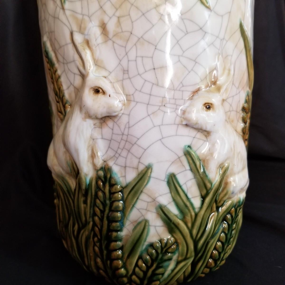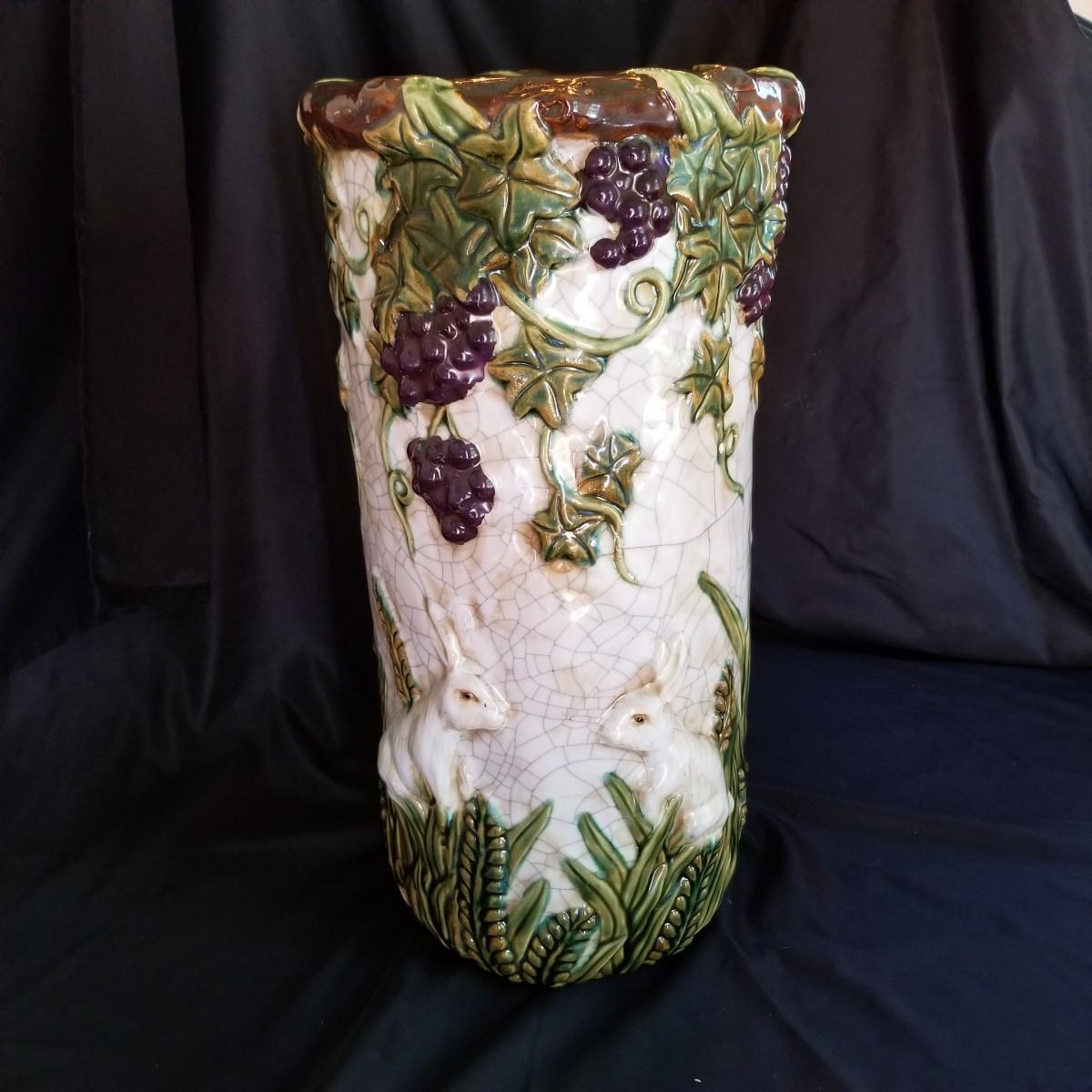 Ceramic umbrella holder with grape leaves/bunny theme. White crackle background with grape and leaves at top, bunnies and grasses at bottom. 17"h x 8"diameter. Some wear on bottom; no visible chips or cracks. Shipping available.