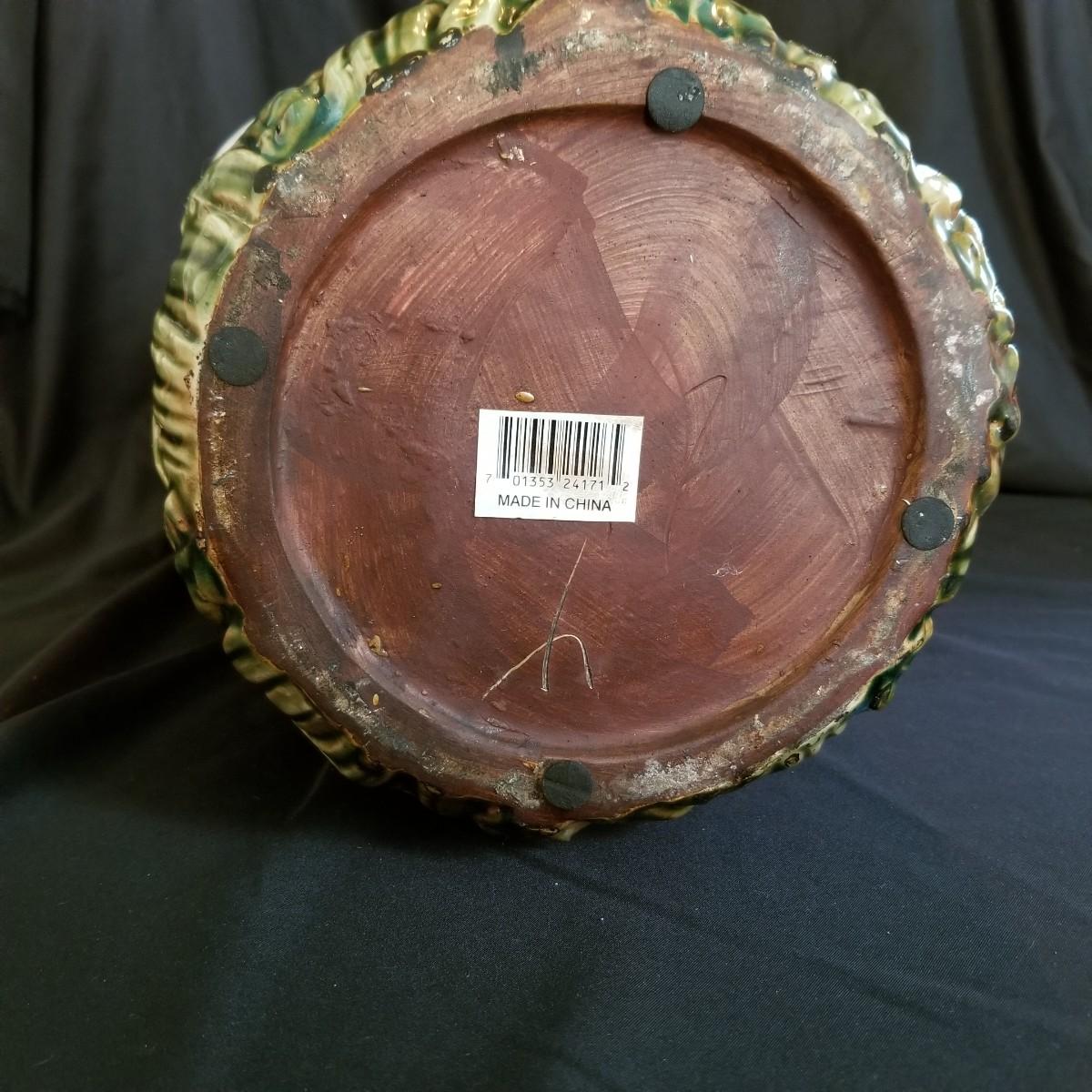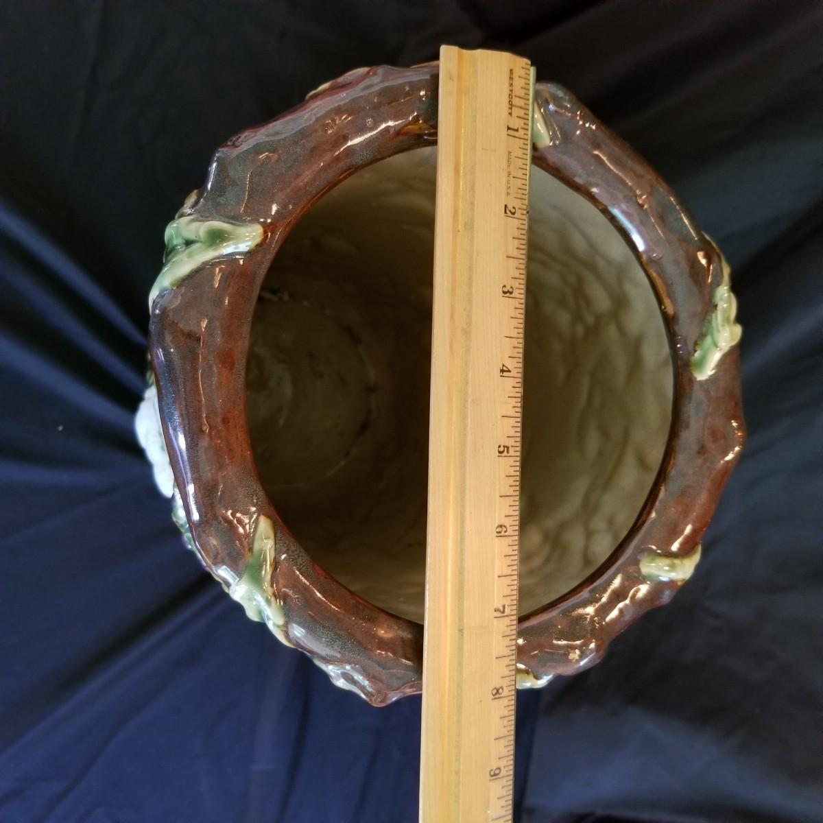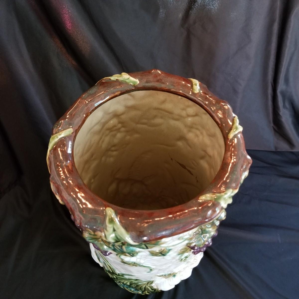 Ceramic umbrella holder with grape leaves/bunny theme. White crackle background with grape and leaves at top, bunnies and grasses at bottom. 17"h x 8"diameter. Some wear on bottom; no visible chips or cracks. Shipping available.