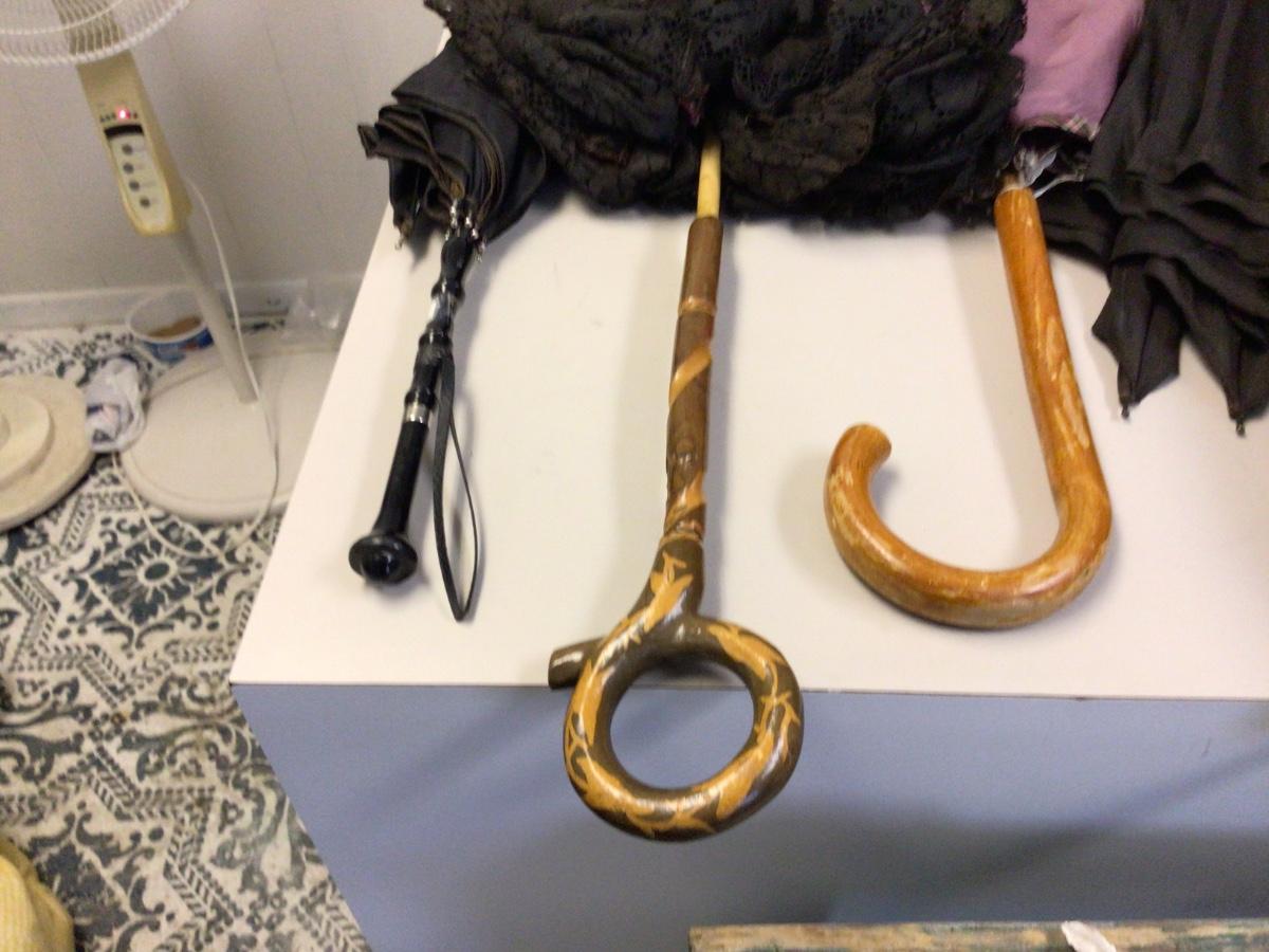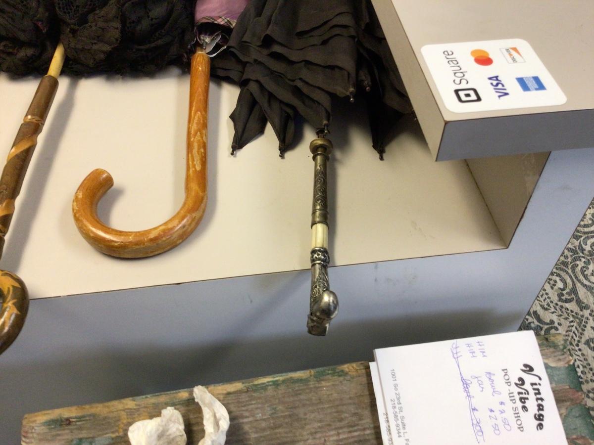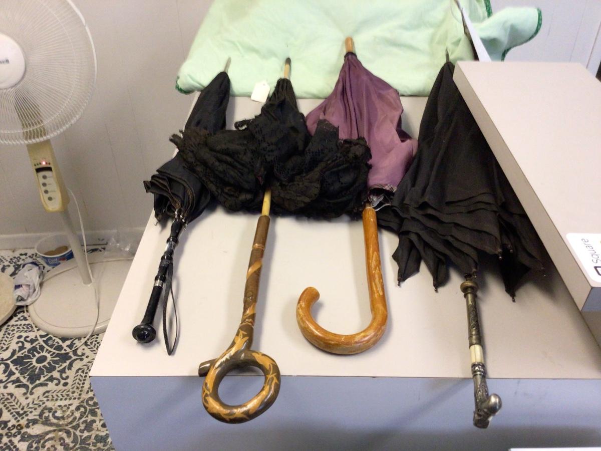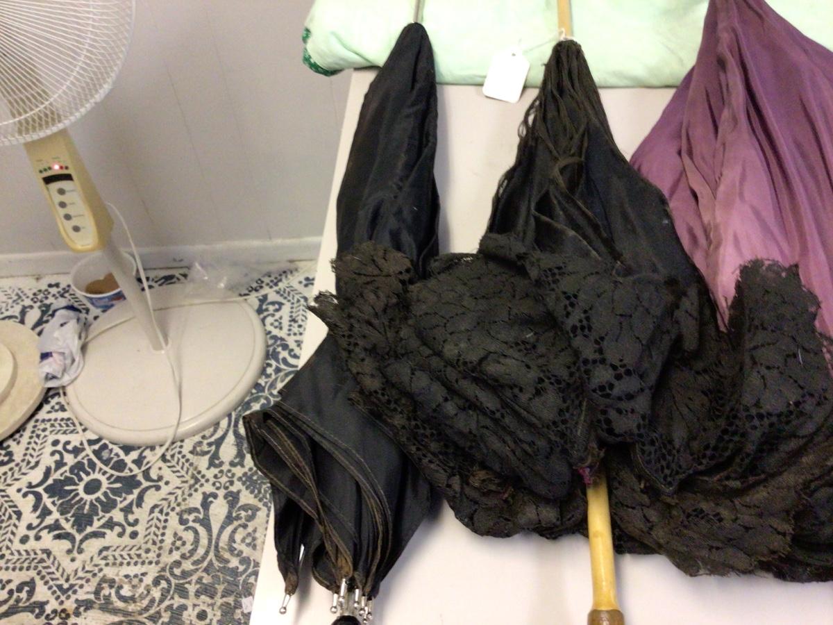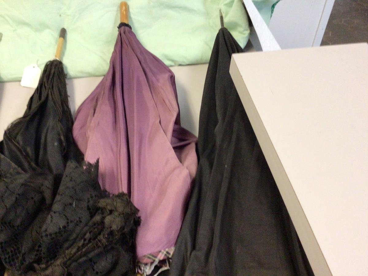 This is a great set of 4 vintage umbrella. Two have wood handles, and two metal handles. three are black, and one is plum color.