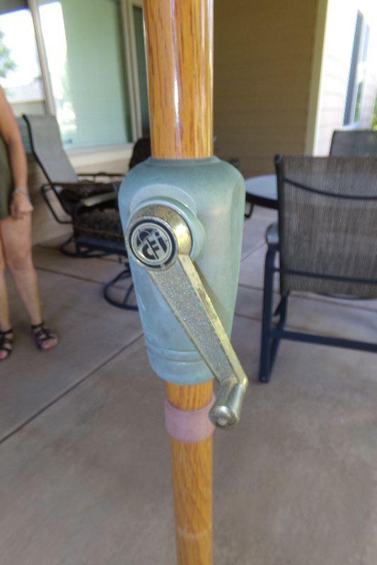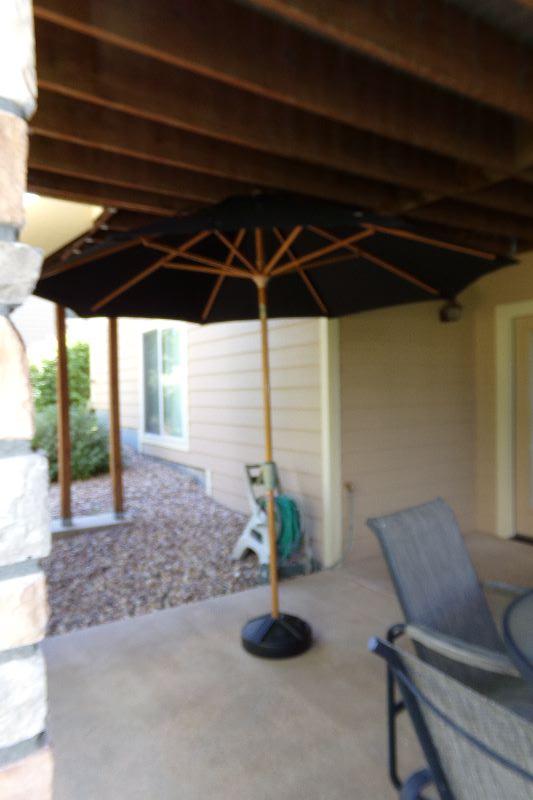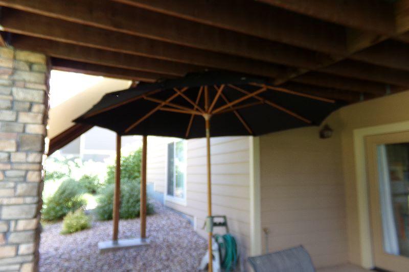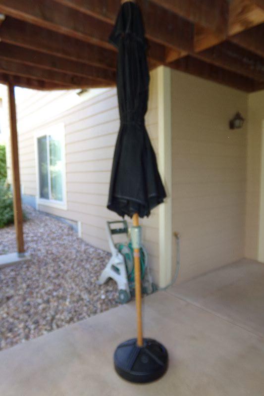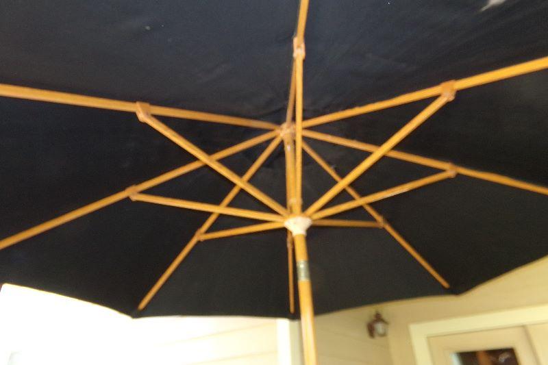 Nice wood framing with black cover. Plastic umbrella holder that you fill with water or sand