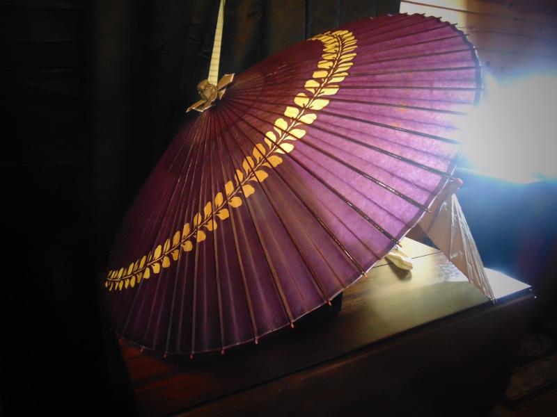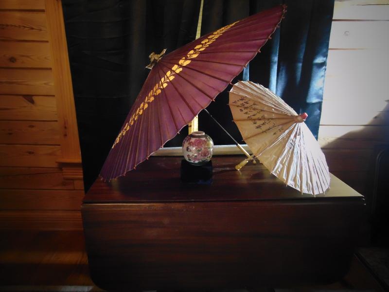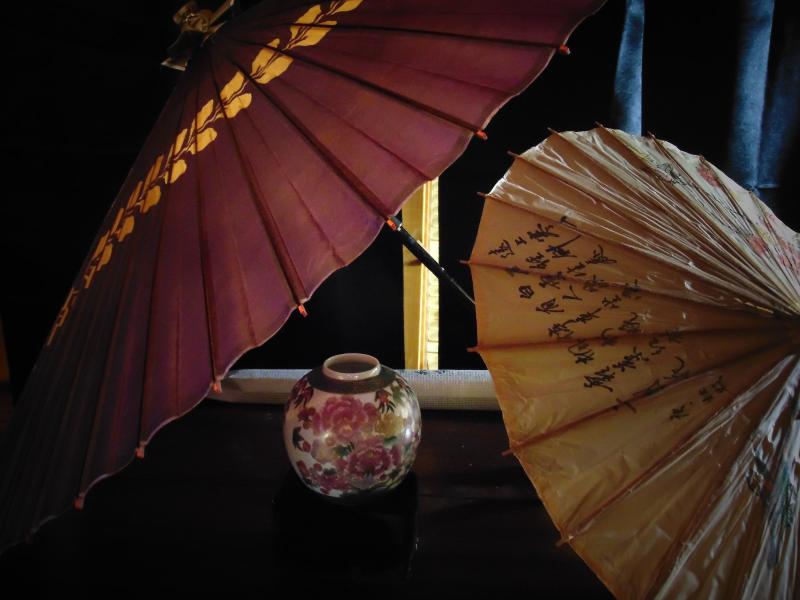 Vase and two oriental paper umbrellas