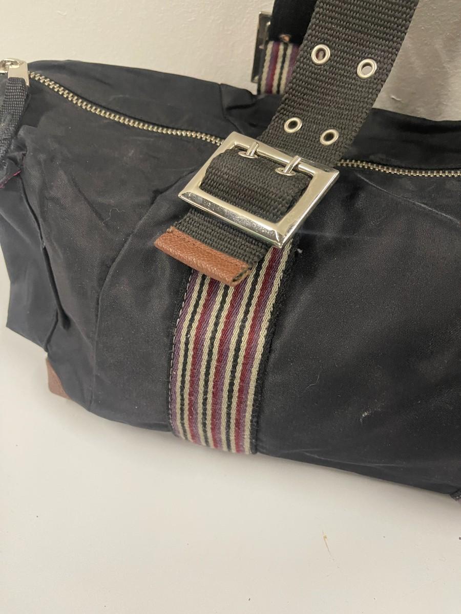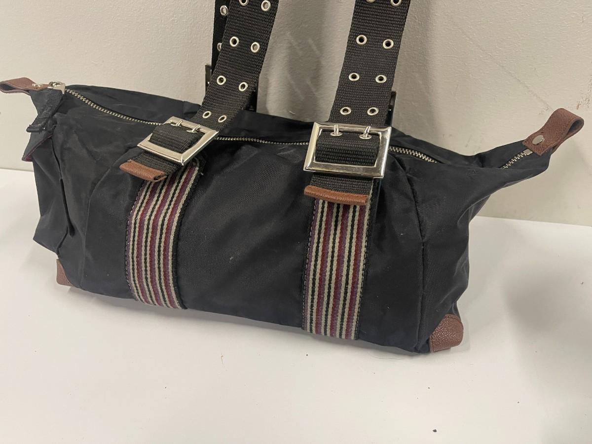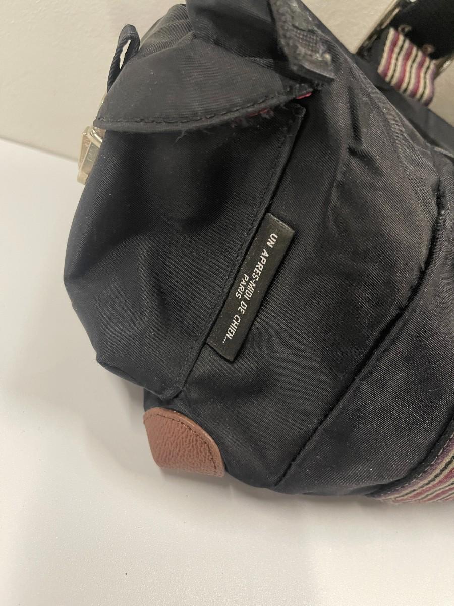 Un Apres Midi De Chien handbag. Lightweight nylon bag with canvas handles. Very good condition. Two interior pockets with one exterior side pocket. Very good condition. 7" x 14" wide.