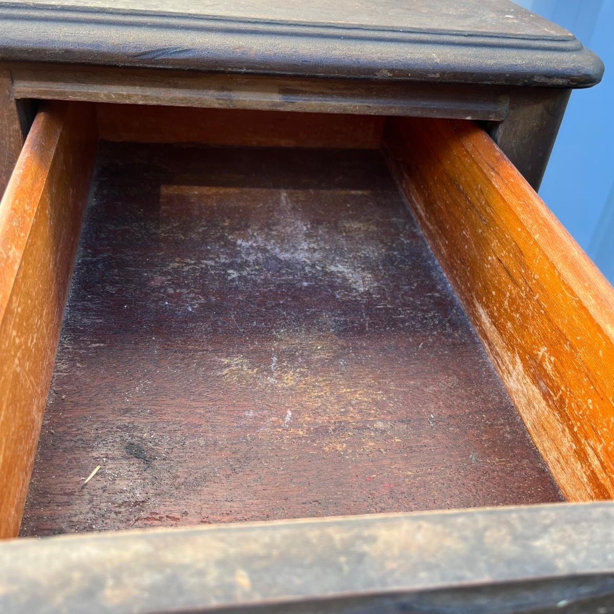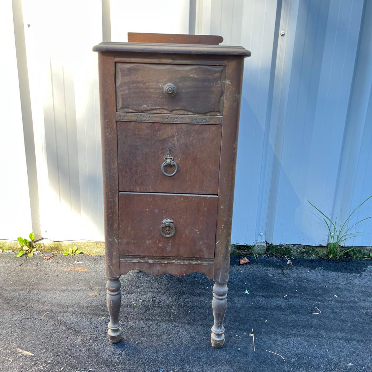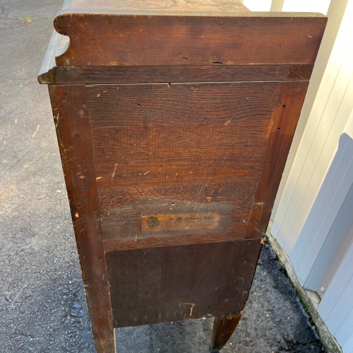 Lot includes a Unagusta #600 combination walnut three dovetailed drawer cabinet. Cabinet has scratches and nicks and the veneer is coming loose on drawers, see pictures. Cabinet measures 14” x 18” x 33”.