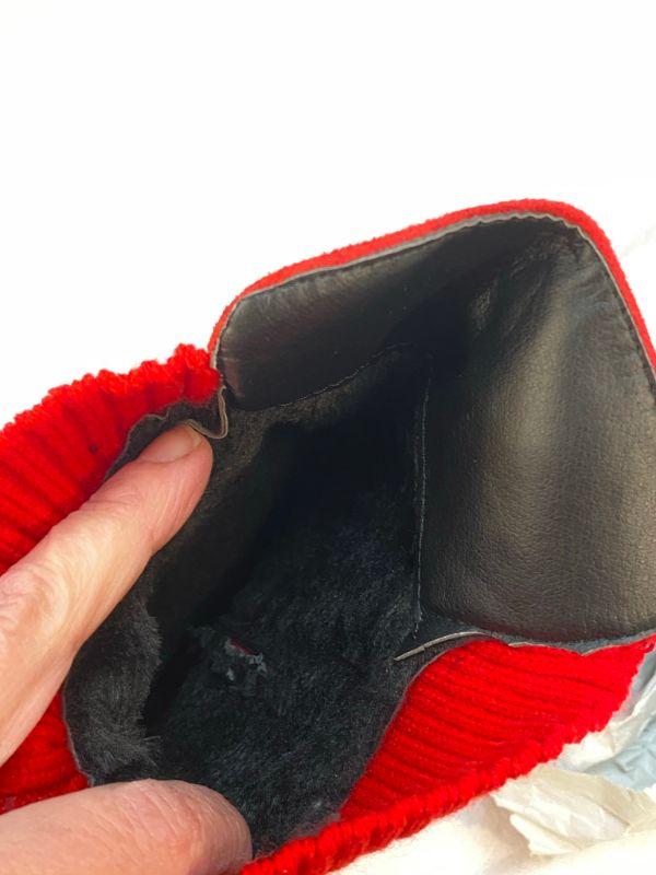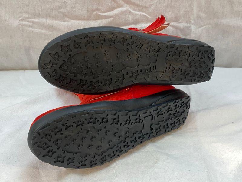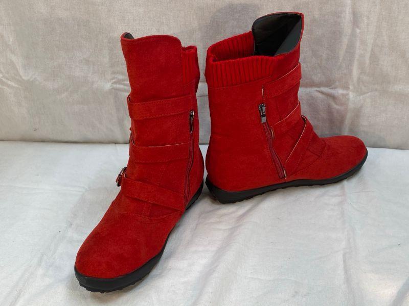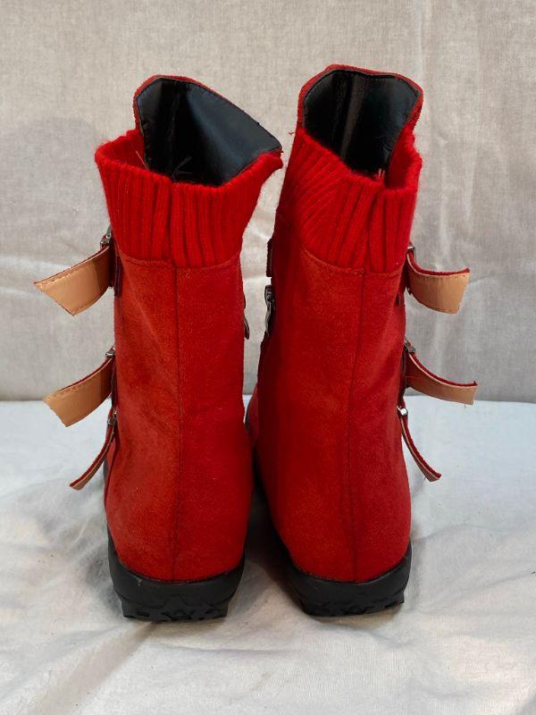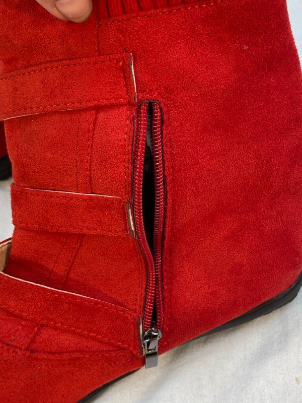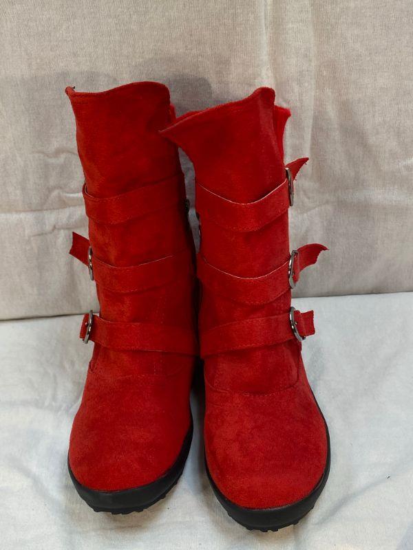 Unbranded red boots. Faux suede strappy buckle look. Faux fur inside. Could not find a size gonna guess 8.5 only from all the other shoes being that size. inside zipper for easy on and off. In good condition. light use.
