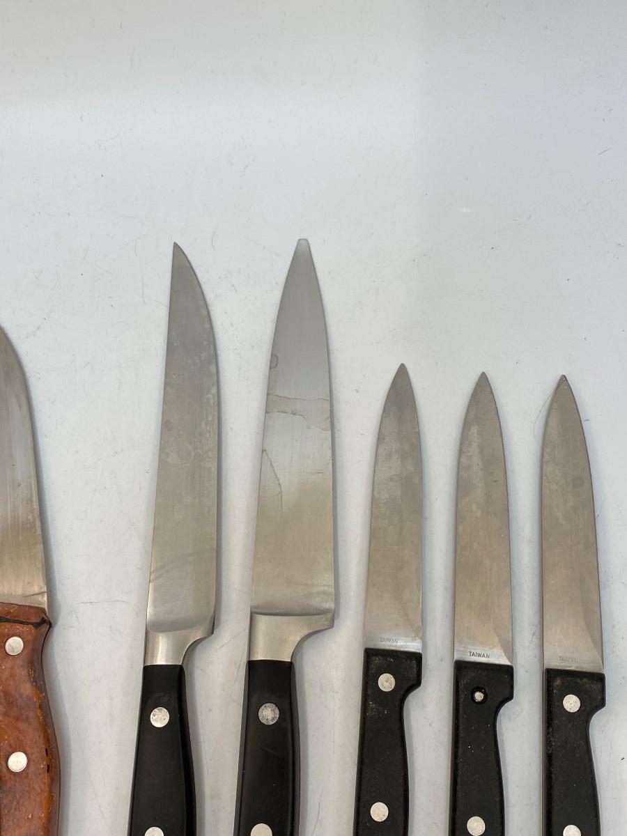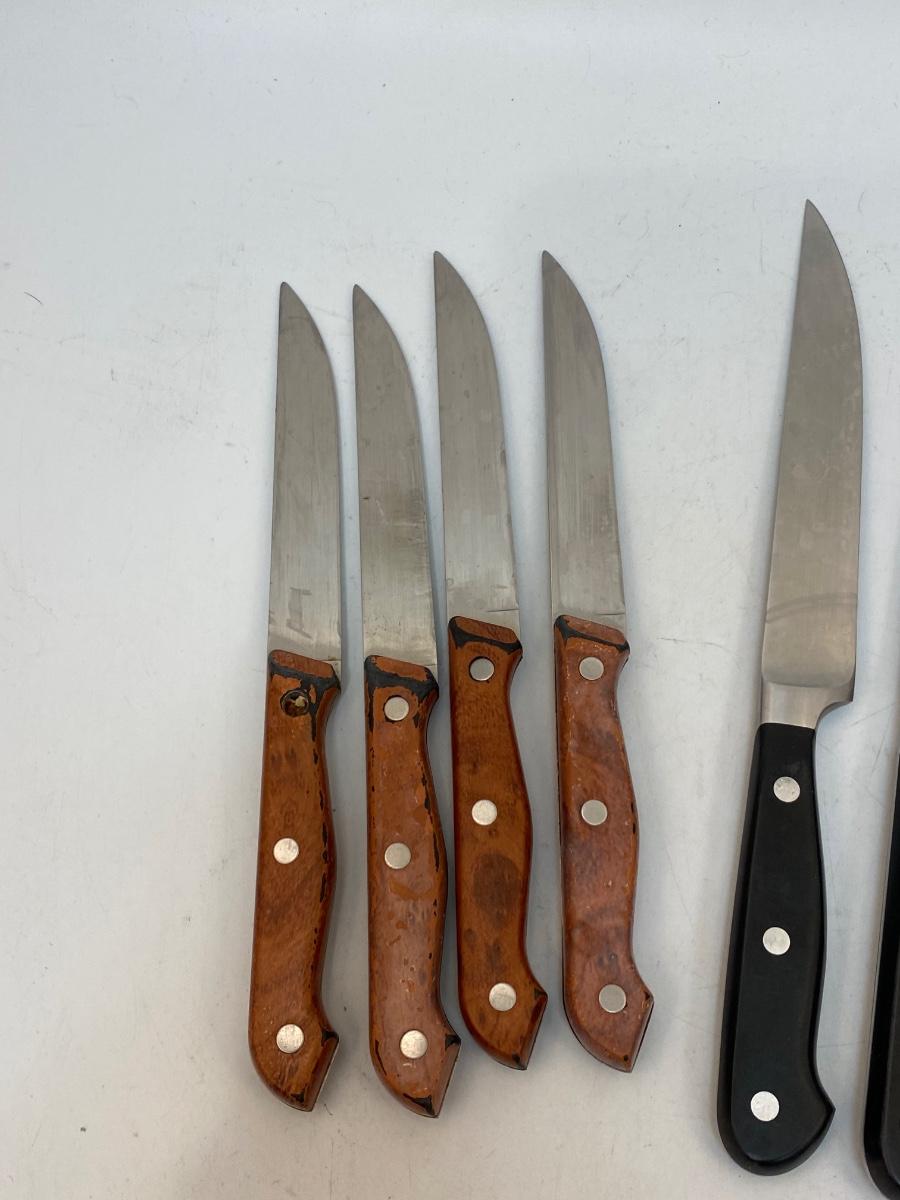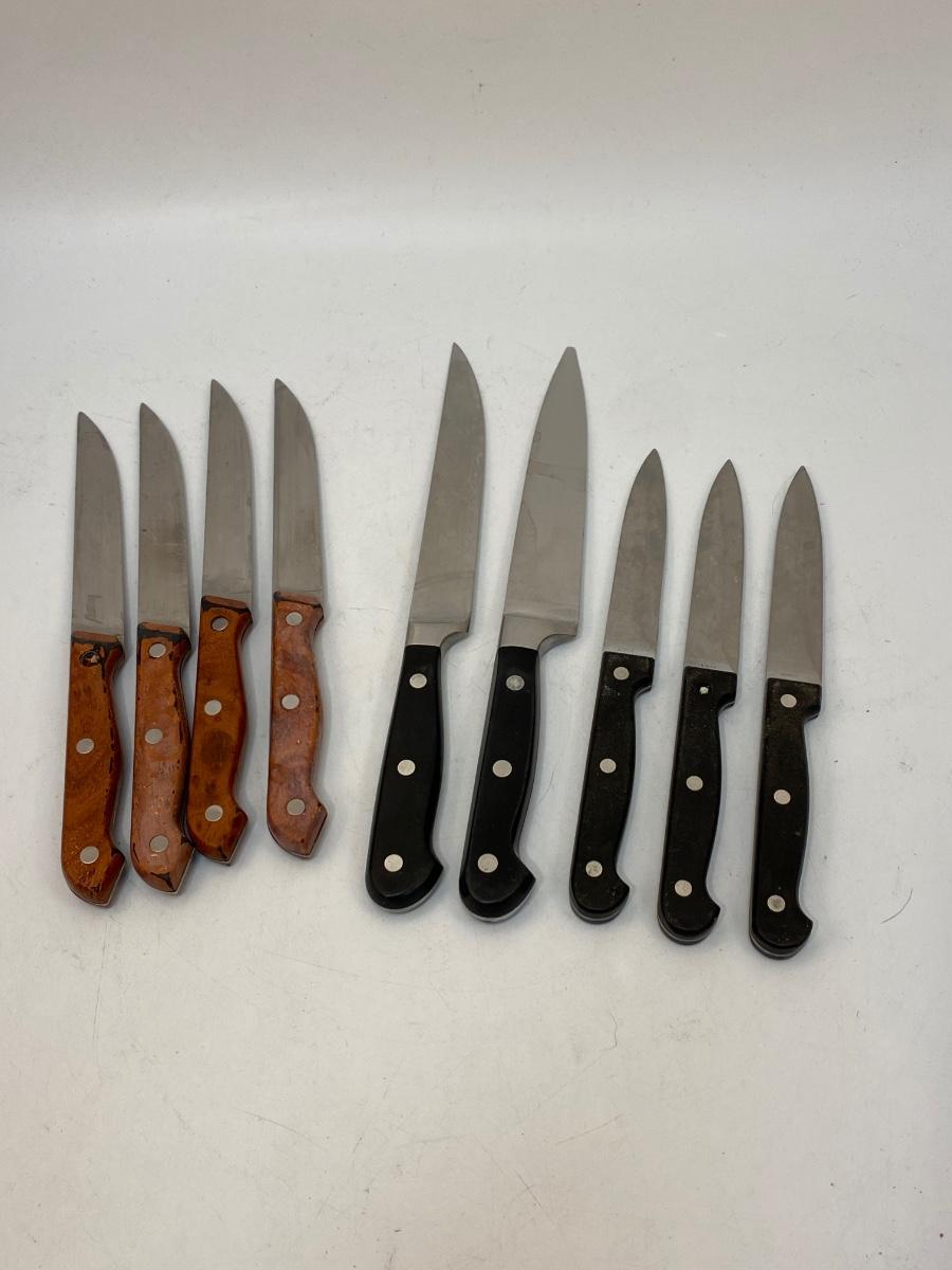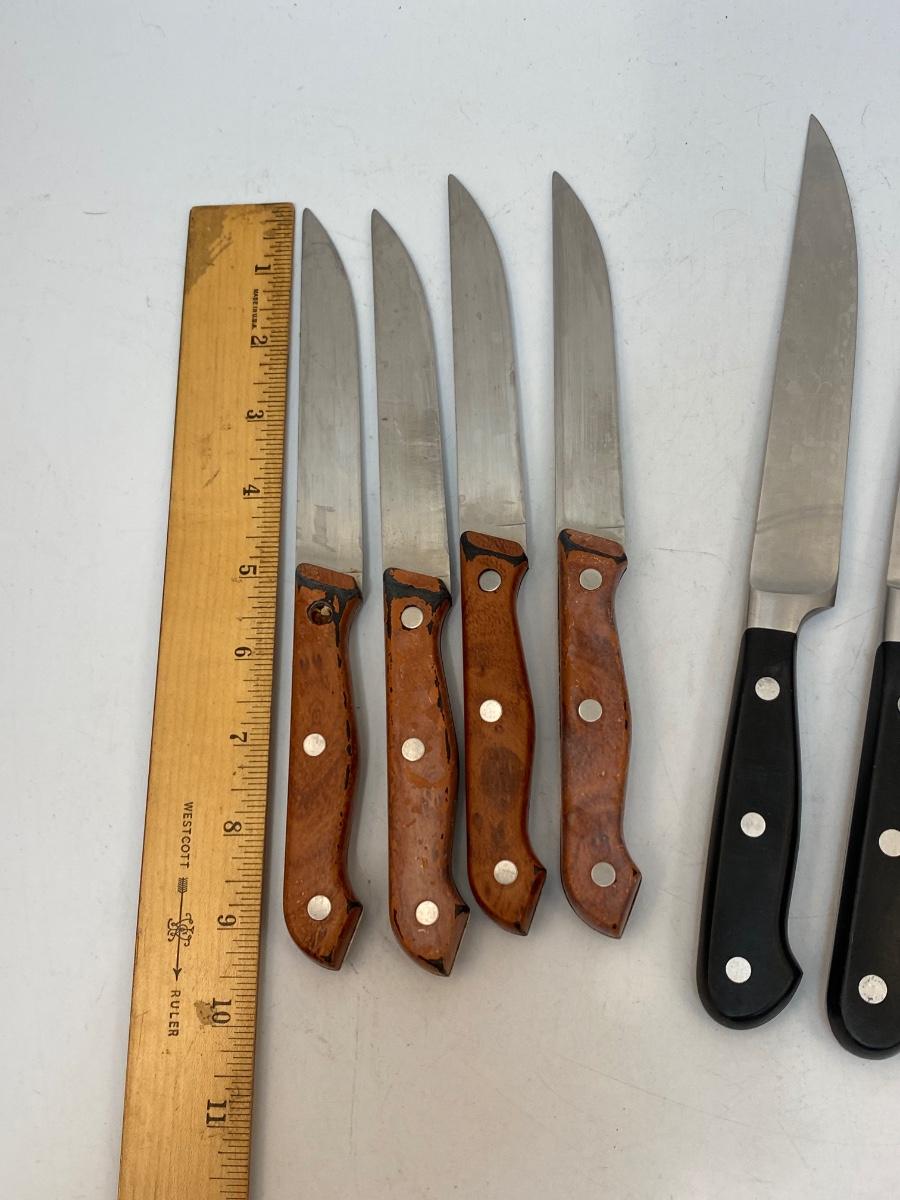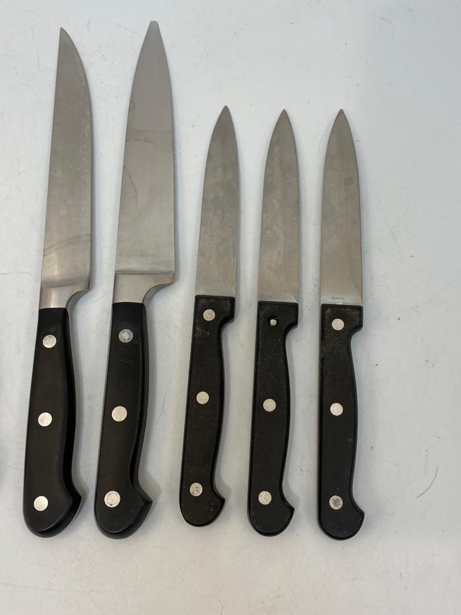 Unbranded Steak Knives Cutlery. The black handle knives are sturdy although the tip is broken on one. Need to be sharpened.