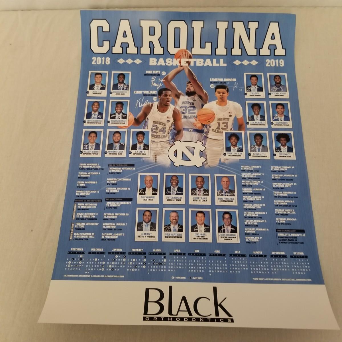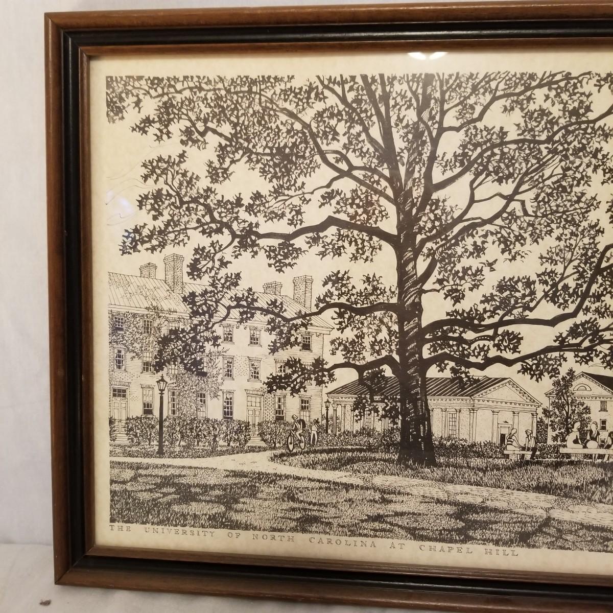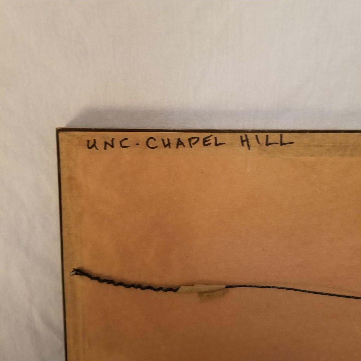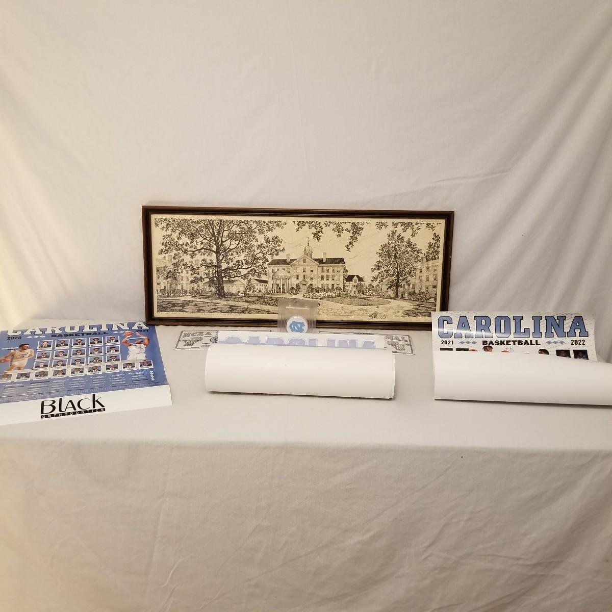 The wood framed print of the UNC Chapel Hill Campus and Old Well and is 39"x15.5", that appears to be pencil signed by artist Ahern, 1980. There is also a great collection of UNC items including basketball calendar posters, license plates, medallions. Calendars are from 2010-2014, 2016-2018, 2020 and 2021. Most all measure 18"x25", the 2016 is 12.5" x27". All items in fair to good condition, see photos for details. Shipping available. Shipping Art can be costly please call UPS store at 828-252-6930 for quote.