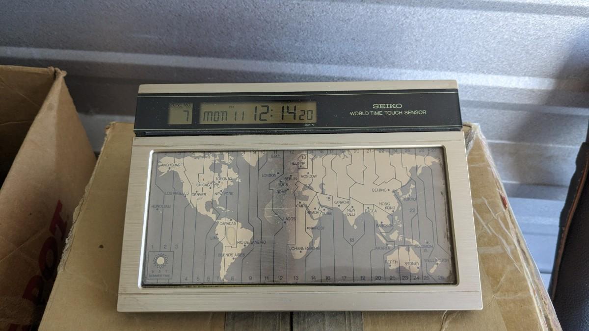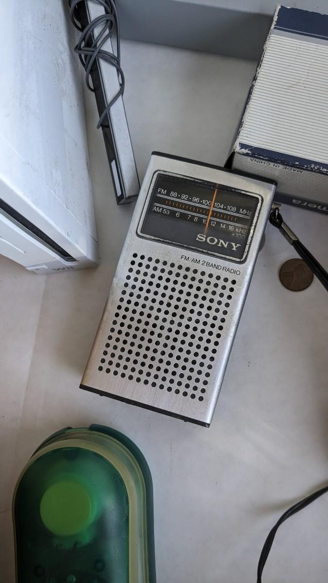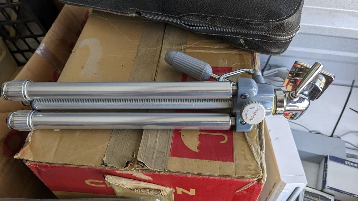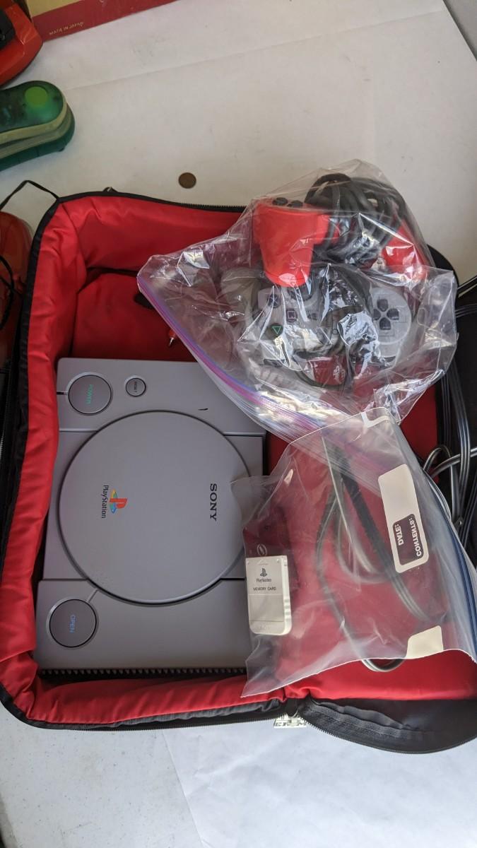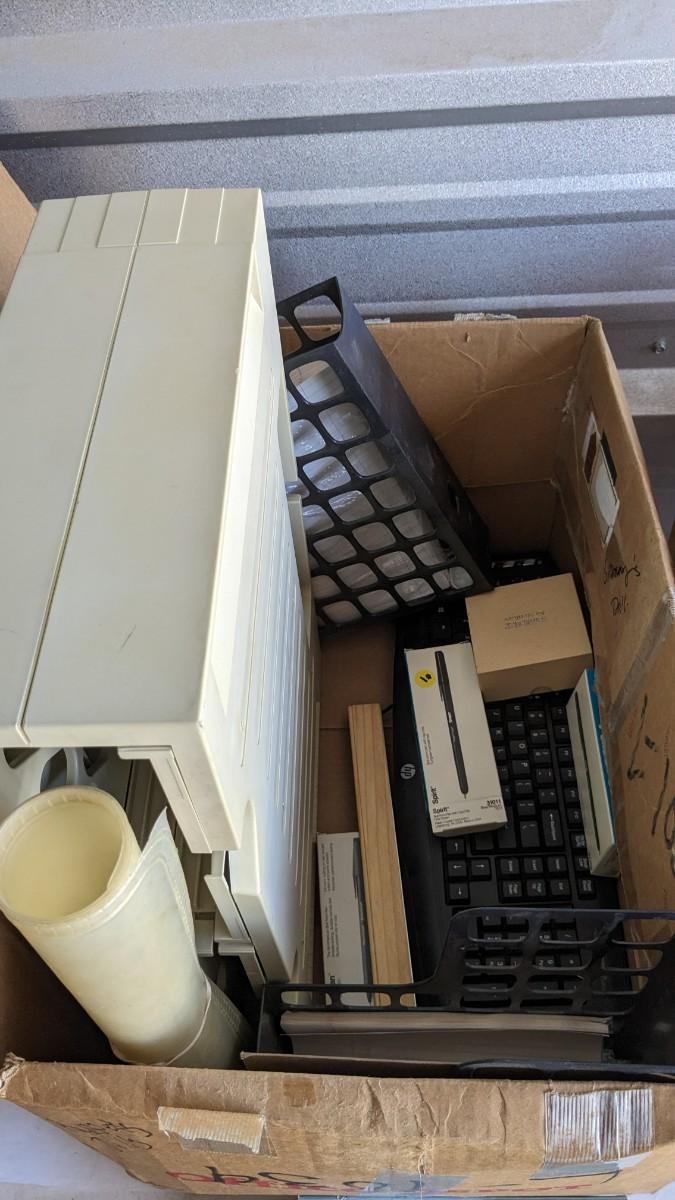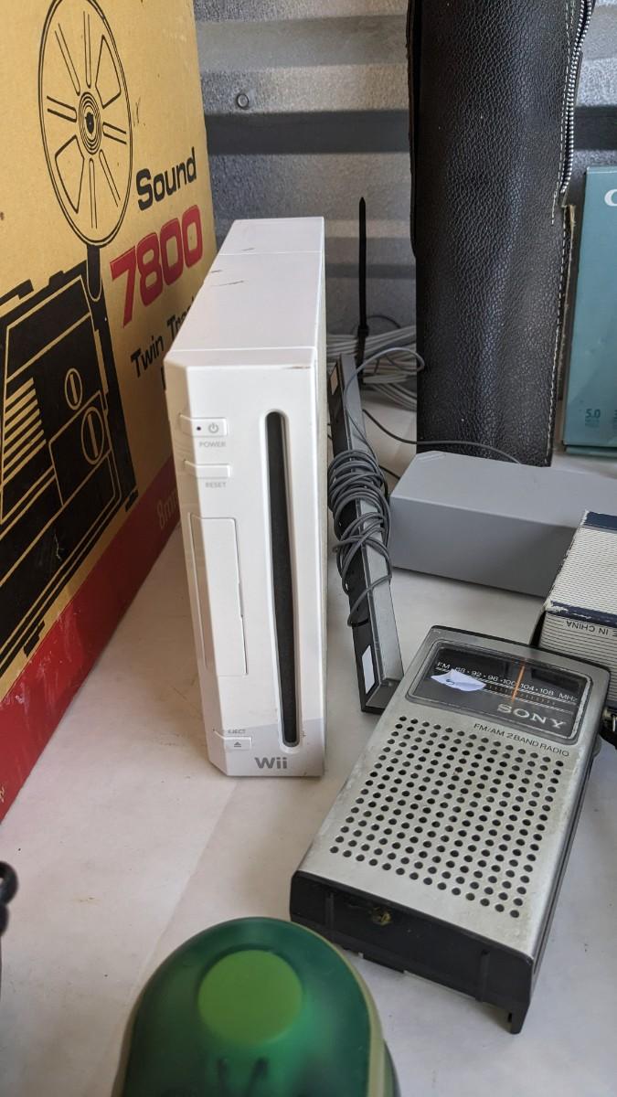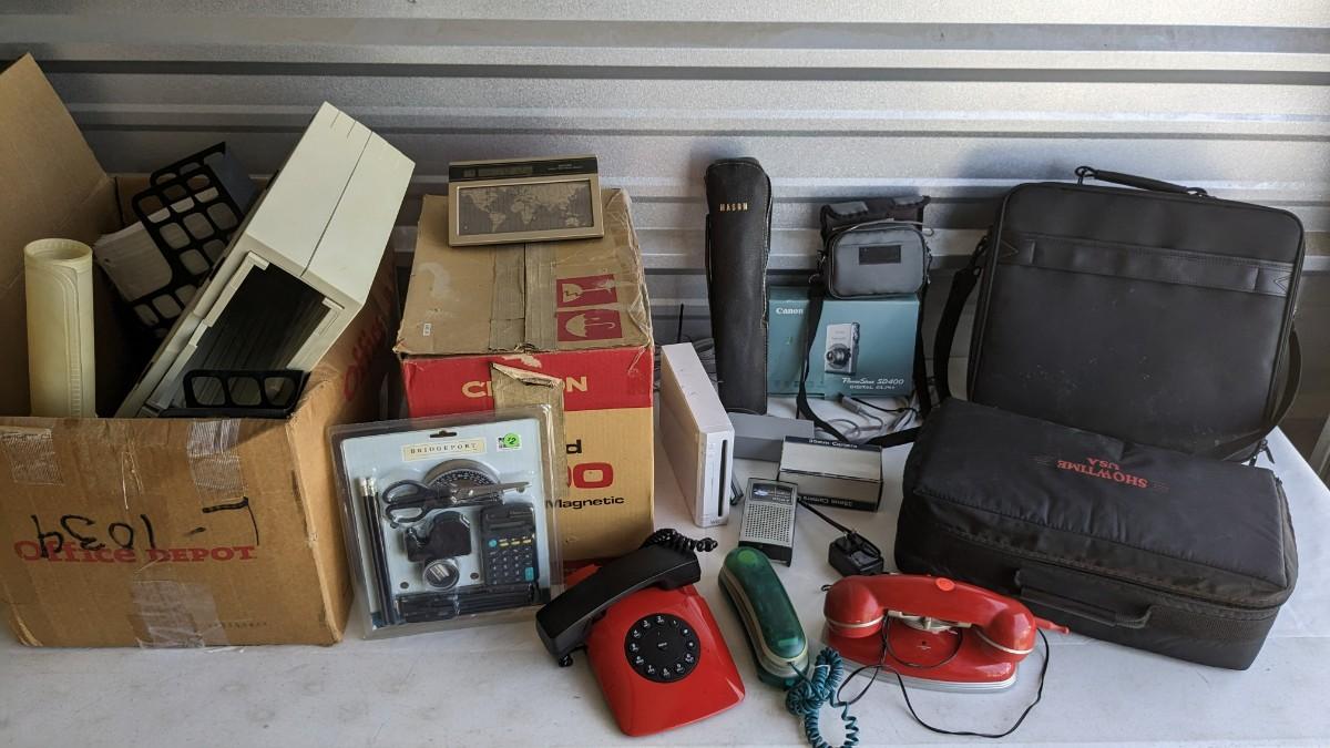 includes Wii w/out controllers, old phones, laptop case, varied office items, cameras, a nice vintage tripod, Playstation 1, and more! all untested. No shipping. 2616